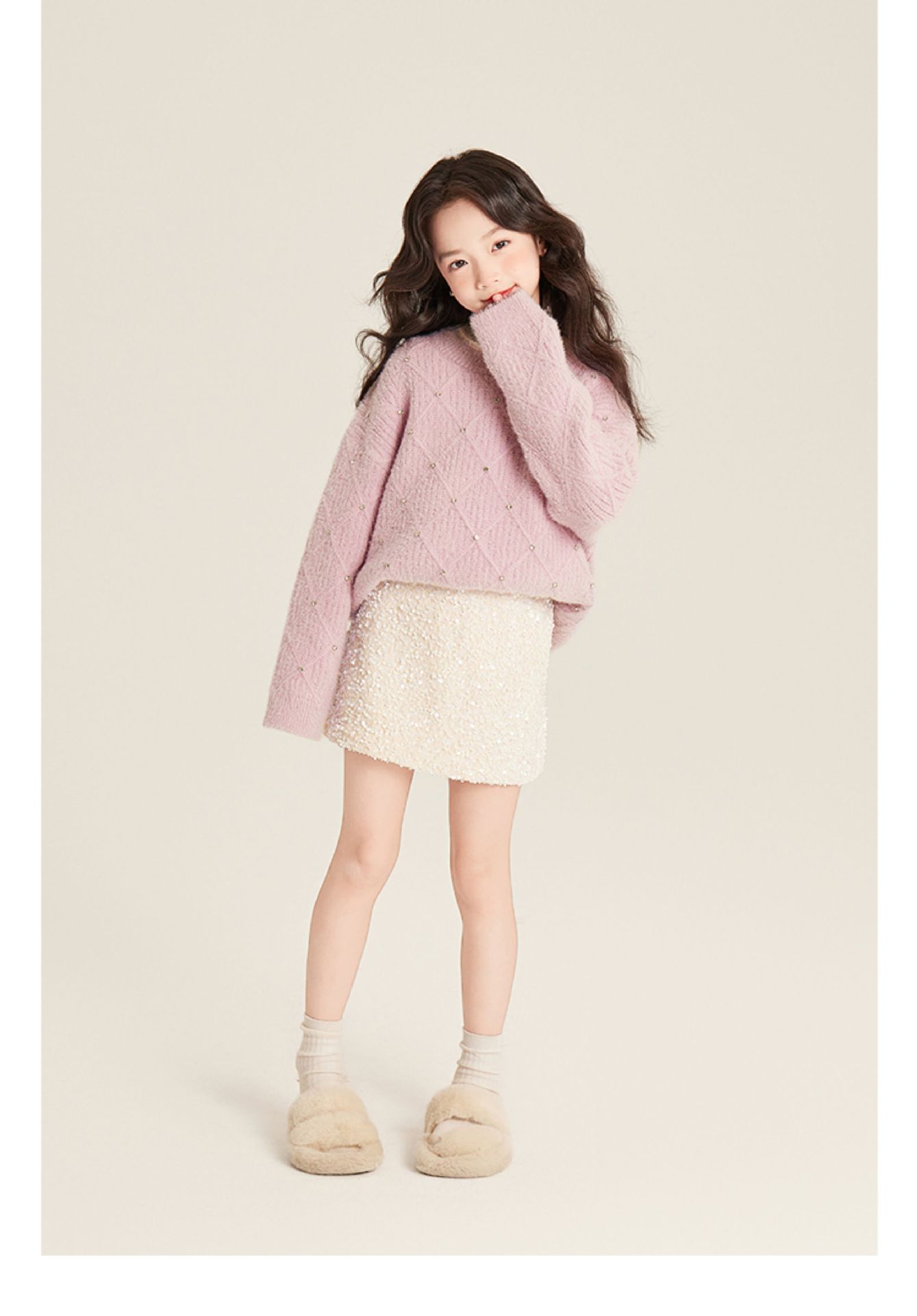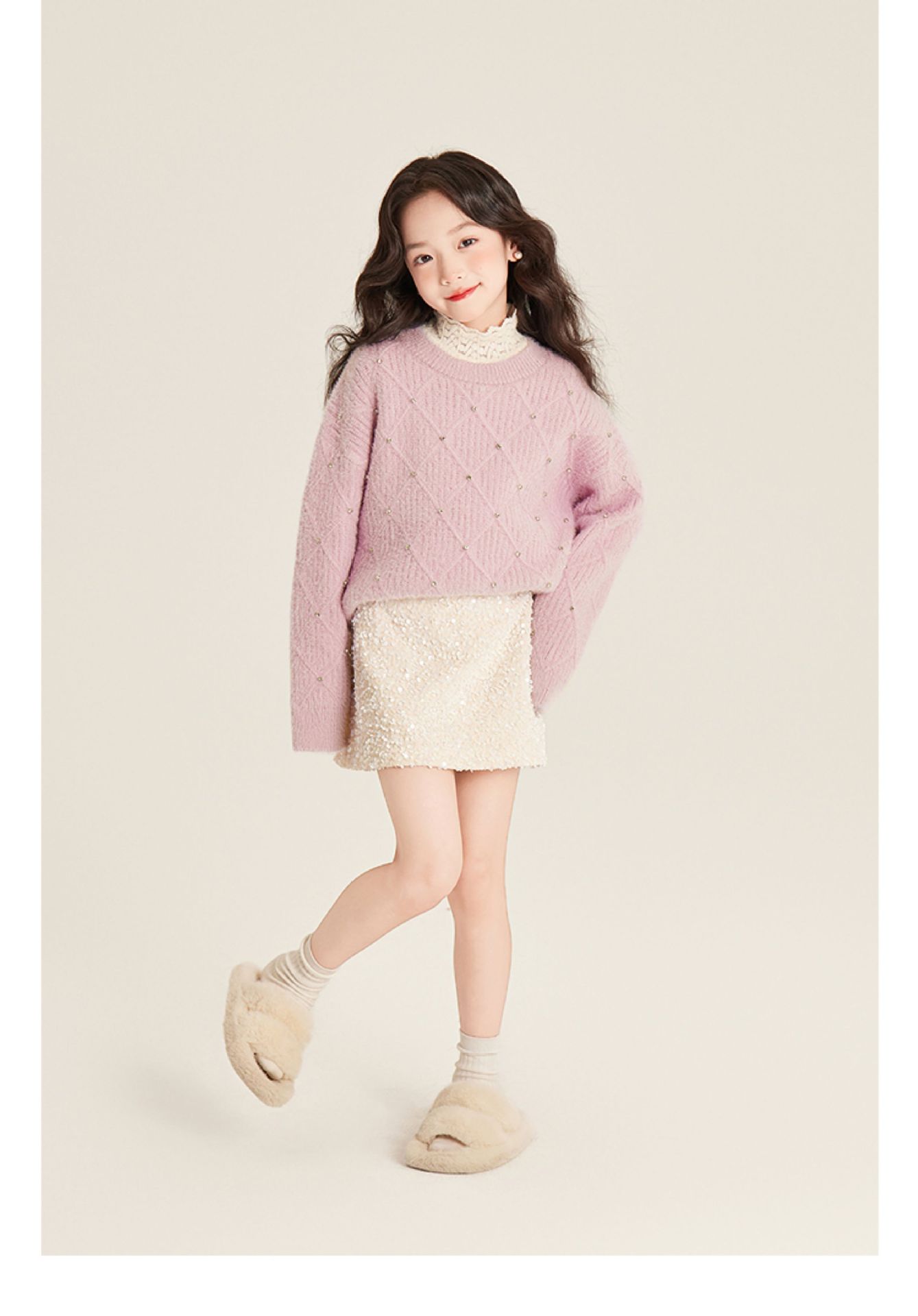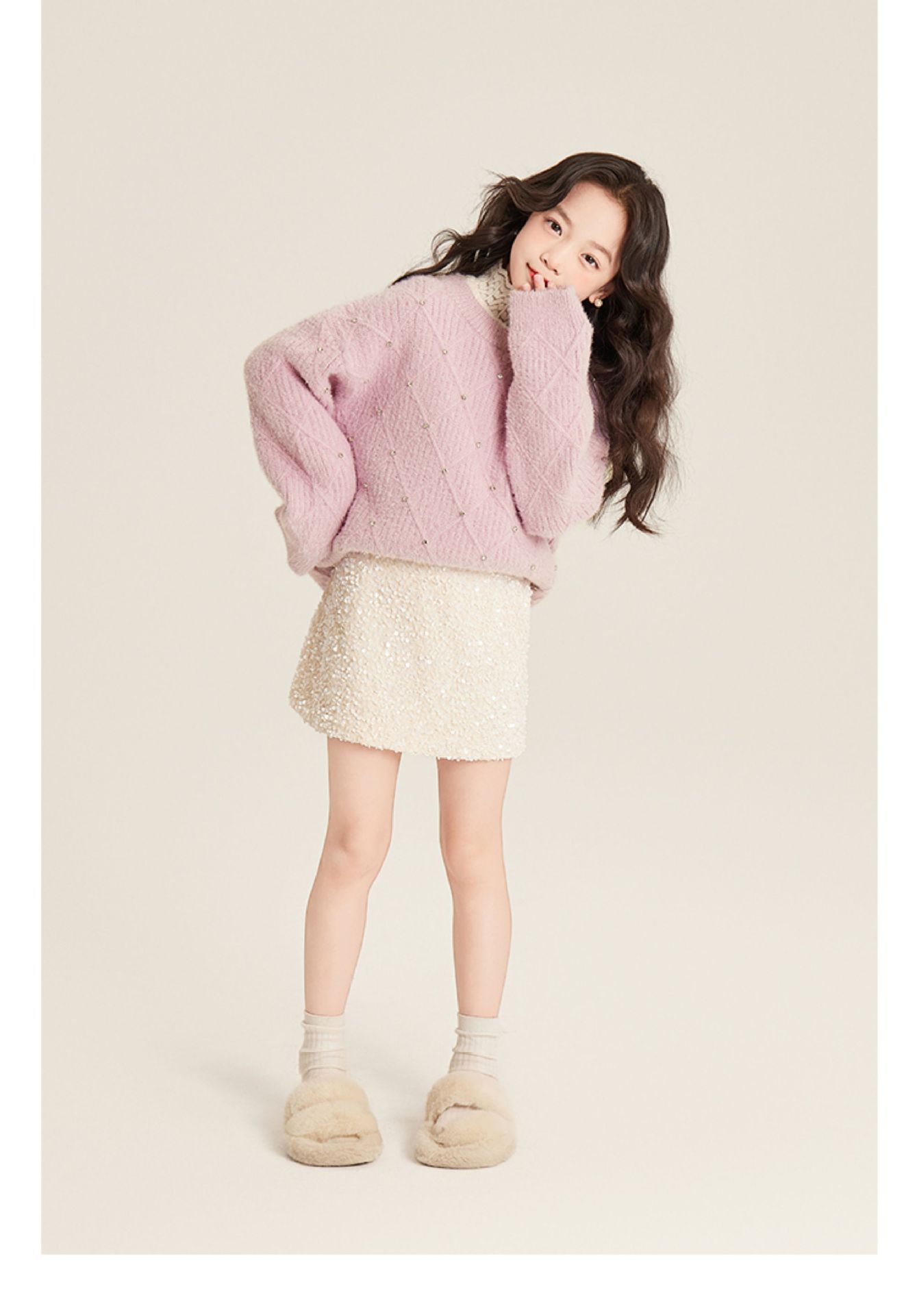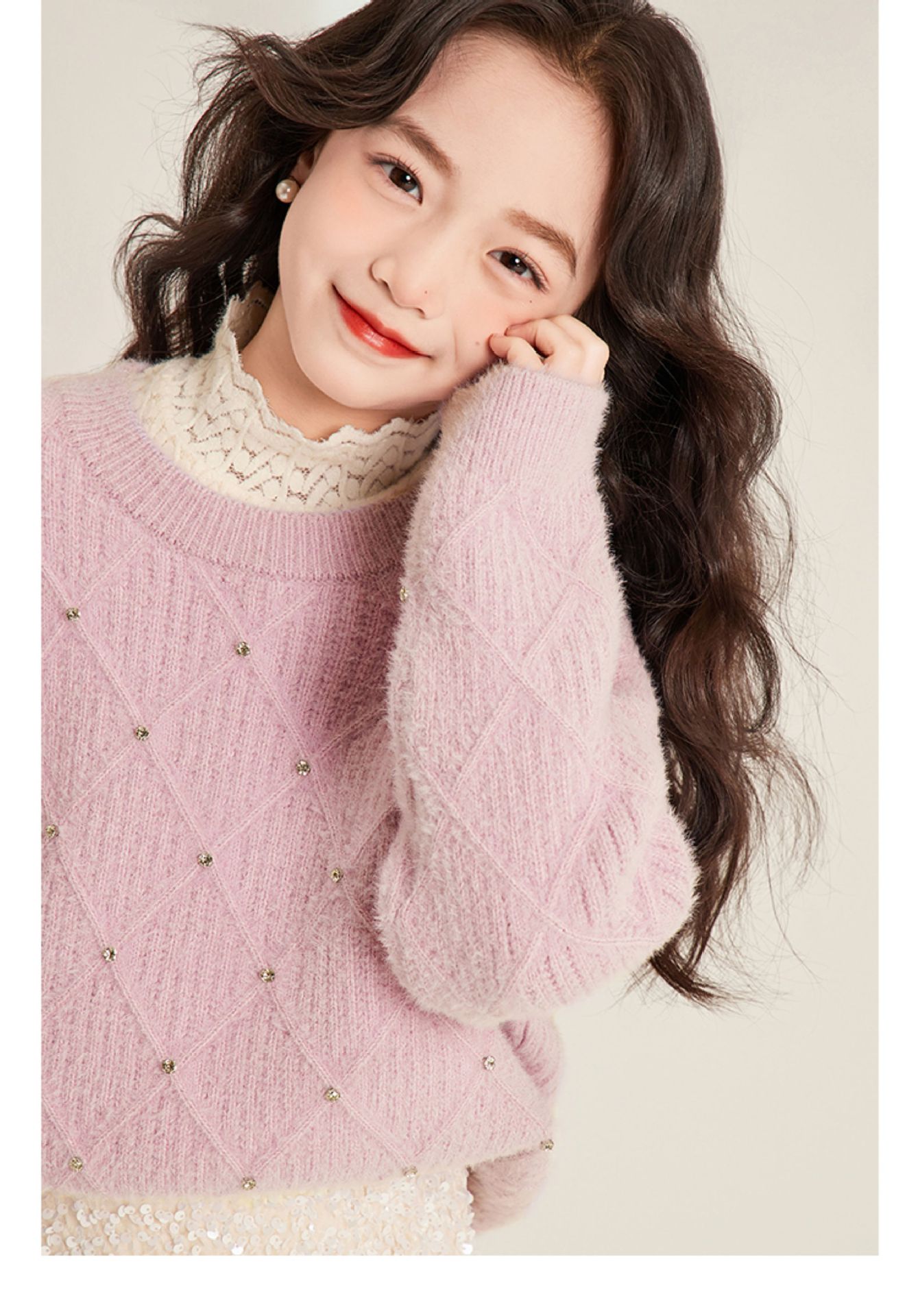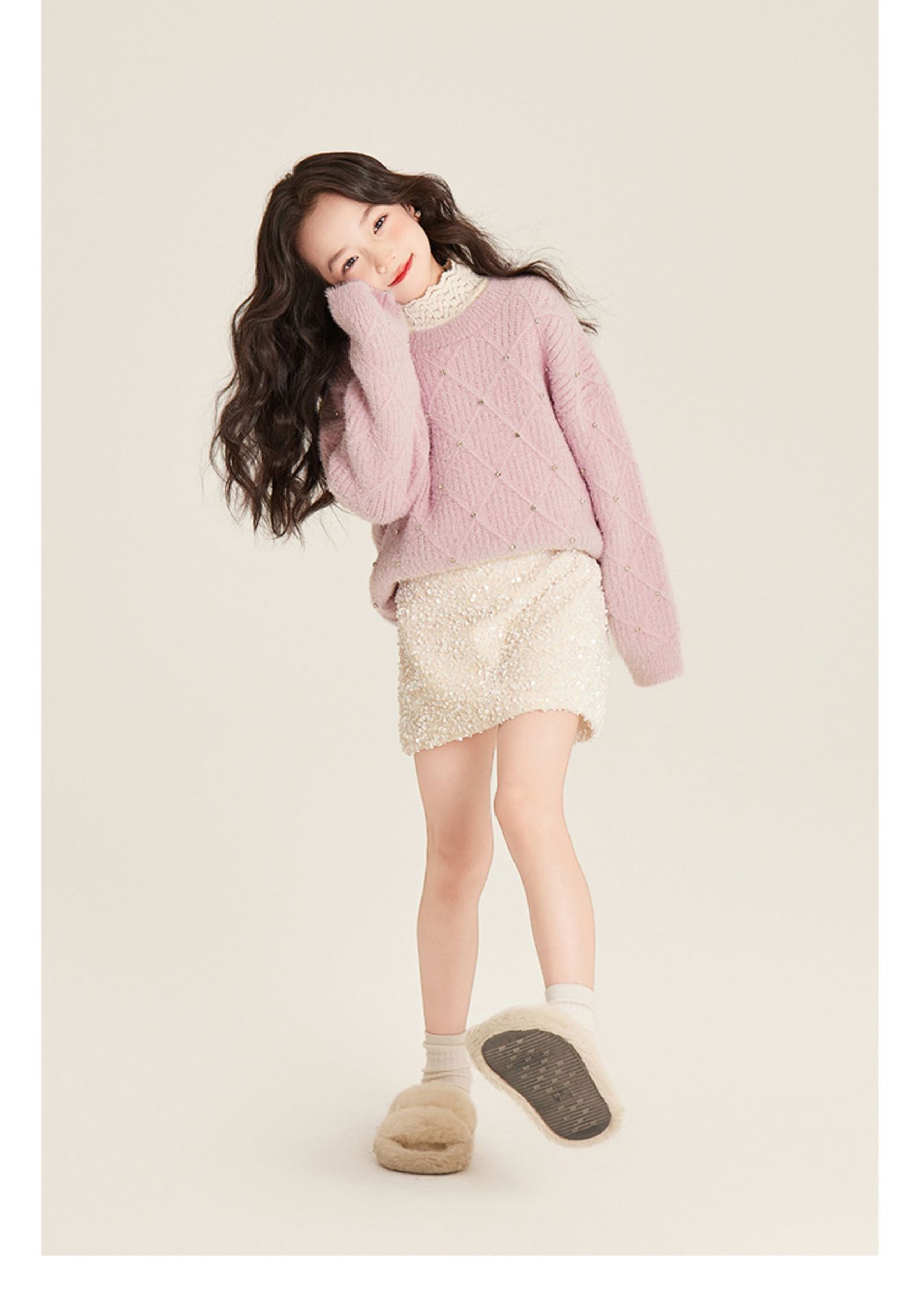 Amybaby Girls 'Top Winter 2024 새로운 캐주얼 소프트 왁스 젠틀 스타일 크루 넥 터틀넥 페이크 투피스 스웨터