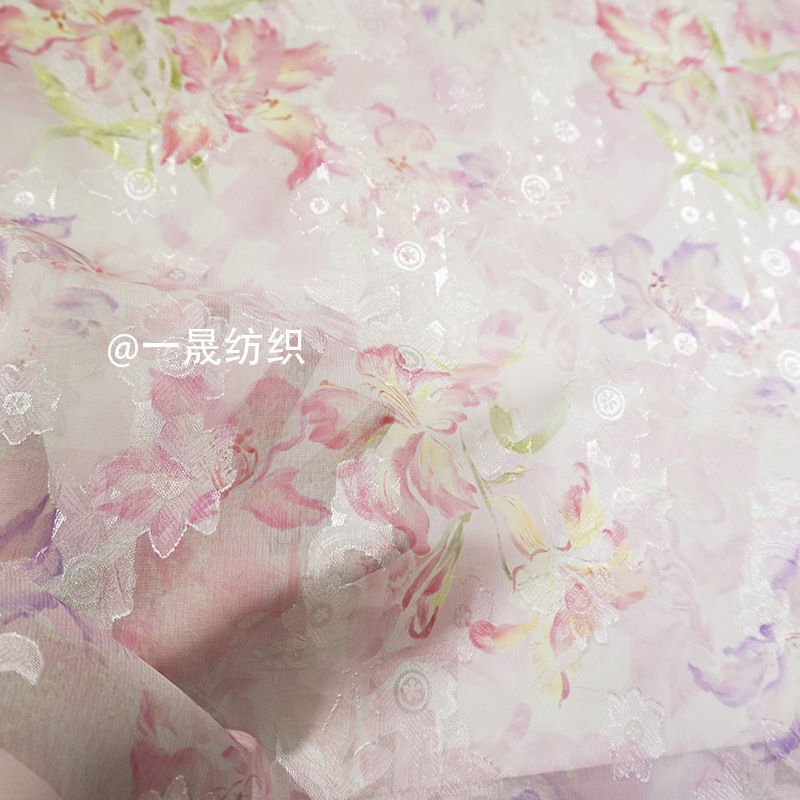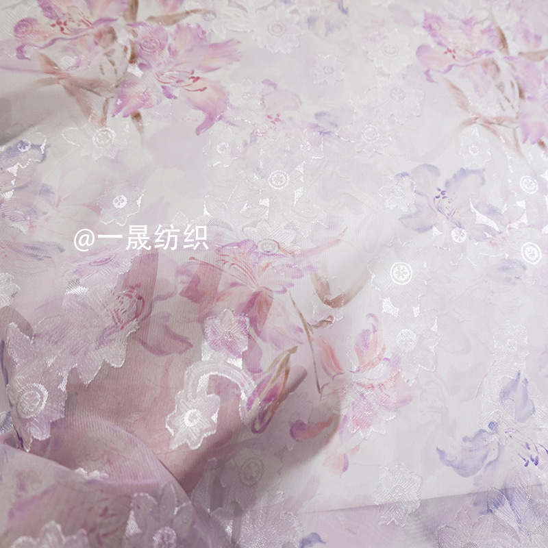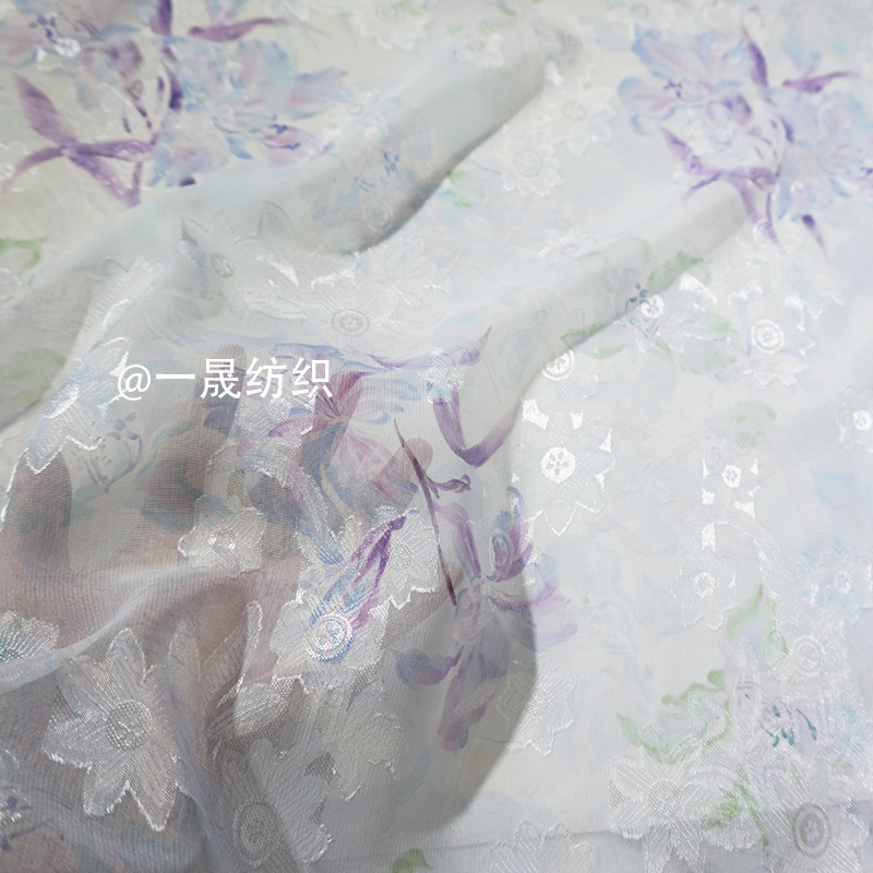 새로운 중국 스타일 아이리스 꽃 컷 쉬폰 인쇄 직물 2025 봄과 여름 새로운 스타일 꽃 부드러운 달콤한 의류 직물