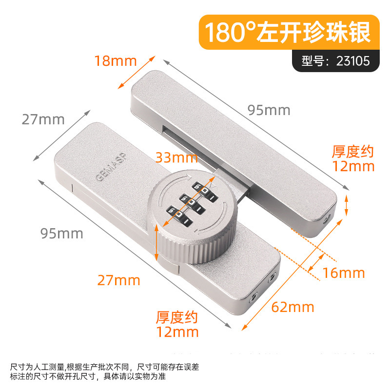 • 숨겨진 구멍 - 왼쪽 개구부 180도 콤비네이션 자물쇠(펄 실버)