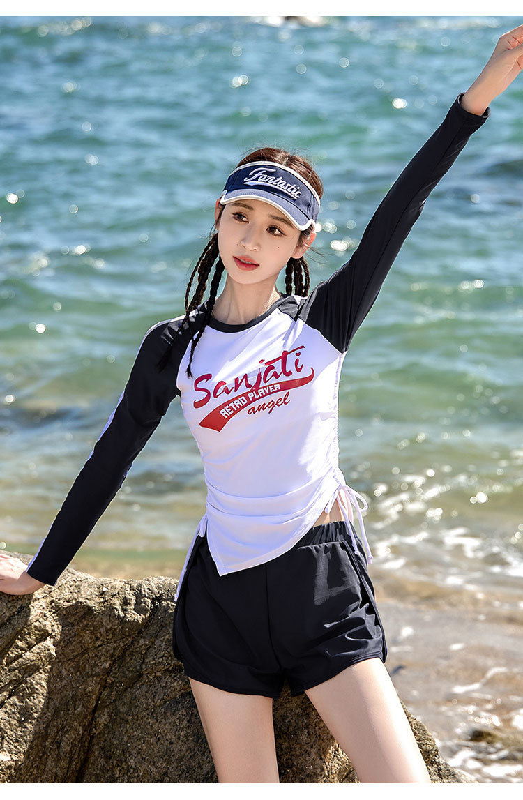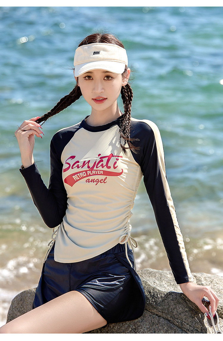 Colorblock 긴팔 선 스크린 분할 수영복 여성용 한국 Ins 하이 엔드 서핑 뚱뚱한 소녀의 육류로 덮인 온천 수영복스토어 가기