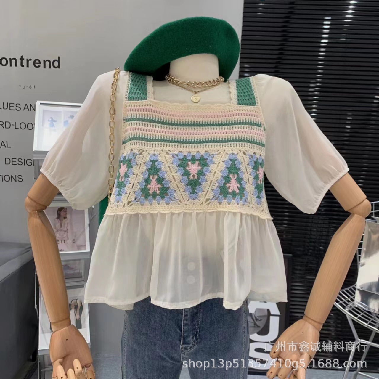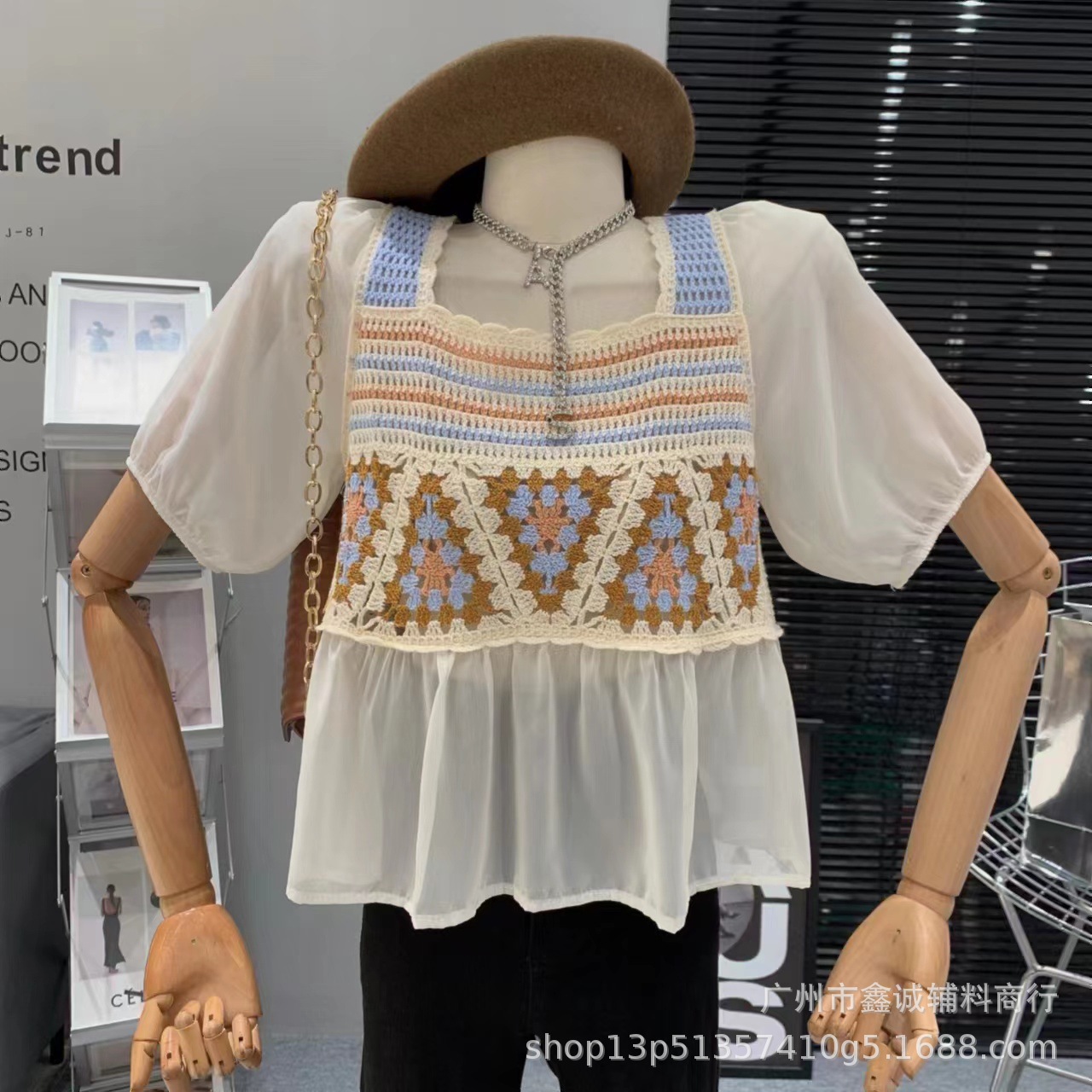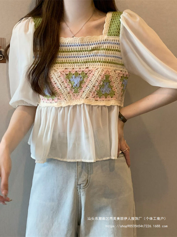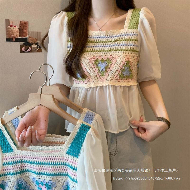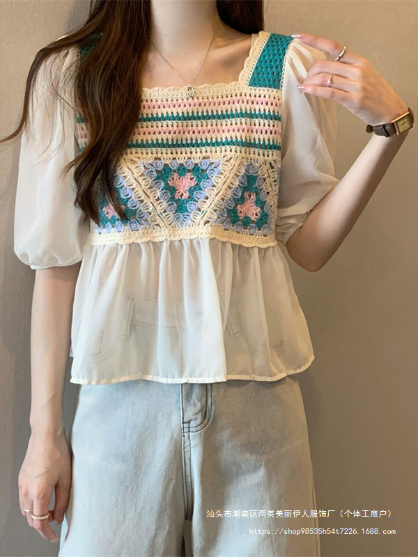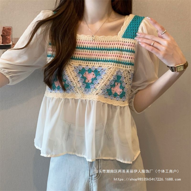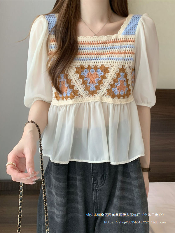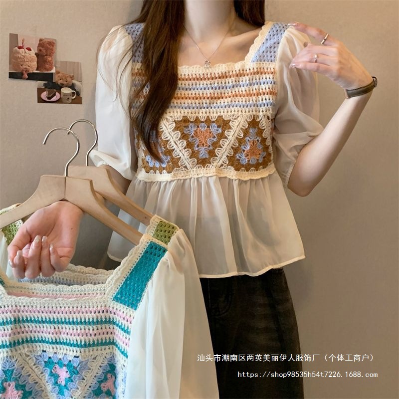 프렌치 할로우 컬러 콘트라스트 스티칭 스퀘어 칼라 반팔 여성 여름 우아한 나이 감소 서양식 틈새 쇼트 탑 쉬폰 셔츠