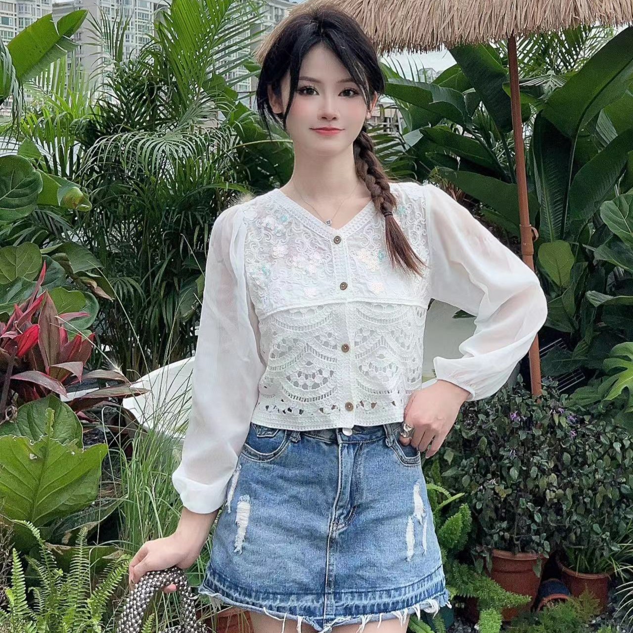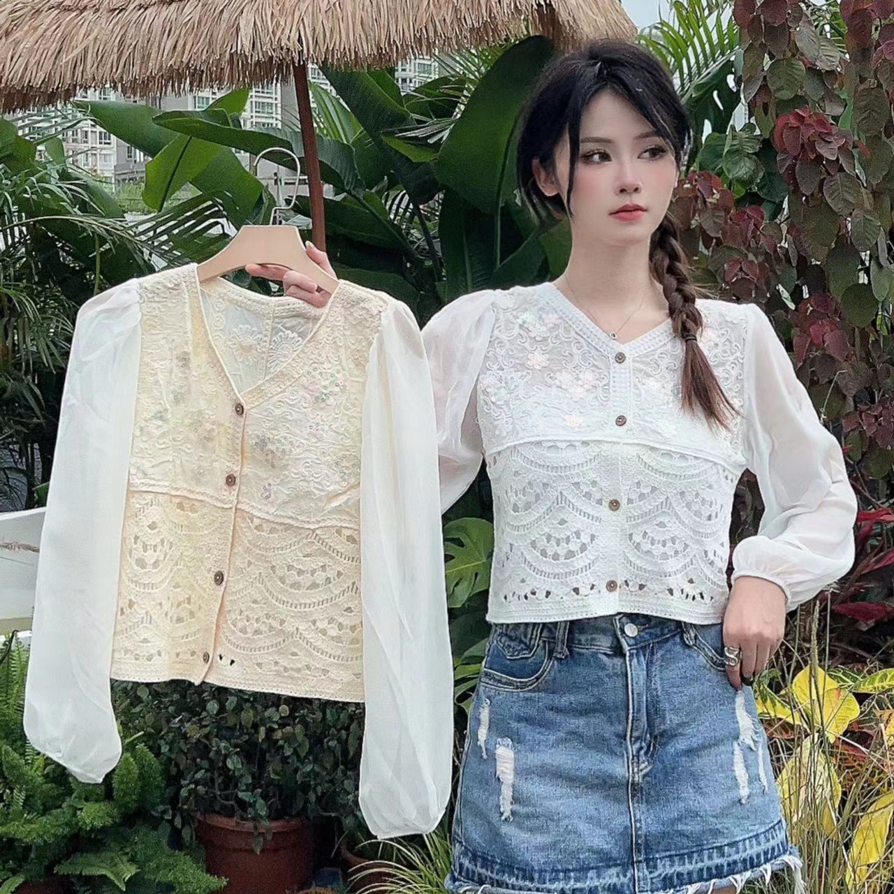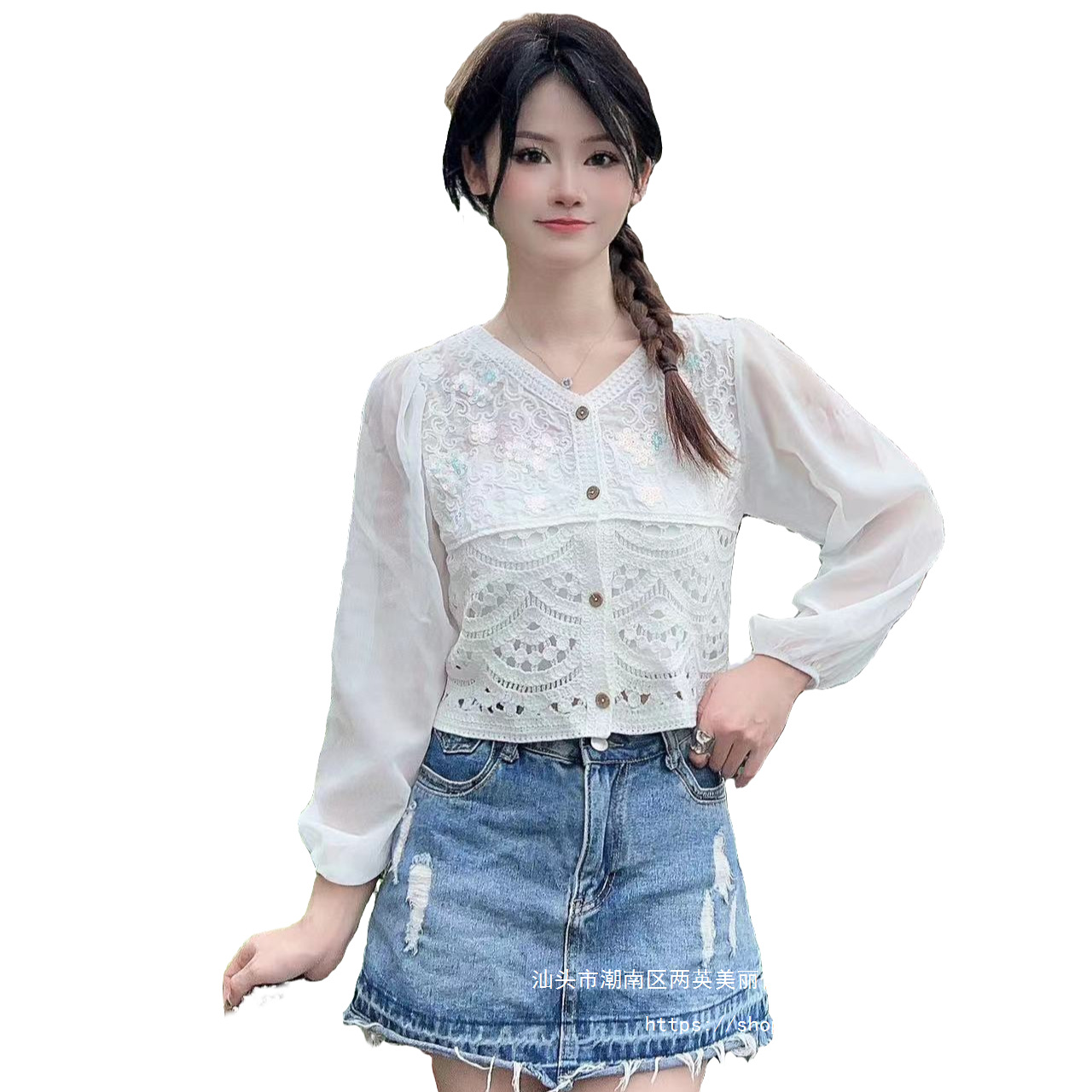 코튼 원사 나이를 줄이는 스티칭 V 넥 쉬폰 셔츠 긴팔 레이스 셔츠 민족 스타일 니트 스위트 랜턴 슬리브 탑스토어 가기