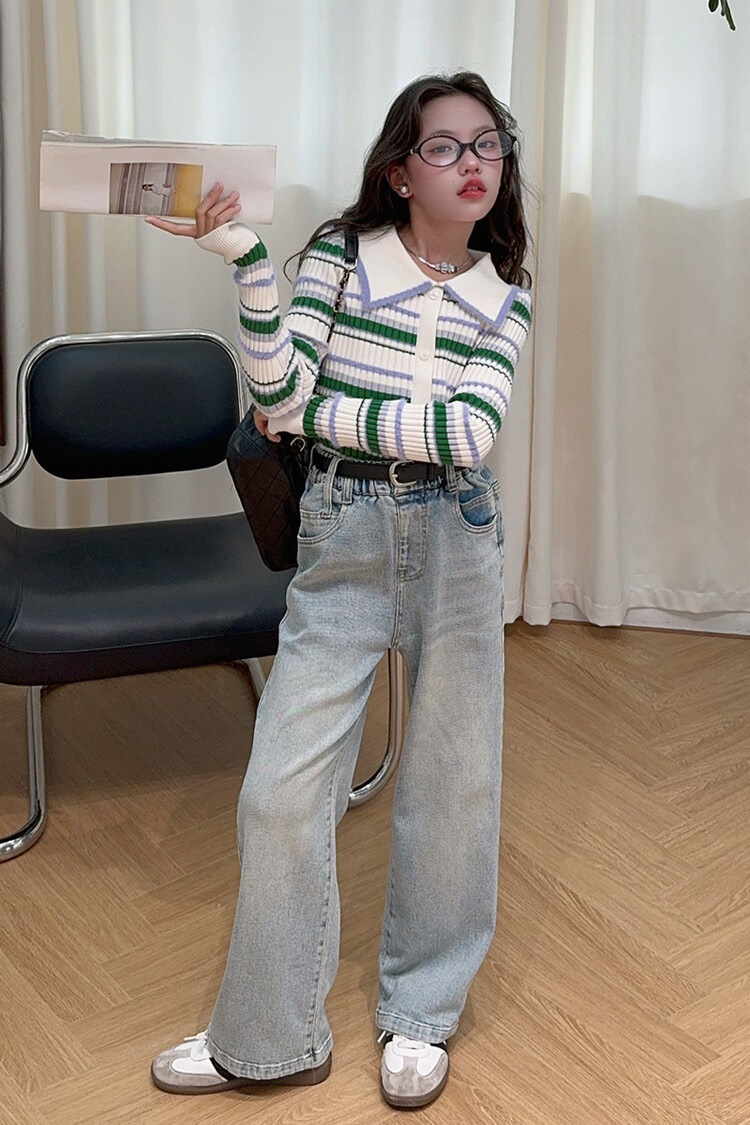 소녀 2025 줄무늬 짧은 달콤한 폴로 칼라 니트웨어 초가을 및 겨울 스웨터베이스 셔츠 청바지