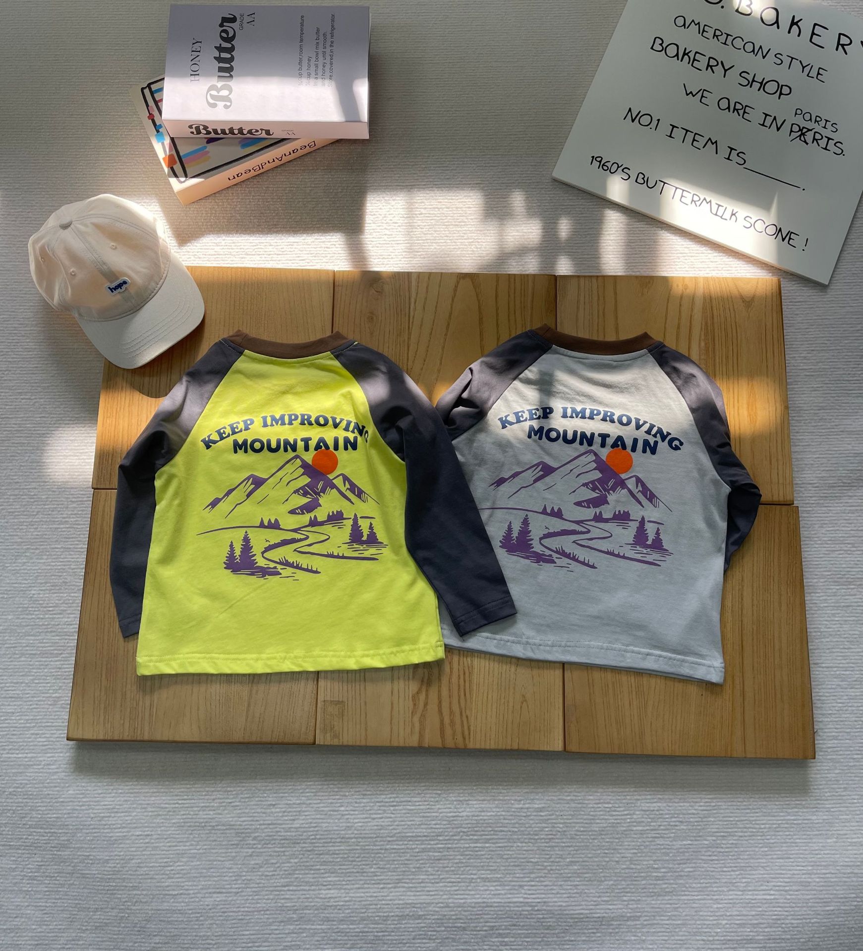 2025 어린이 봄 새로운 야외 산악 캠핑 스타일 대조 컬러 캐주얼 라글란 소매 대형 어린이를위한 긴팔 티셔츠