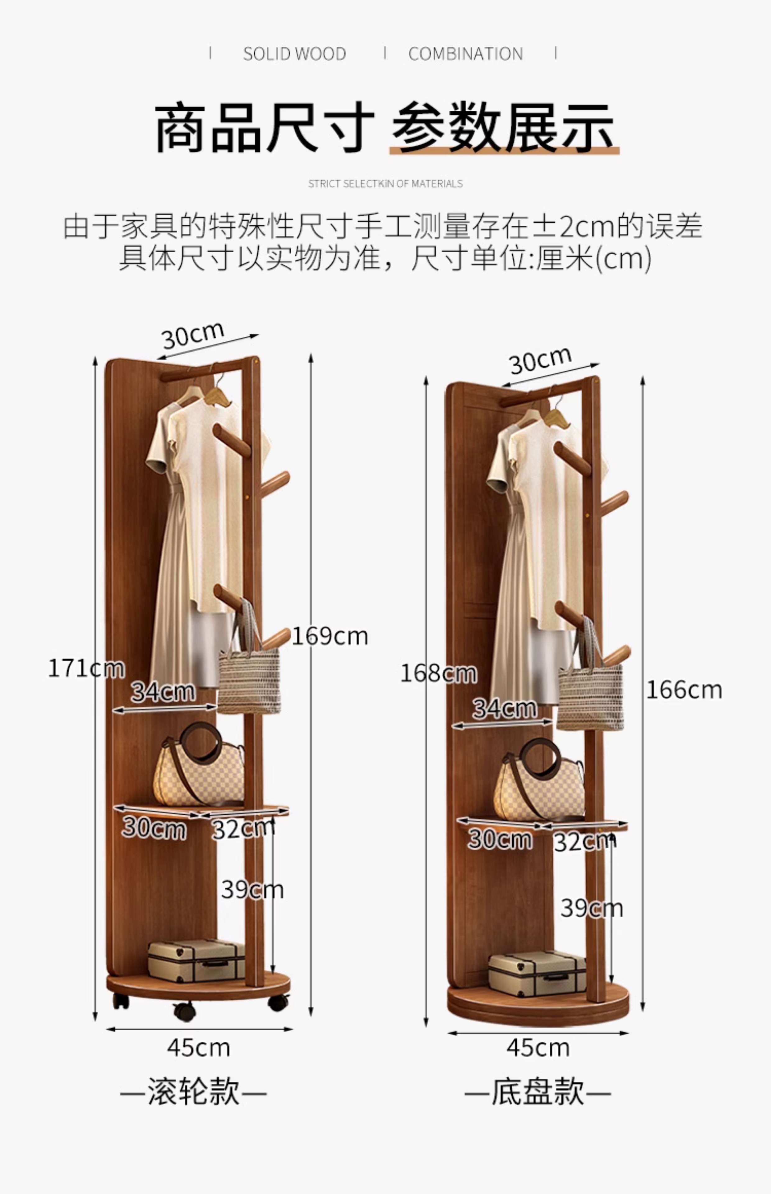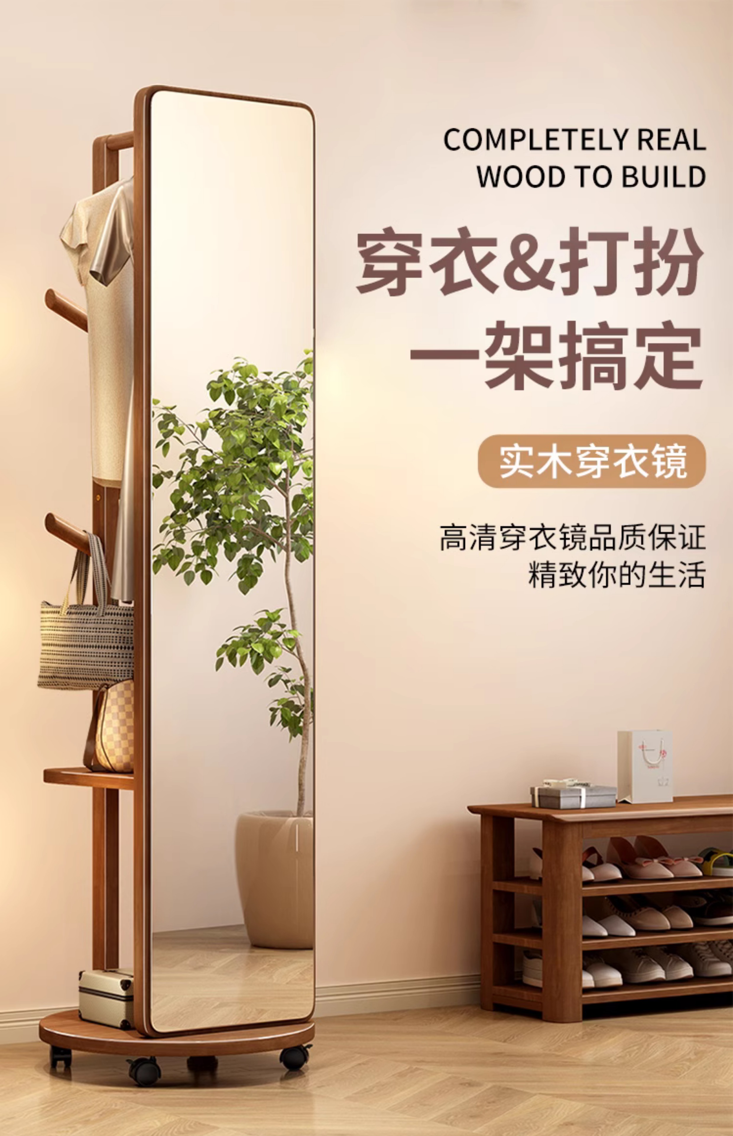외투와 후드 기능이있는 거울 통합 모바일 코트 랙 걸이 침실 이끼 다기능 솔리드 우드 옷걸이