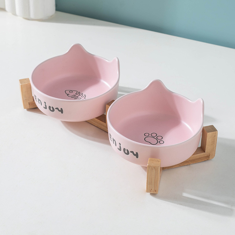 • .✷◈♤♤◈✷고양이 귀 핑크 고양이 발톱 싱글 그릇 + 싱글 그리드 나무 스탠드✷◈♤♤◈✷