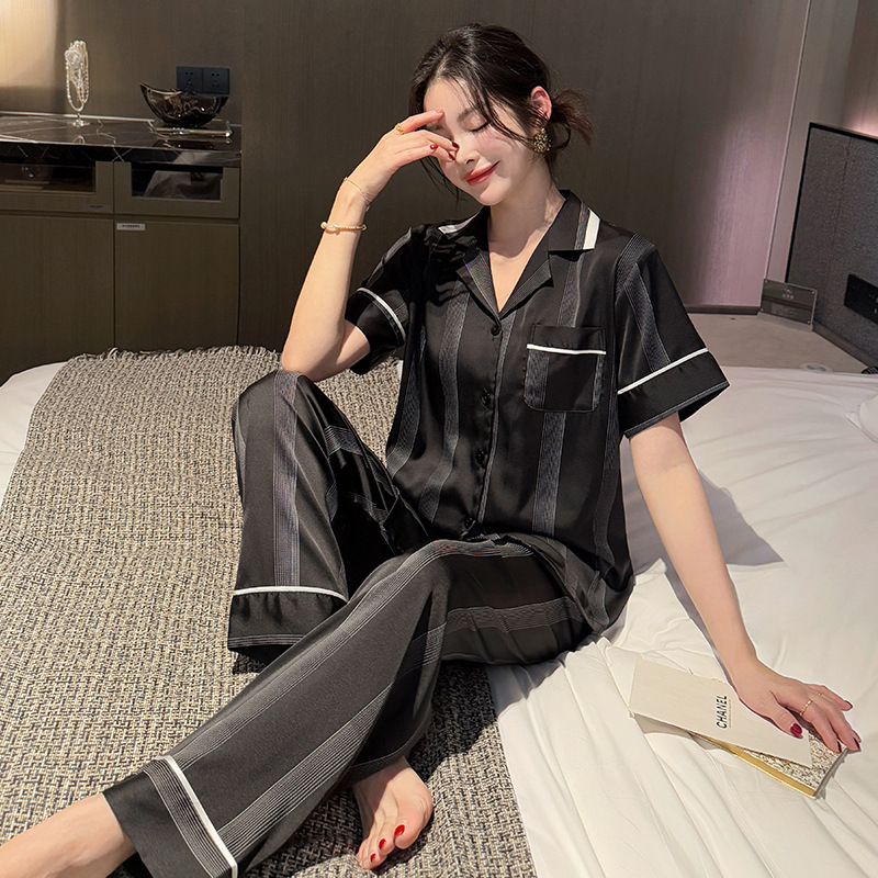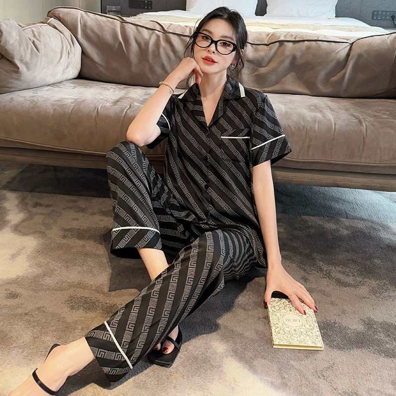 소스 공장 제품 2025 연인 아이스 실크 잠옷 여성 봄과 가을 짧은 소매 플러스 사이즈 옷깃 카디건 세트 그물 레드 라이브스토어 가기