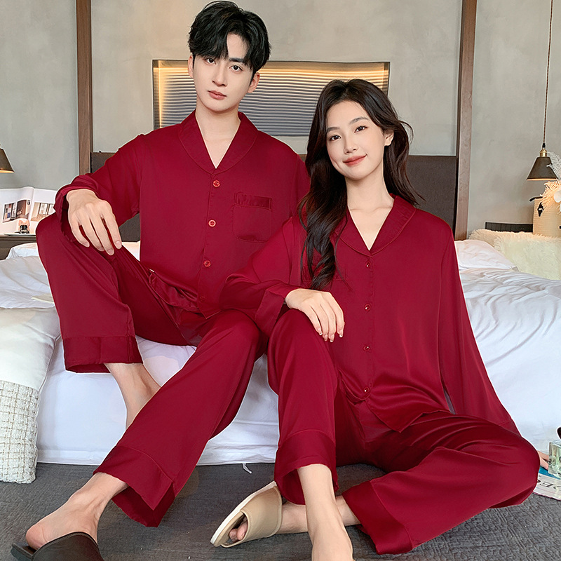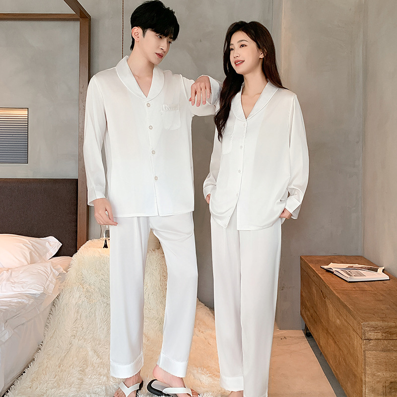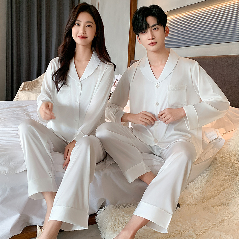 흰색 커플 잠옷 여성의 봄과 가을 얼음 실크 긴 소매 얇은 모조 실크 홈 옷 남자의 봄과 여름 세트스토어 가기