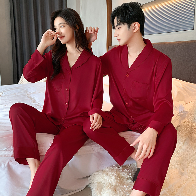 흰색 커플 잠옷 여성의 봄과 가을 얼음 실크 긴 소매 얇은 모조 실크 홈 옷 남자의 봄과 여름 세트
