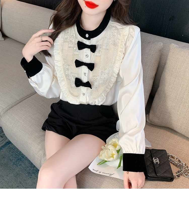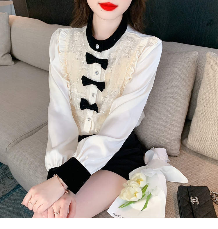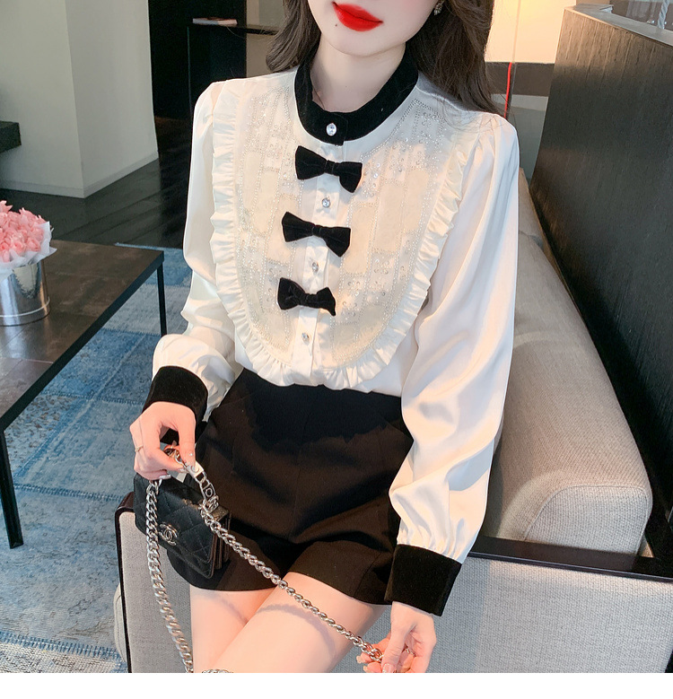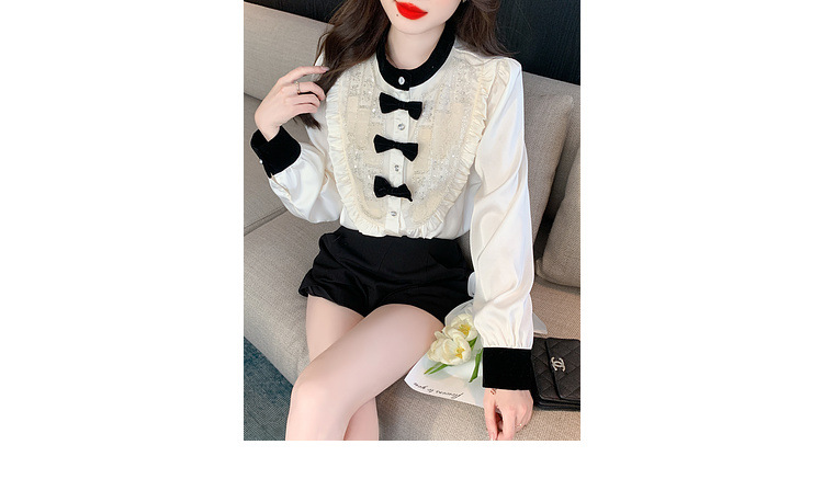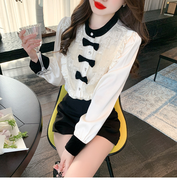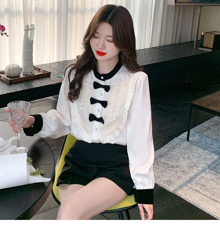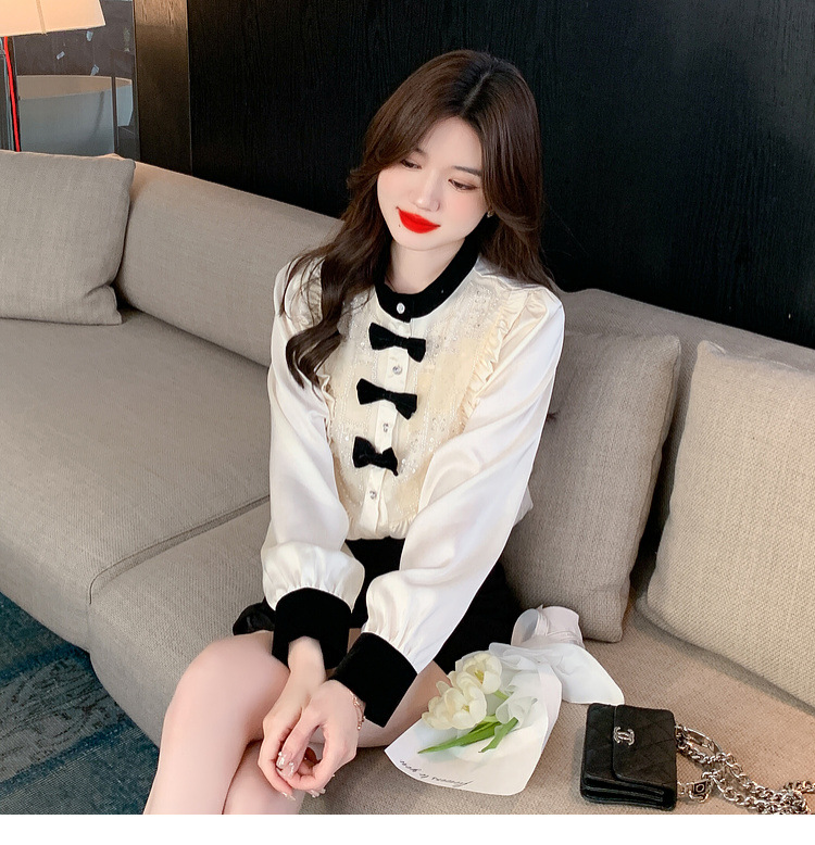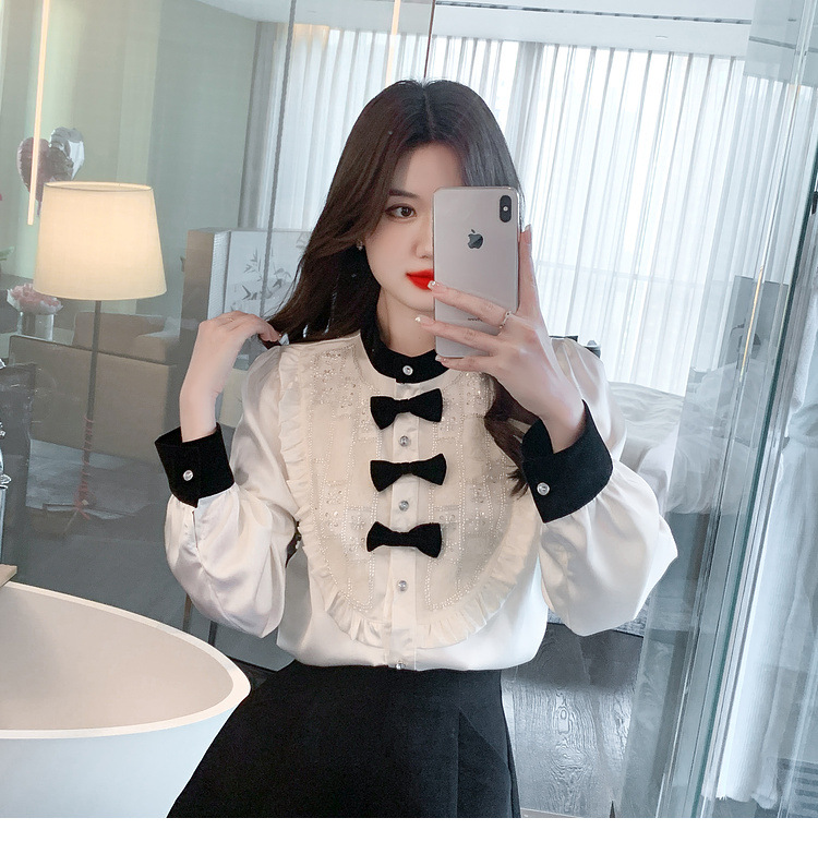 프랑스 중공업 3 차원 핫 드릴링 스퀸 보우 셔츠 여성용 컬러 접합 샤넬 스타일 러플 카디건 우아하고 우아한