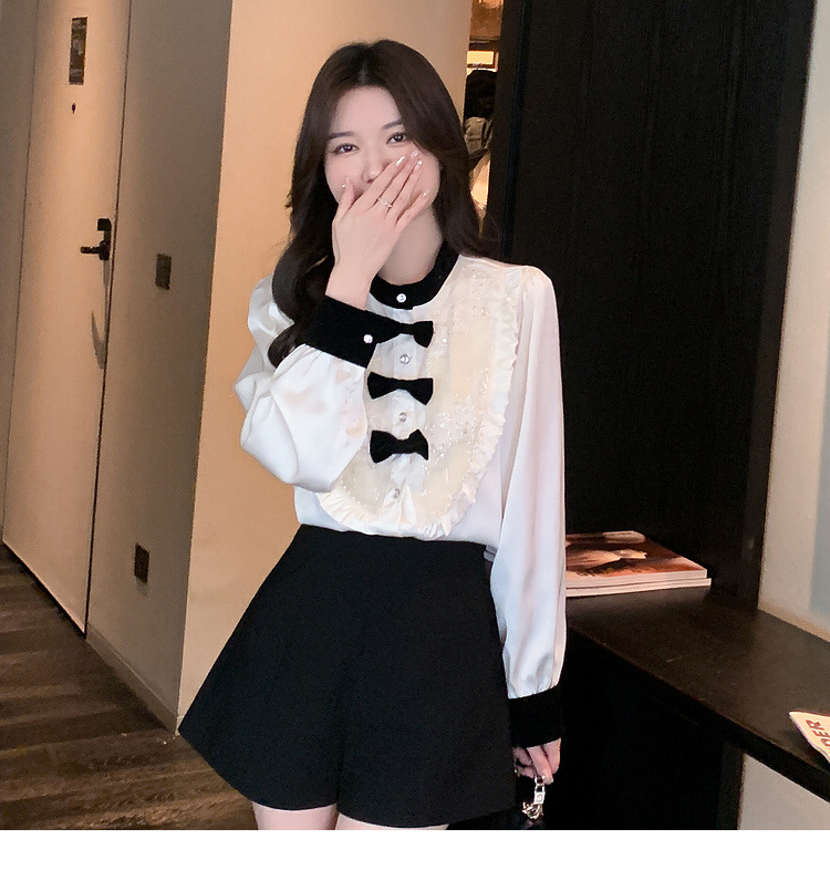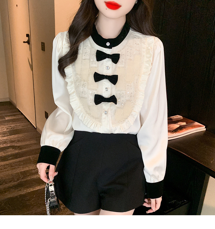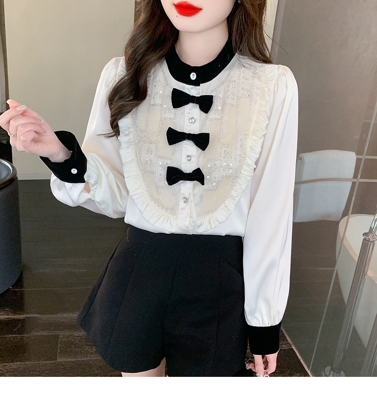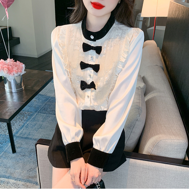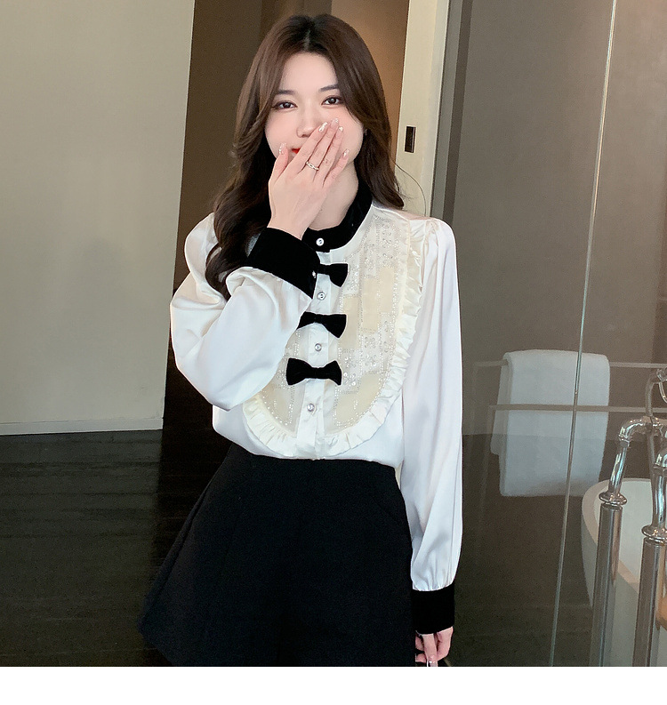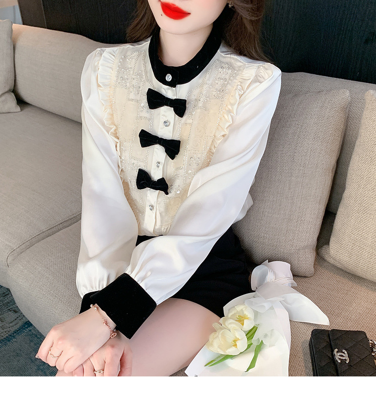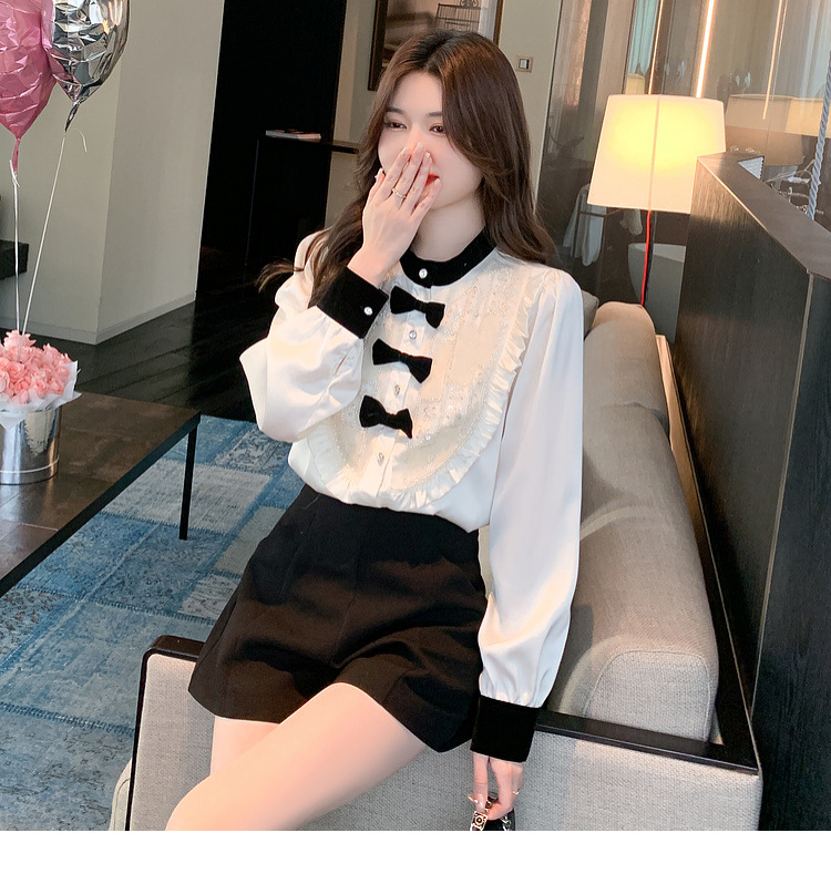 프랑스 중공업 3 차원 핫 드릴링 스퀸 보우 셔츠 여성용 컬러 접합 샤넬 스타일 러플 카디건 우아하고 우아한