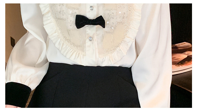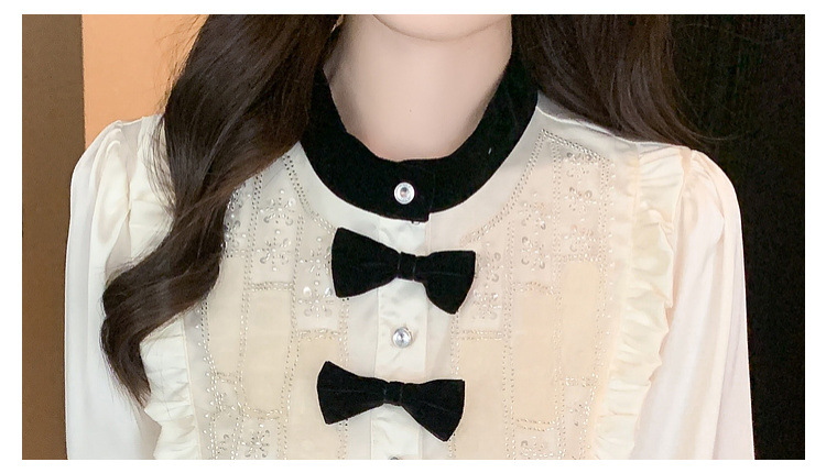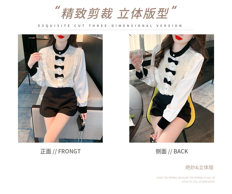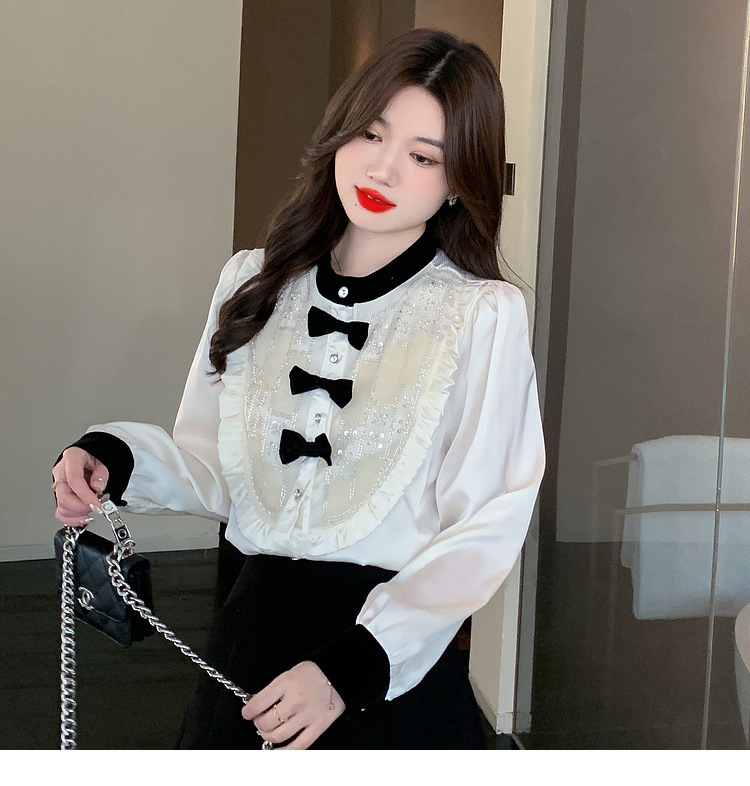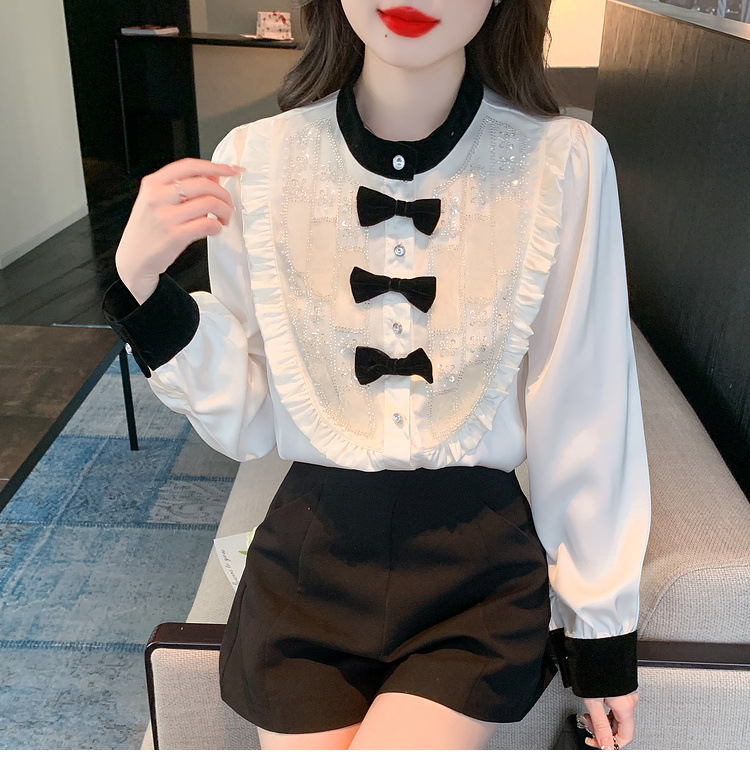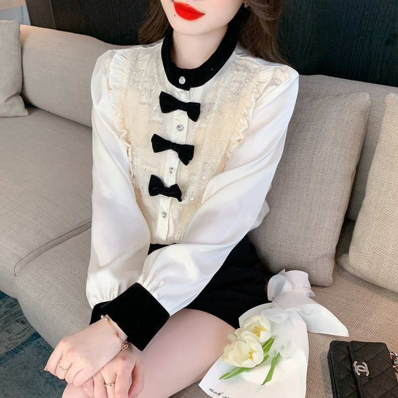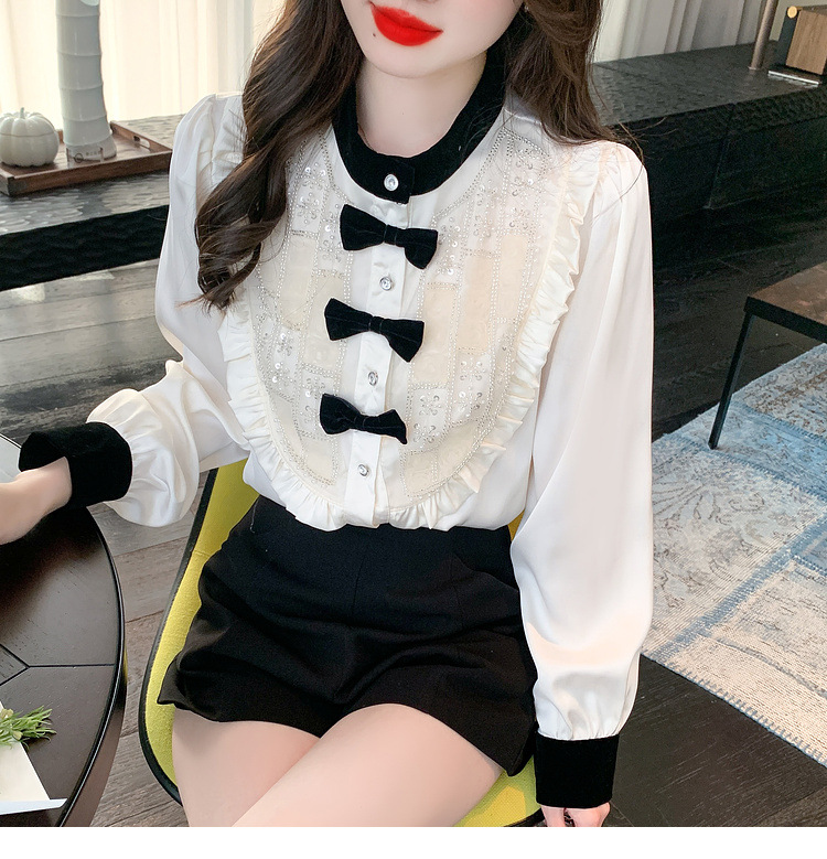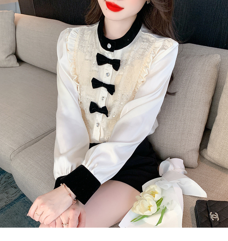 프랑스 중공업 3 차원 핫 드릴링 스퀸 보우 셔츠 여성용 컬러 접합 샤넬 스타일 러플 카디건 우아하고 우아한