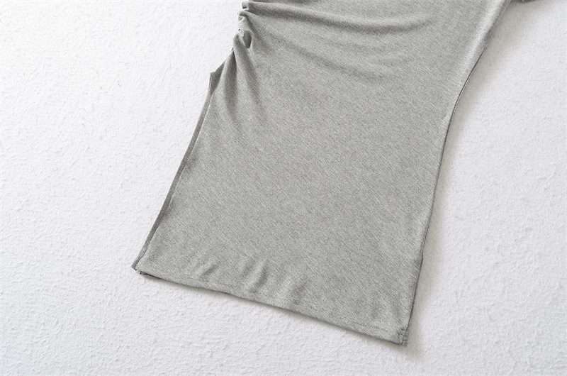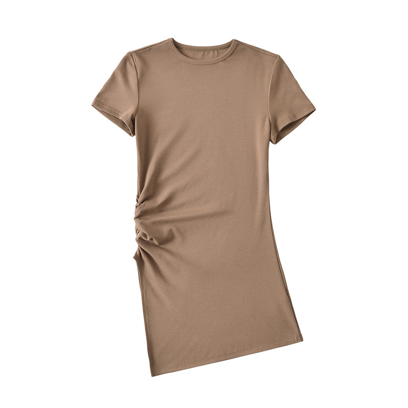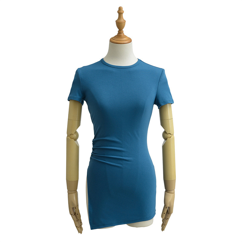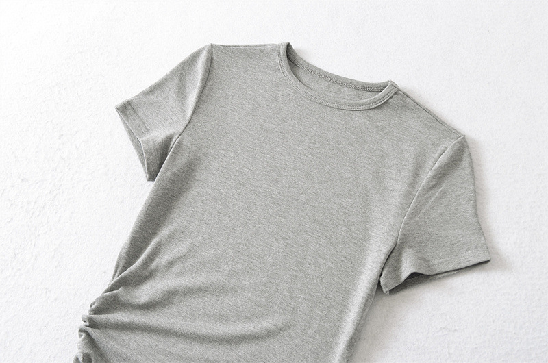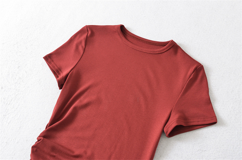 디자인 사이드 슬릿 플리츠 허리 라운드 넥 반팔 티셔츠 여름 슬림 솔리드 컬러 여성용 중간 길이 탑스토어 가기