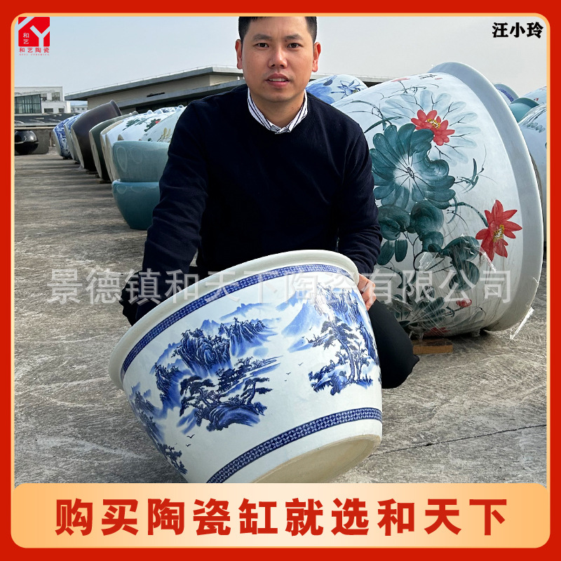 안뜰 그릇 연꽃 냄비 탱크 야외 초대형 나무 화분 탱크 1 m 물 연꽃 냄비 탱크 파란색과 흰색 세라믹 물 탱크스토어 가기