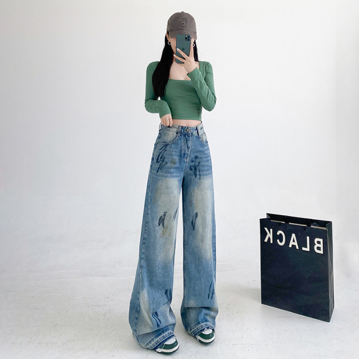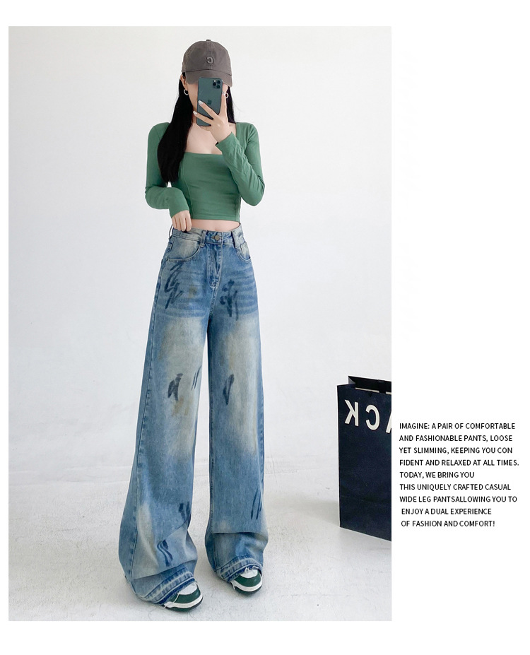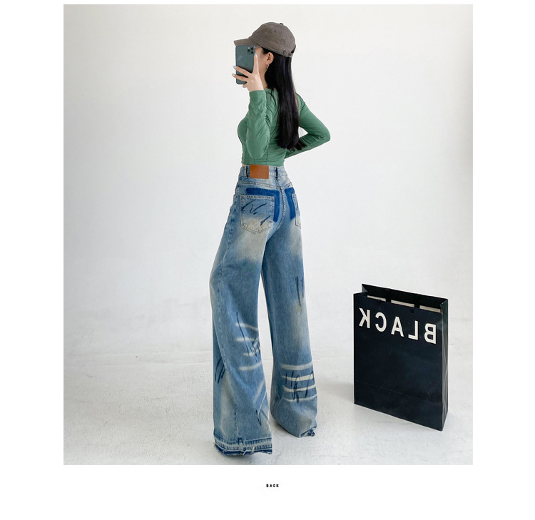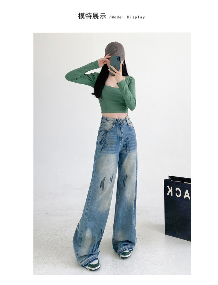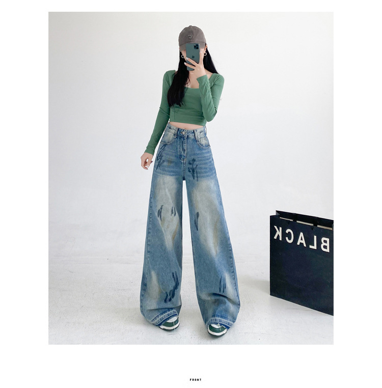 미국 낙서 넓은 다리 청바지 여성의 2025 봄 새로운 높은 허리 느슨한 패션 캐주얼 스트레이트 바지