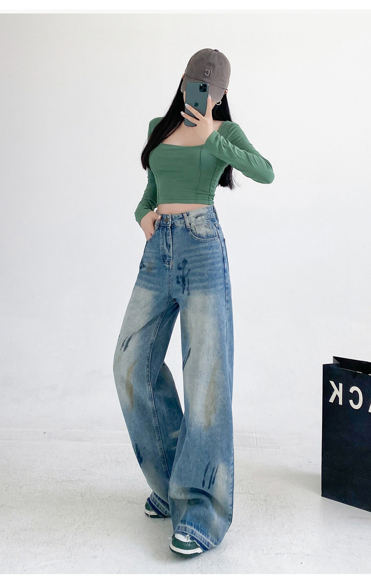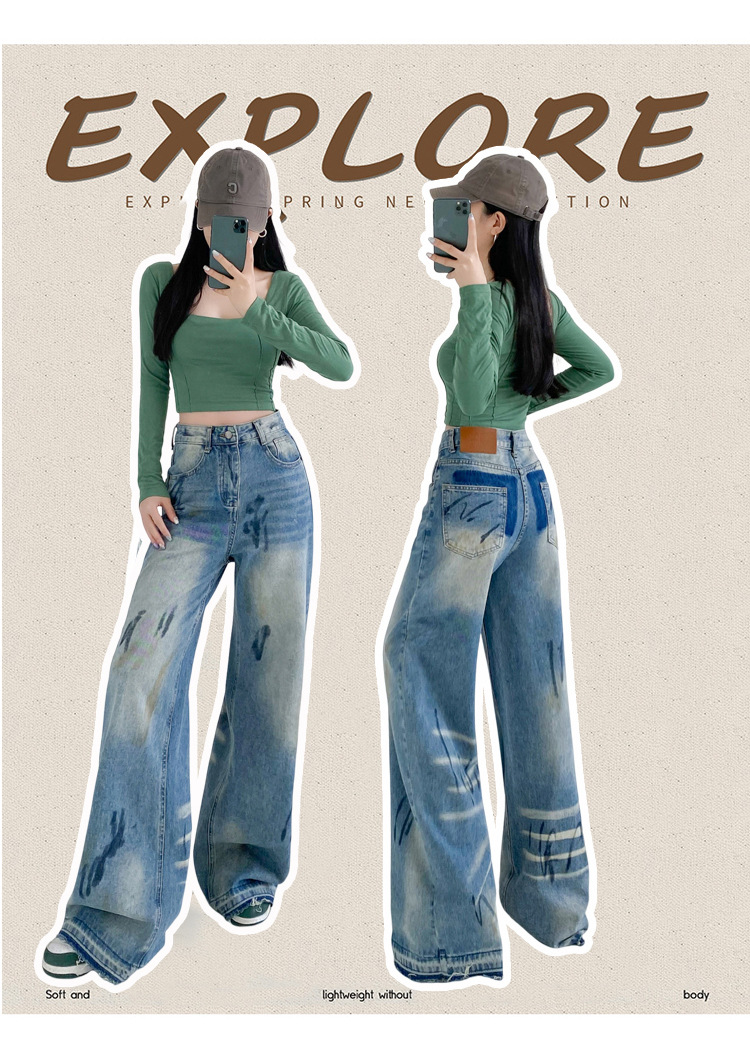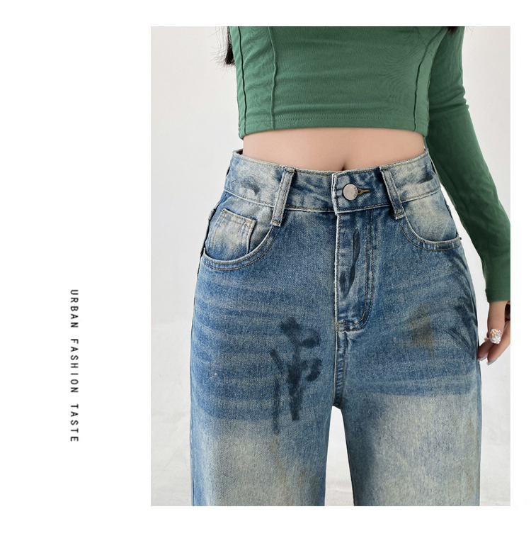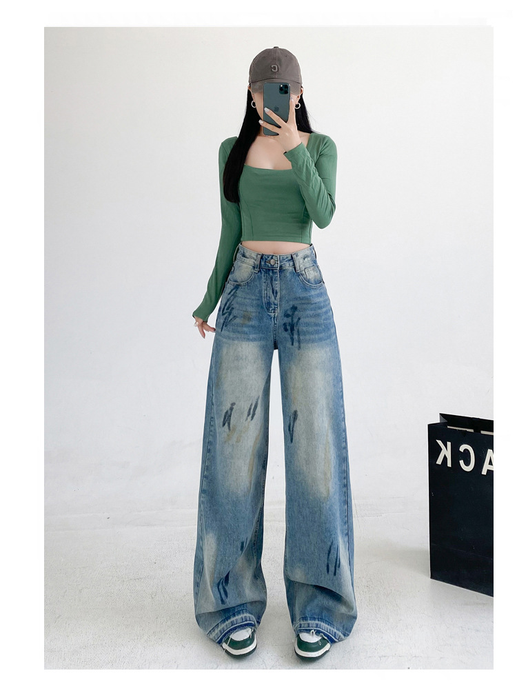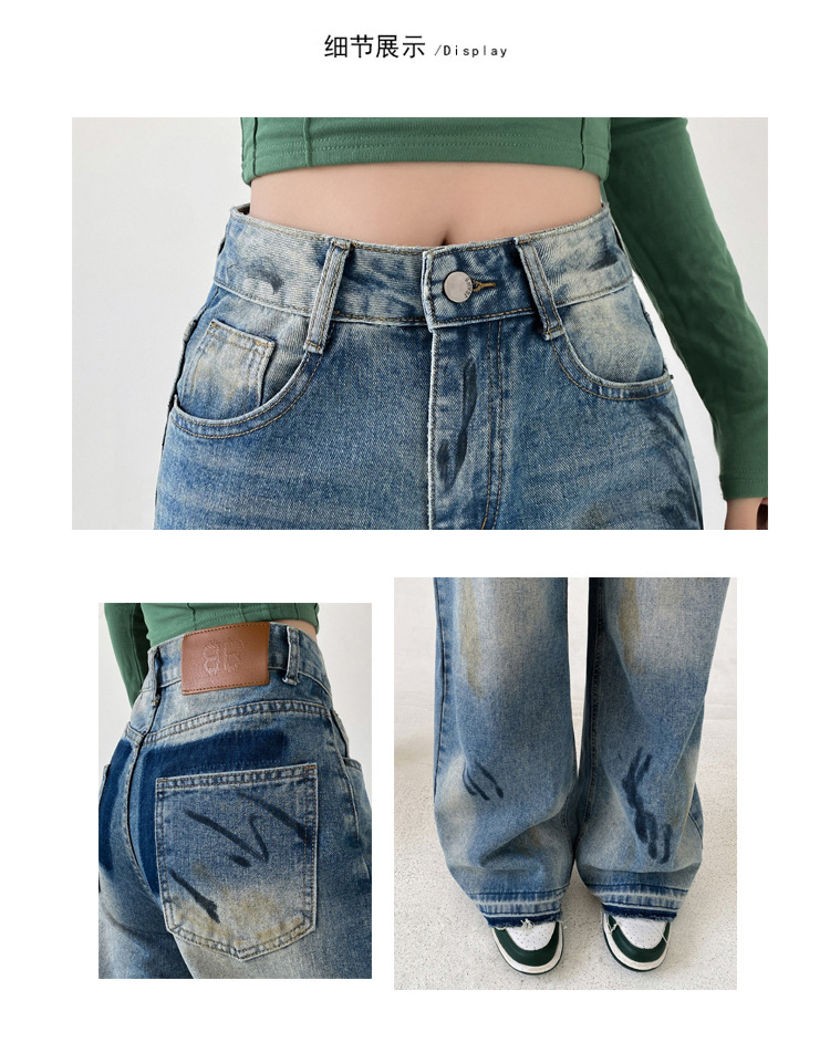 미국 낙서 넓은 다리 청바지 여성의 2025 봄 새로운 높은 허리 느슨한 패션 캐주얼 스트레이트 바지
