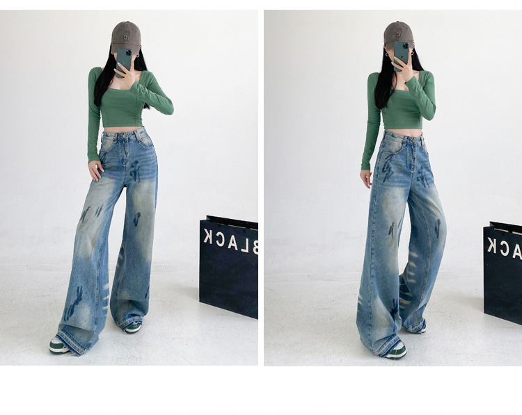 미국 낙서 넓은 다리 청바지 여성의 2025 봄 새로운 높은 허리 느슨한 패션 캐주얼 스트레이트 바지스토어 가기