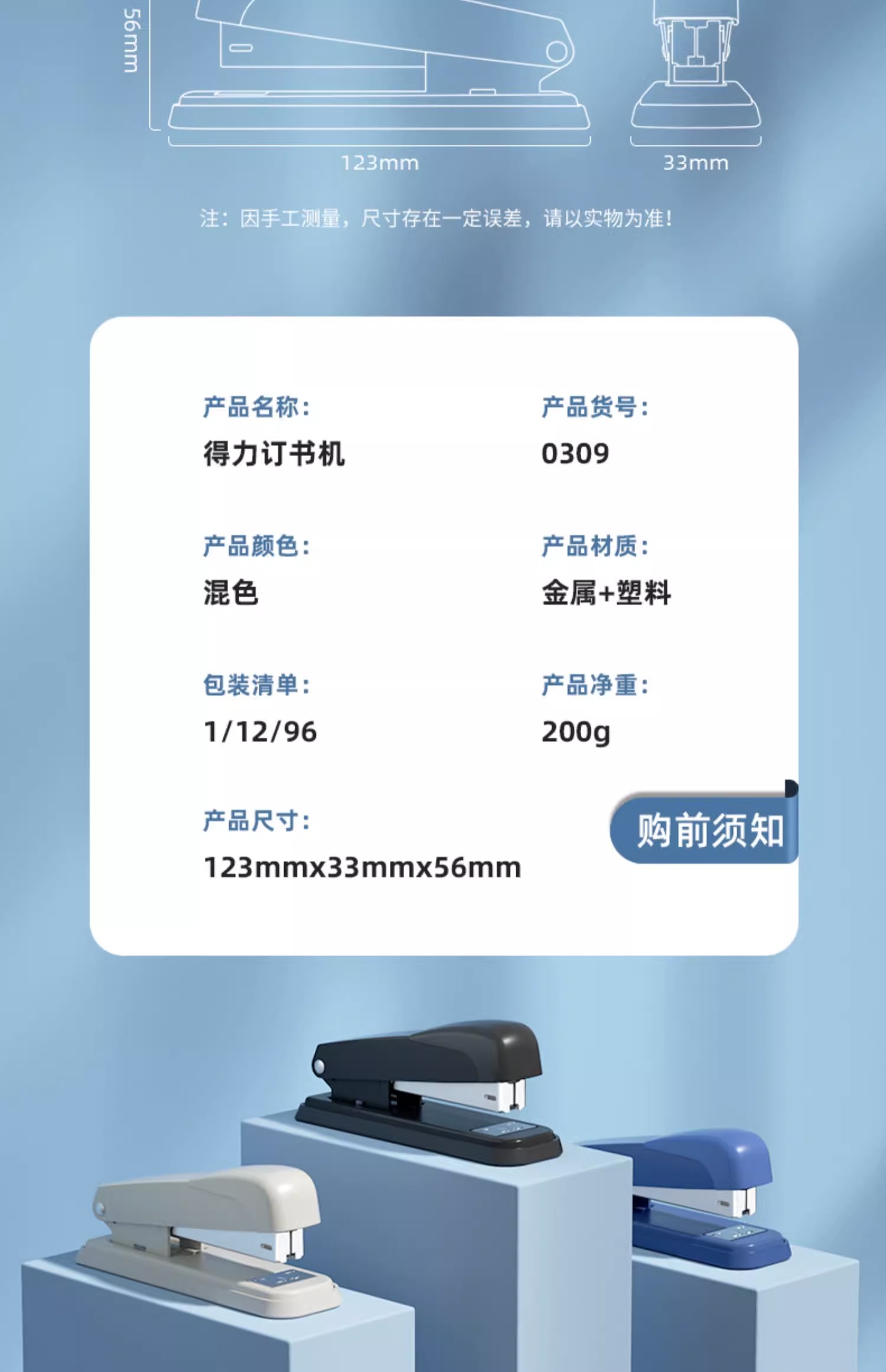 델리 문구 0309 스테이플러 표준 대형 스몰 사이즈 두꺼운 층 사무실 비즈니스 화이트 칼라 공급 노동 절약 책스토어 가기