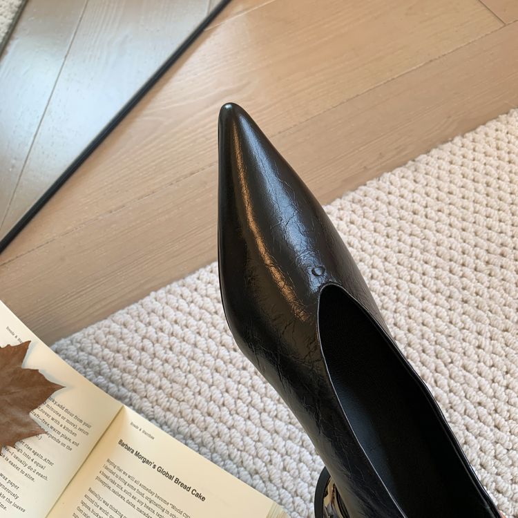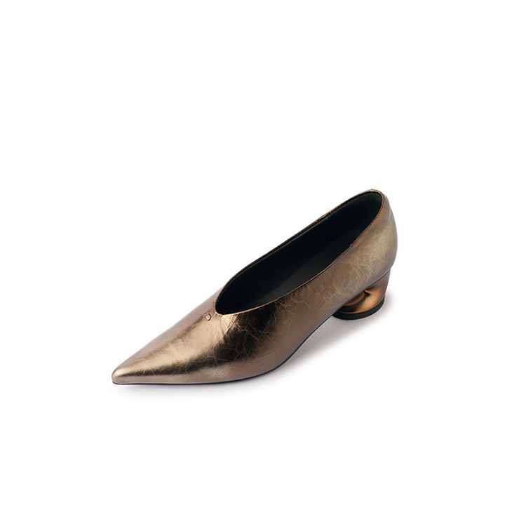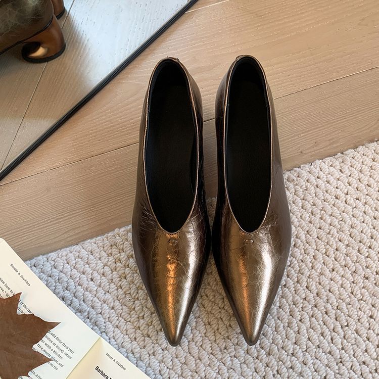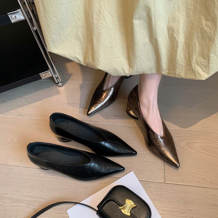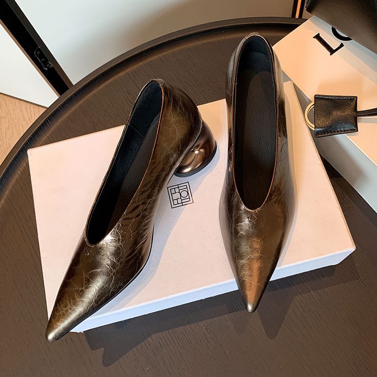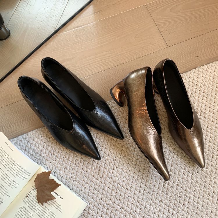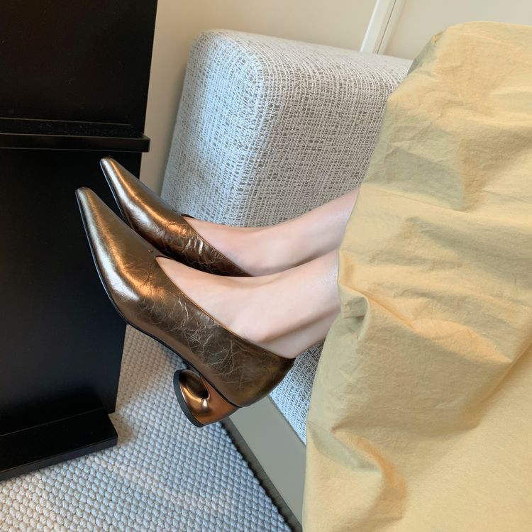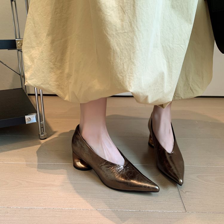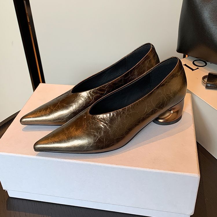 탑 레이어 Cowhide 포인팅-발가락 얕은 입 싱글 레이어 신발 여성용 미드 힐 신발 봄 새 스타일 풀 가죽 모양의 힐 골드 싱글 레이어 신발스토어 가기