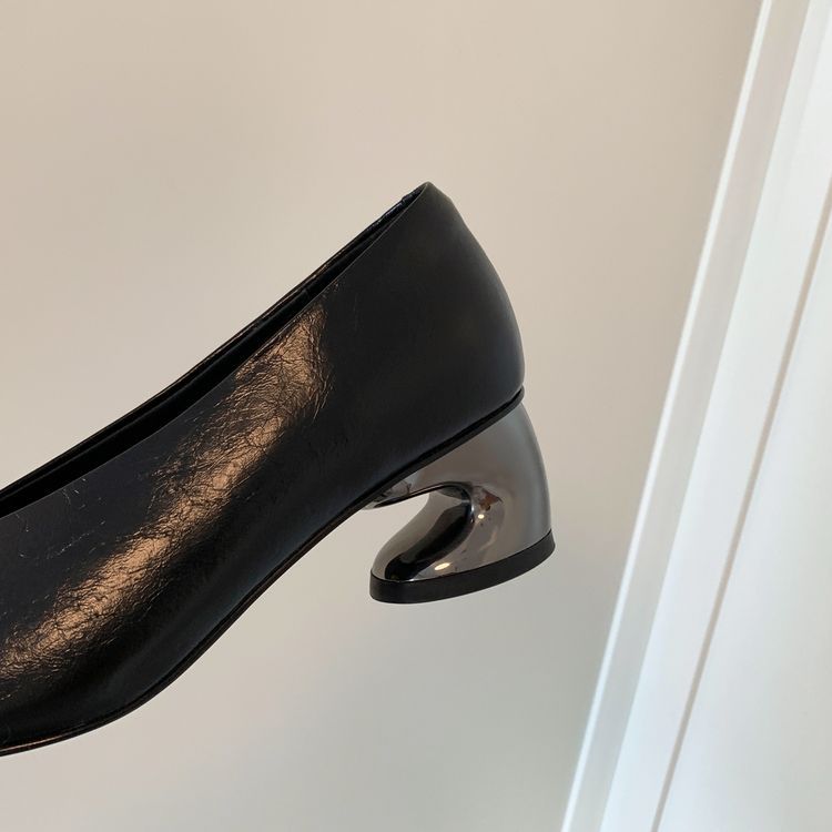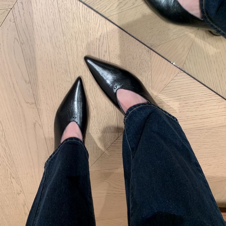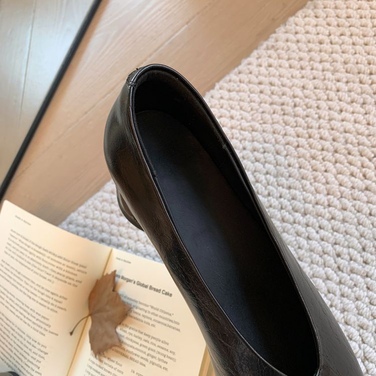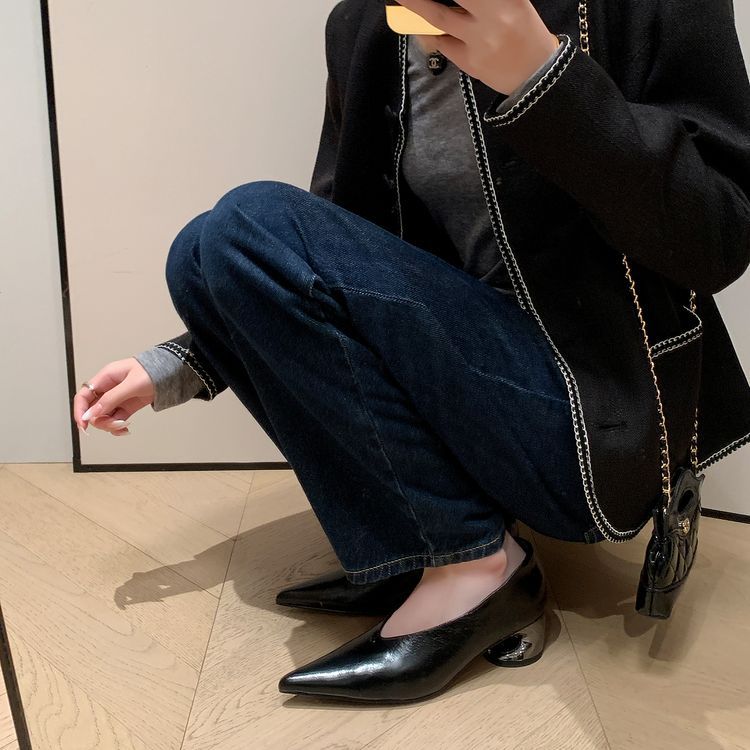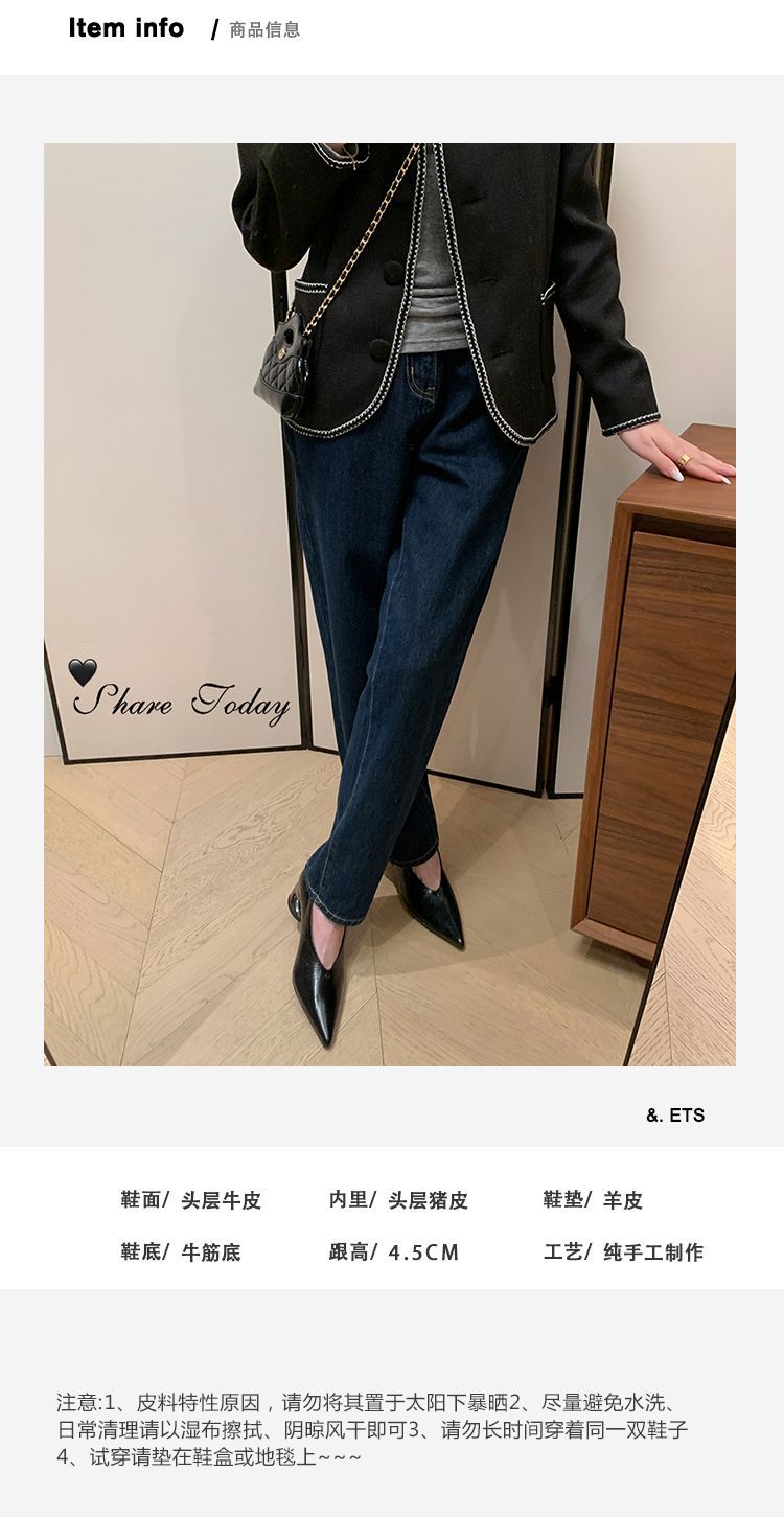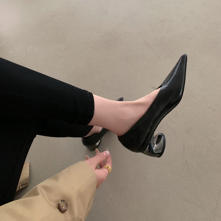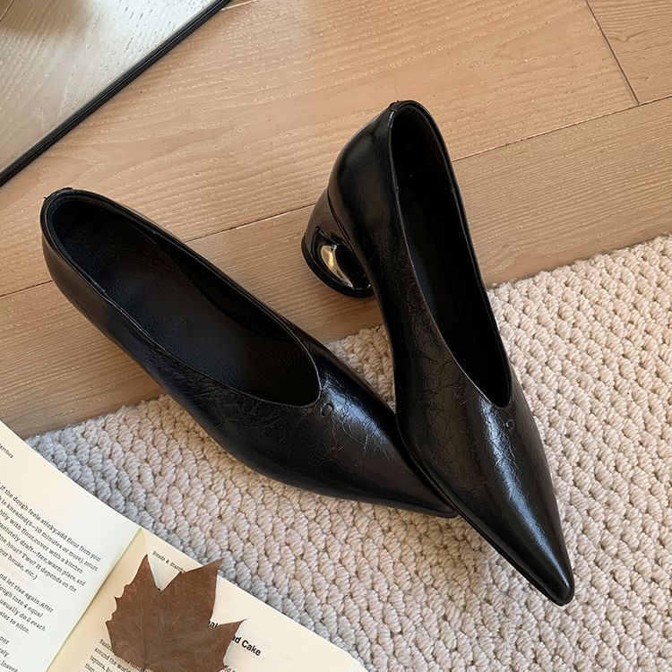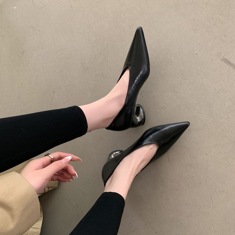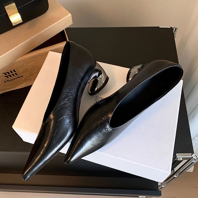 탑 레이어 Cowhide 포인팅-발가락 얕은 입 싱글 레이어 신발 여성용 미드 힐 신발 봄 새 스타일 풀 가죽 모양의 힐 골드 싱글 레이어 신발스토어 가기