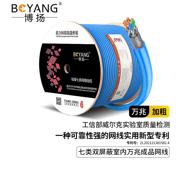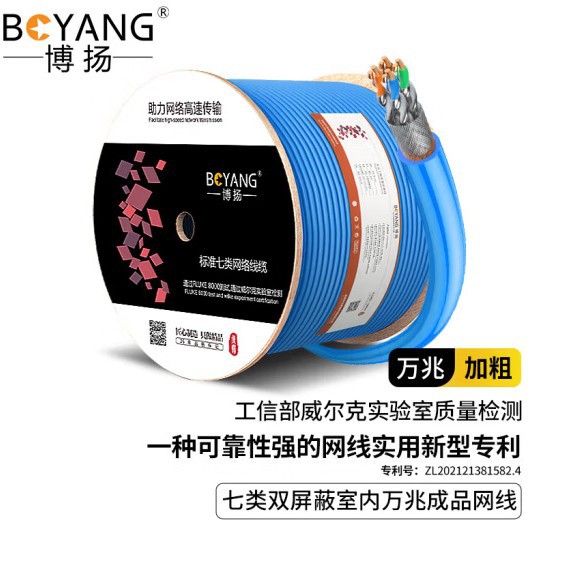 博扬 七类双屏蔽网线S/FTP Cat7类低烟无卤万兆网线 0.58无氧铜工程级双绞线箱线 305米/蓝 BY-7305L*1轴*合格证
