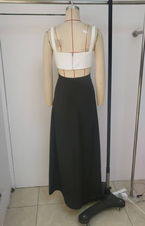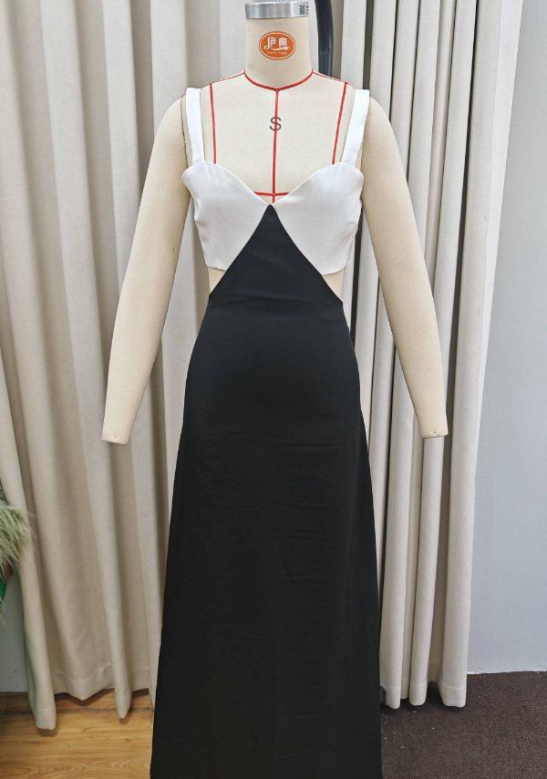 흑백 대비 컬러 슬링 프로필 백리스 롱 원피스 국경 간 패션 빈 허리 섹시한 원피스