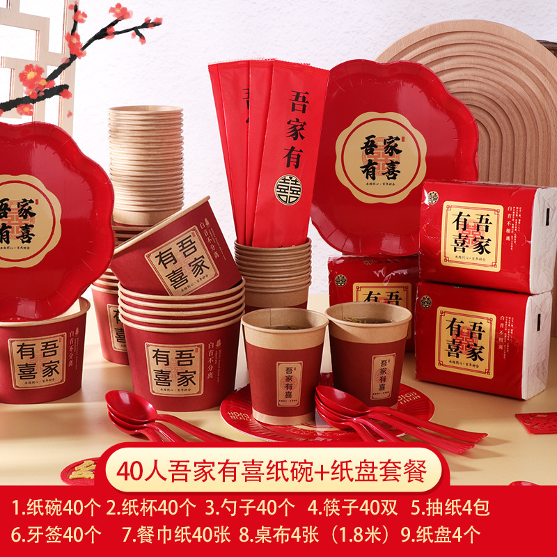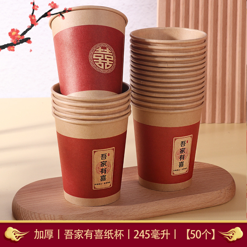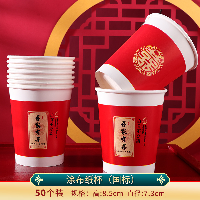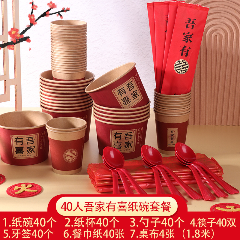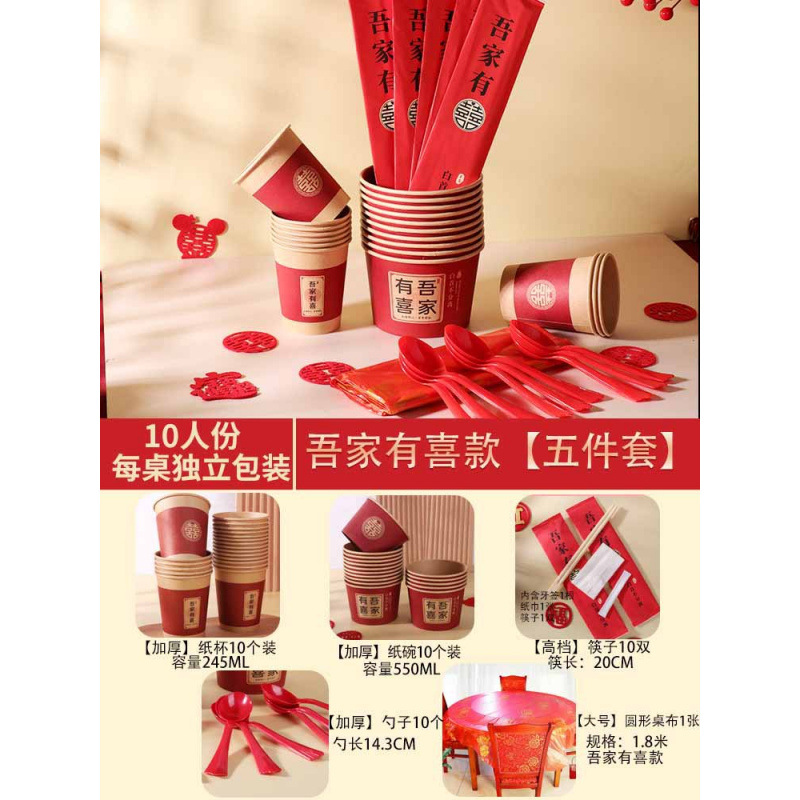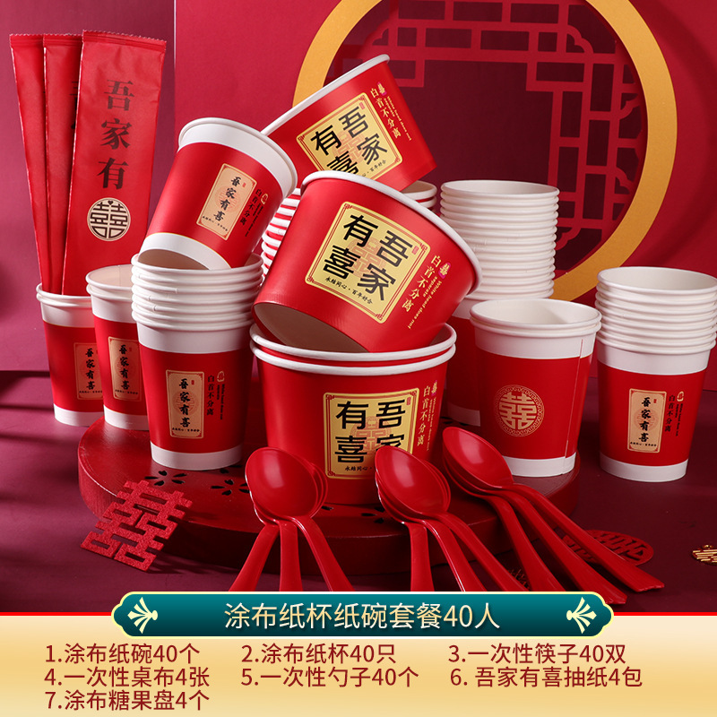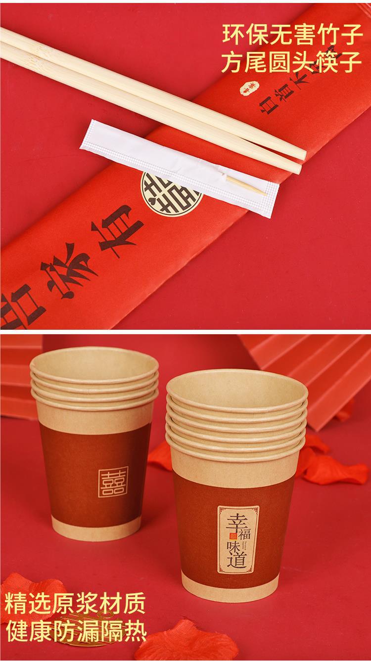 일회용 종이컵 웨딩 연회 종이 그릇 약혼 웨딩 그릇 젓가락 식기 세트 웨딩 축제 레드 해피 컵