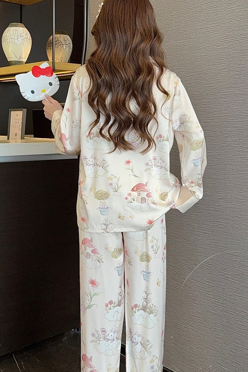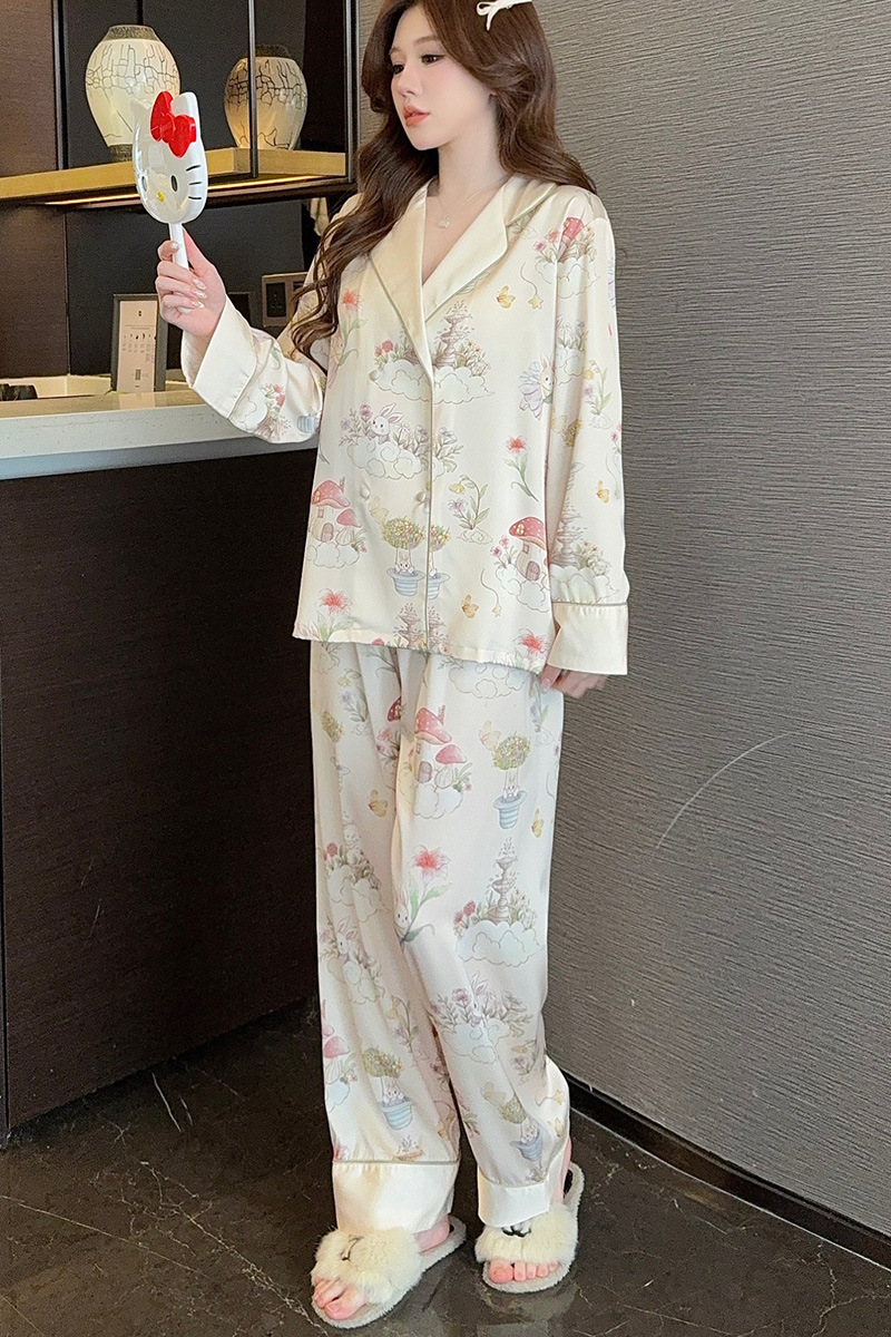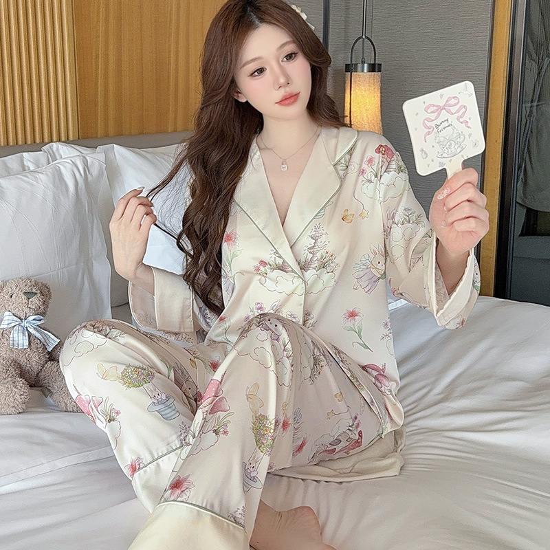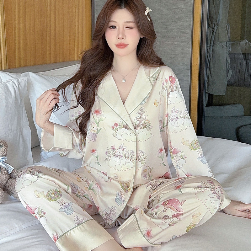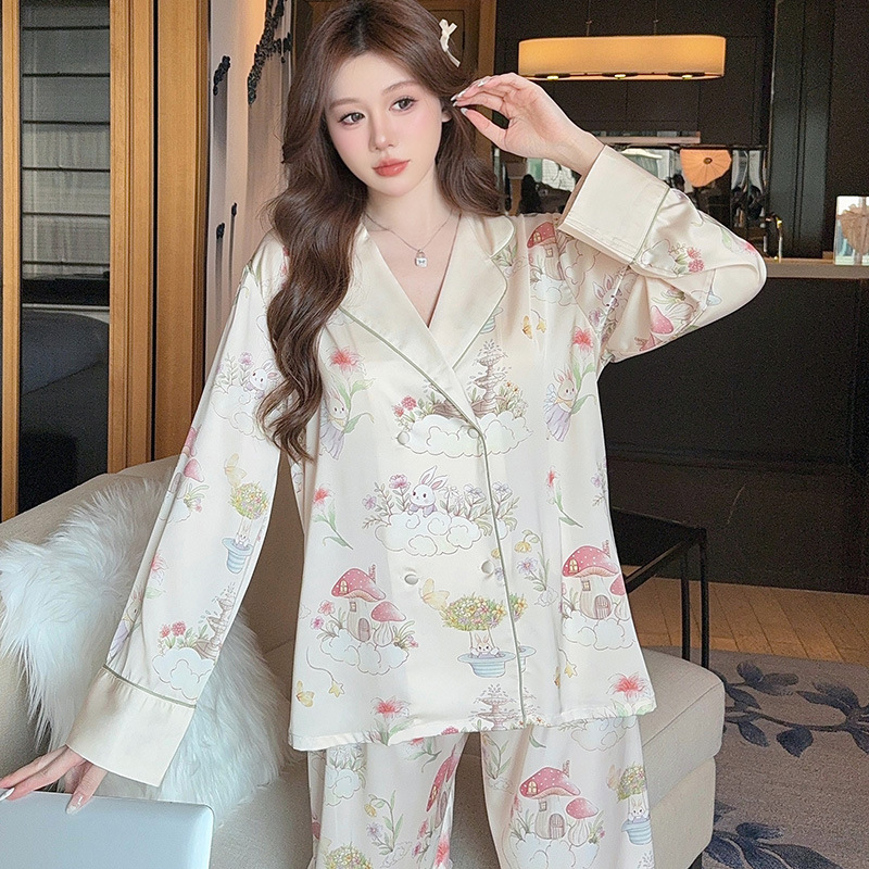 아이스 실크 잠옷 여성의 봄과 가을 긴 소매 여름 얇은 2025 새로운 하이 엔드 센스 실크 홈 의류 카디건 세트스토어 가기