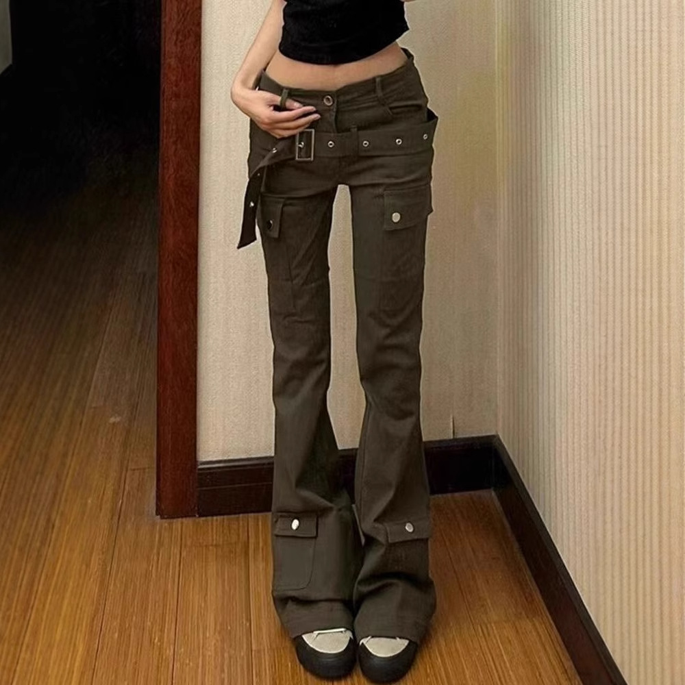 2025 아메리칸 스타일 하이 스트리트 레트로 낮은 허리 마이크로 플레어 청바지 여성 여름 디자인 센스 틈새 캐주얼 툴링 바지스토어 가기