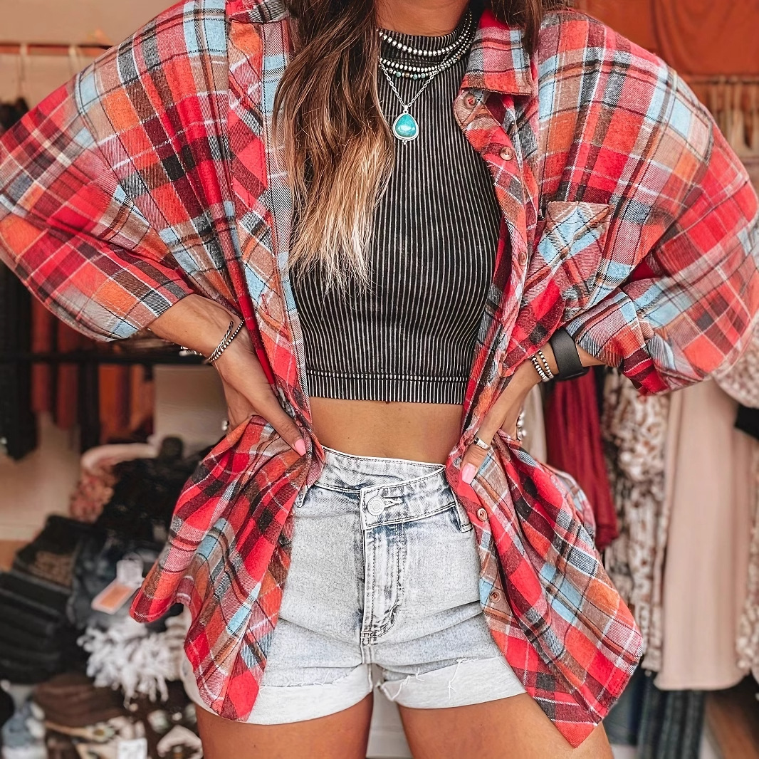 2025 년 여름 새로운 격자 무늬 인쇄 긴 소매 최고 여성 유럽과 미국의 간단한 올 매치 느슨한 살 셔츠 여성스토어 가기