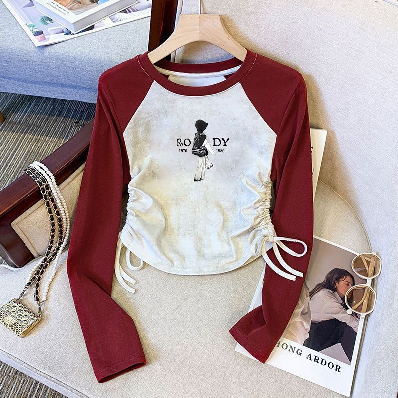 소녀의 봄과 가을 긴팔 새로운 스타일 중대형 어린이 접합 캐주얼 웨스턴 스타일 드로우 스트링 기본 어린이 티셔츠 탑 올 매치 트렌디스토어 가기