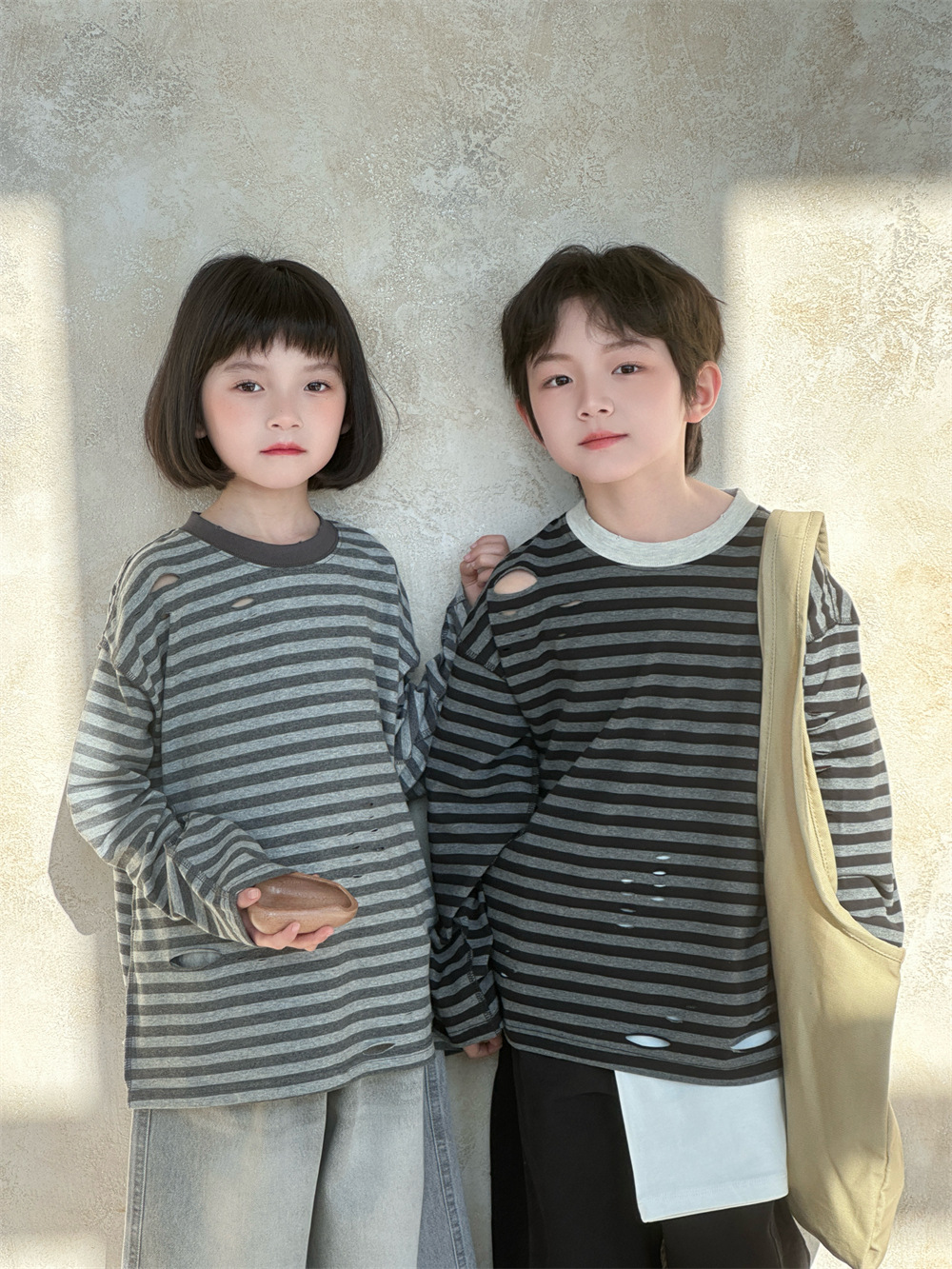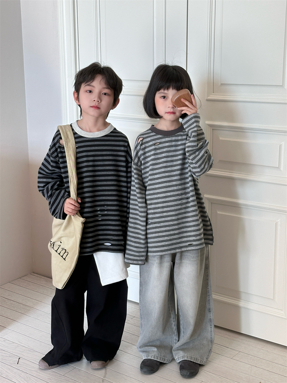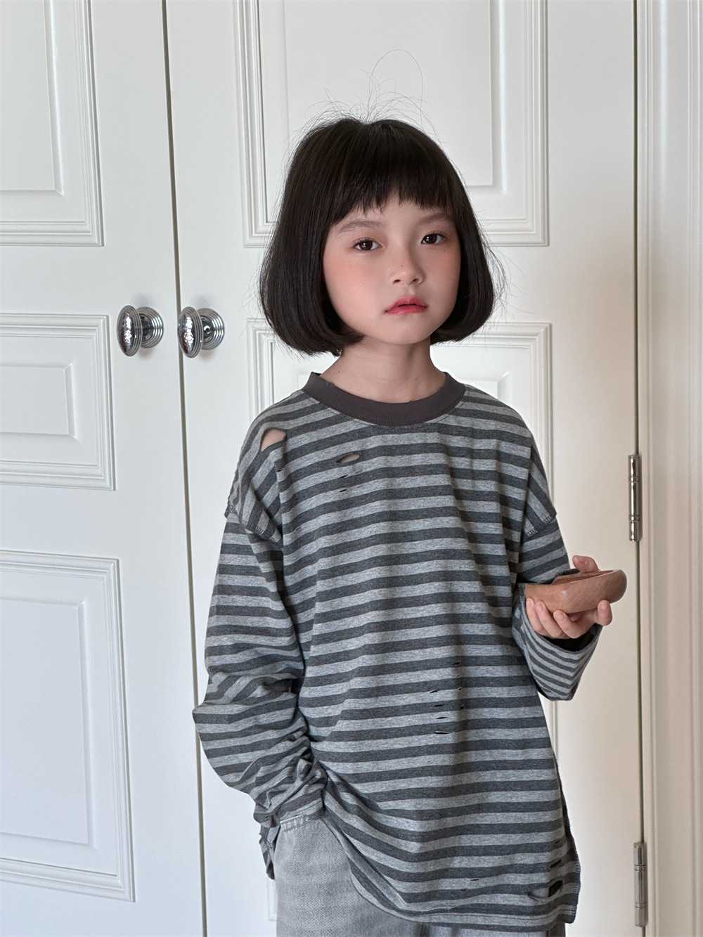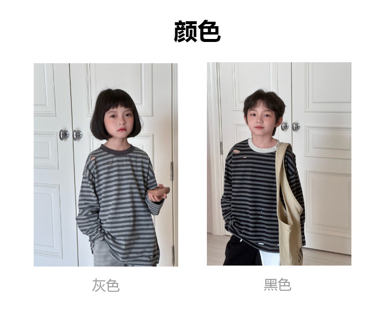 2025 새로운 가을 한국 스타일 소년과 소녀를위한 어린이 찢어진 줄무늬 티셔츠 느슨한 캐주얼 다목적 바닥 긴팔 유행스토어 가기