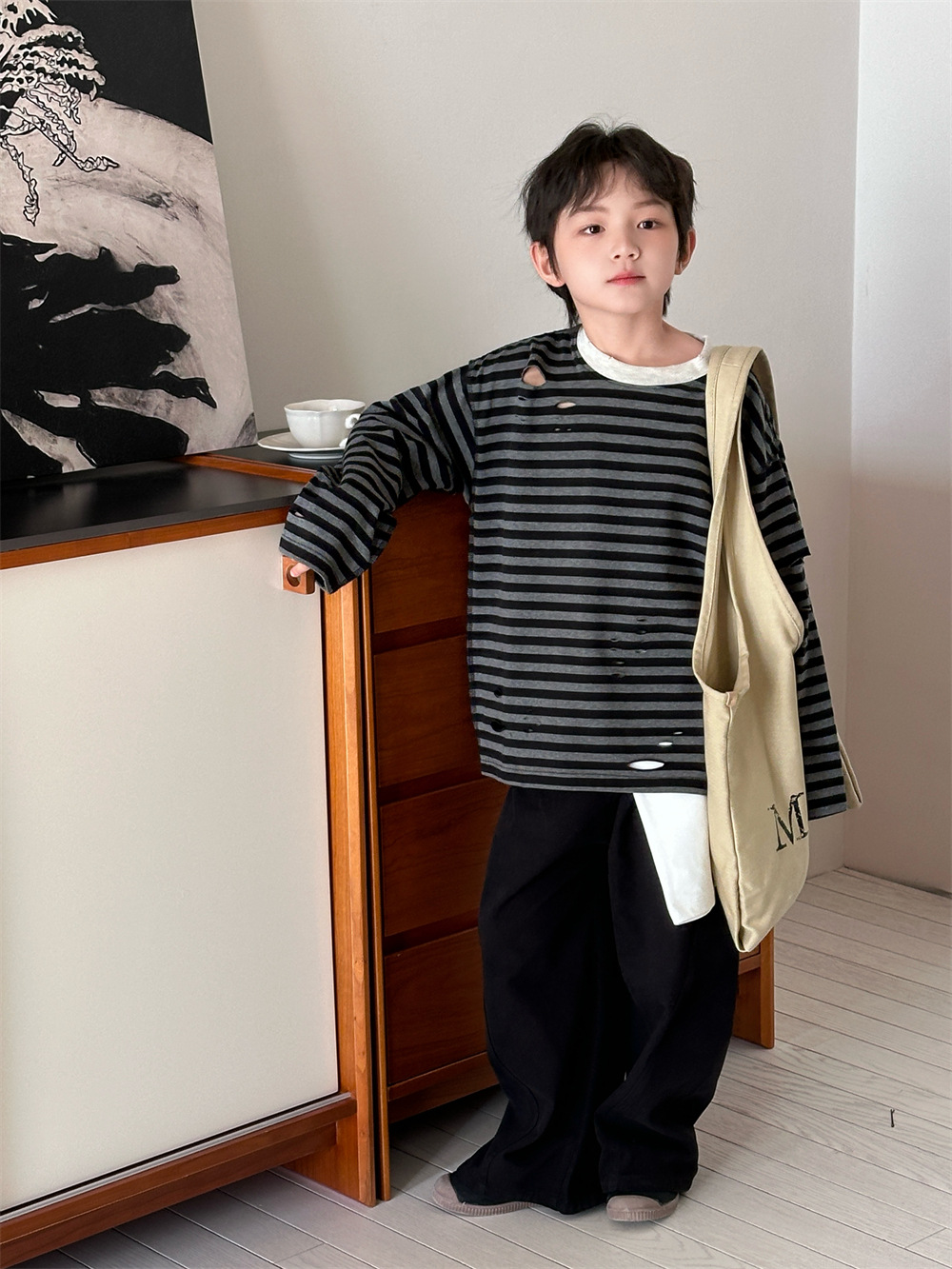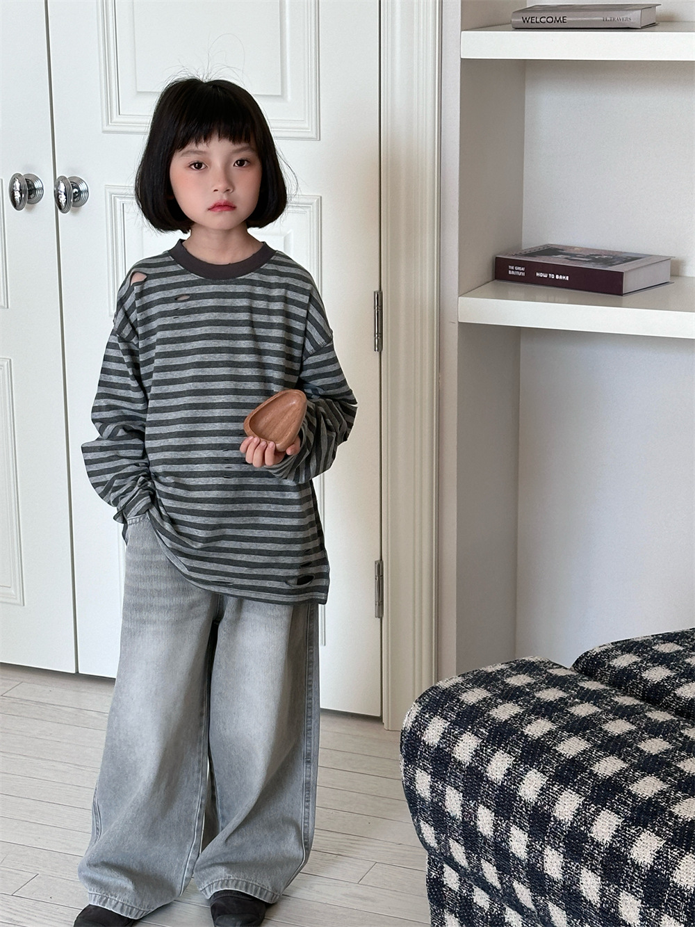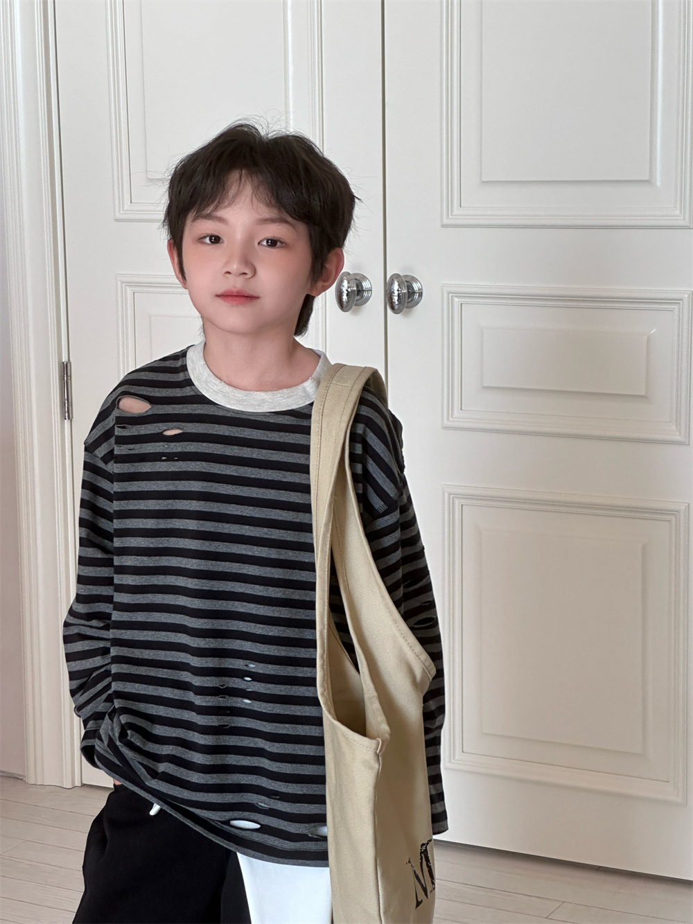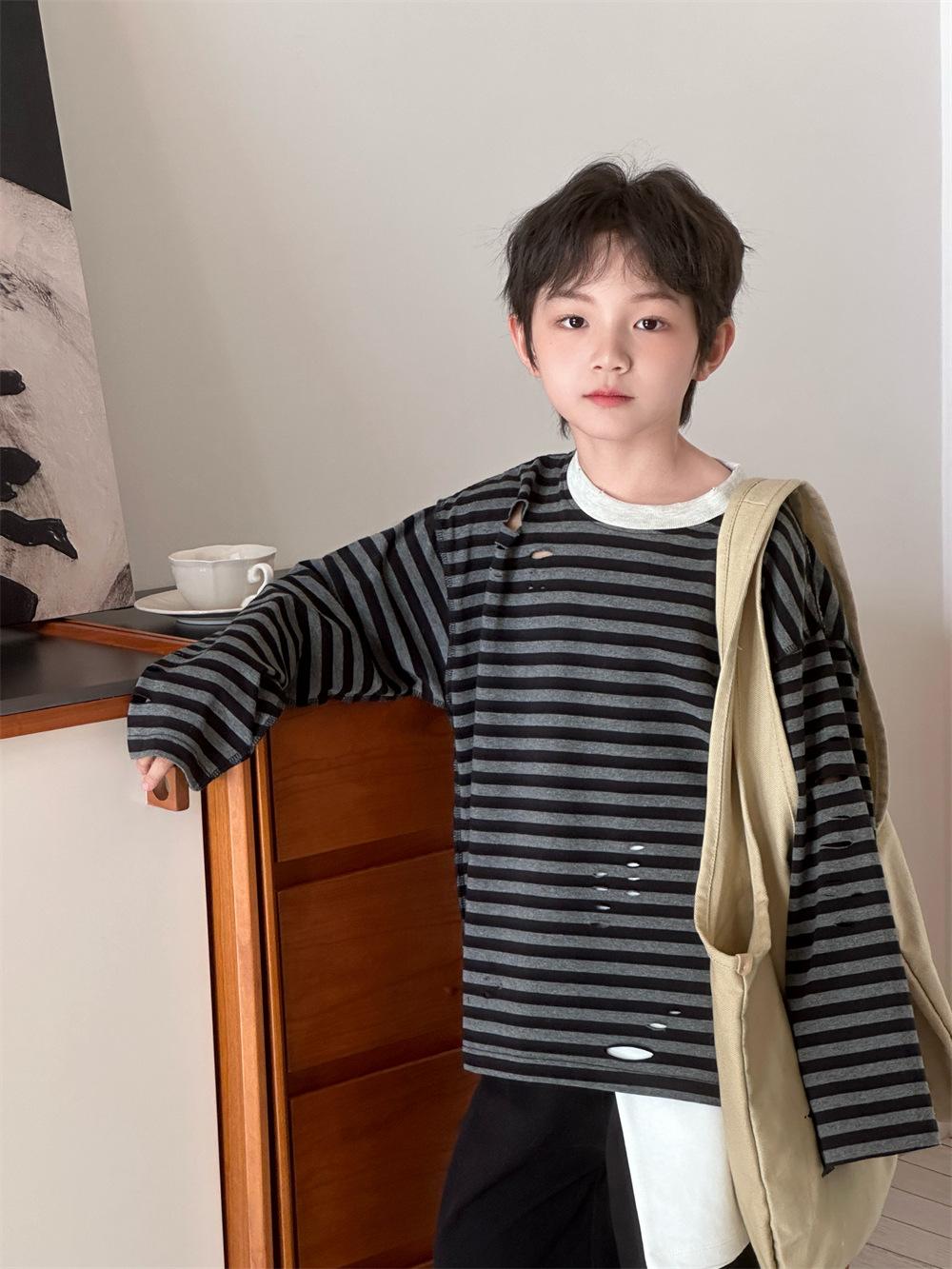 2025 새로운 가을 한국 스타일 소년과 소녀를위한 어린이 찢어진 줄무늬 티셔츠 느슨한 캐주얼 다목적 바닥 긴팔 유행스토어 가기
