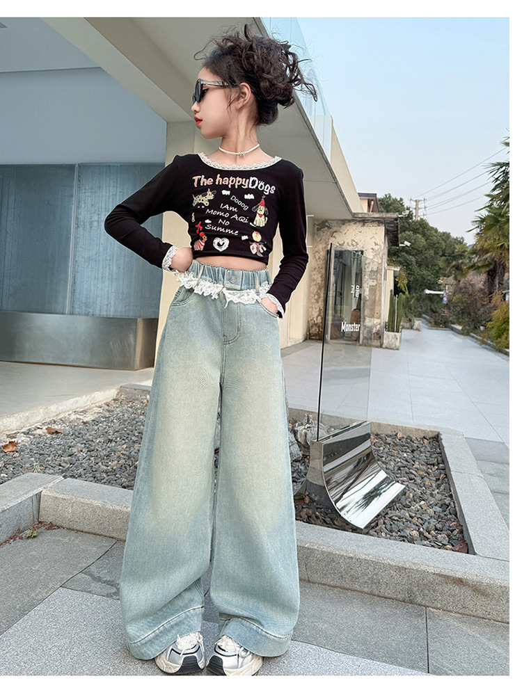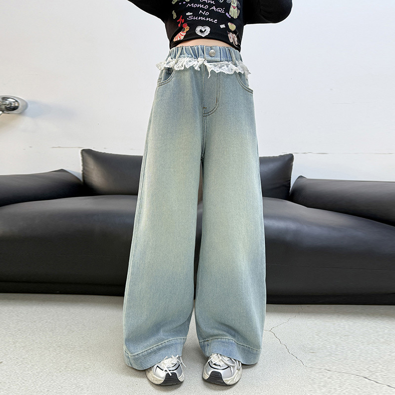 소녀 한국 스타일 레이스 스티칭 청바지 2025 봄 새 스타일 스트레이트 바지 어린이 서양식 와이드 다리 바지