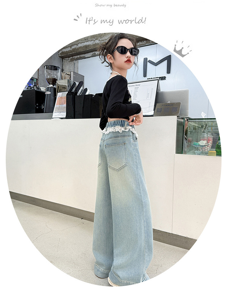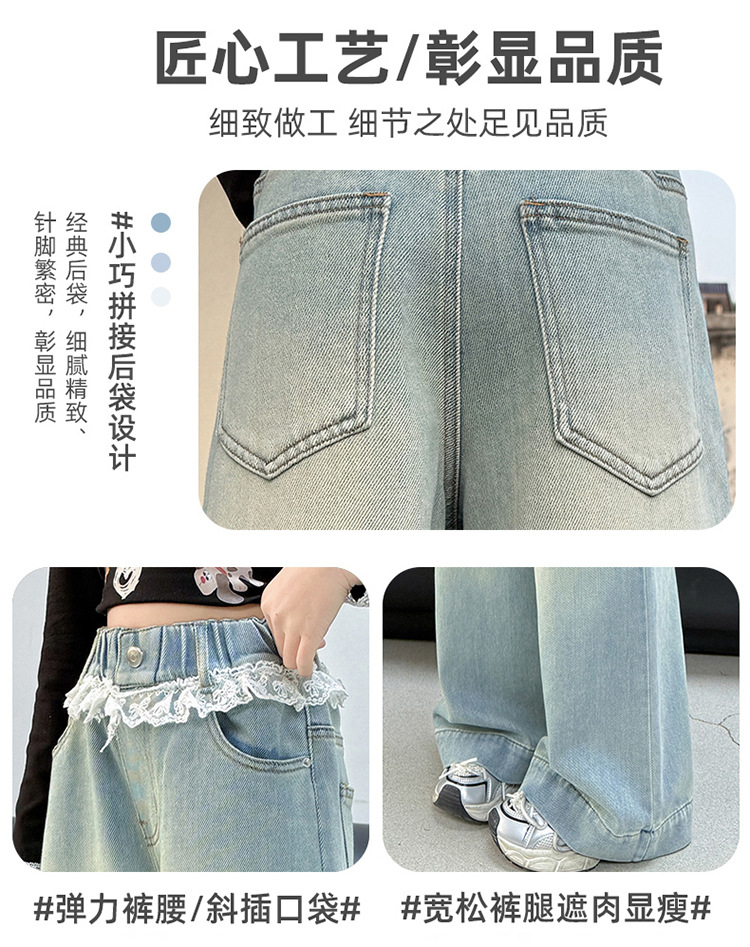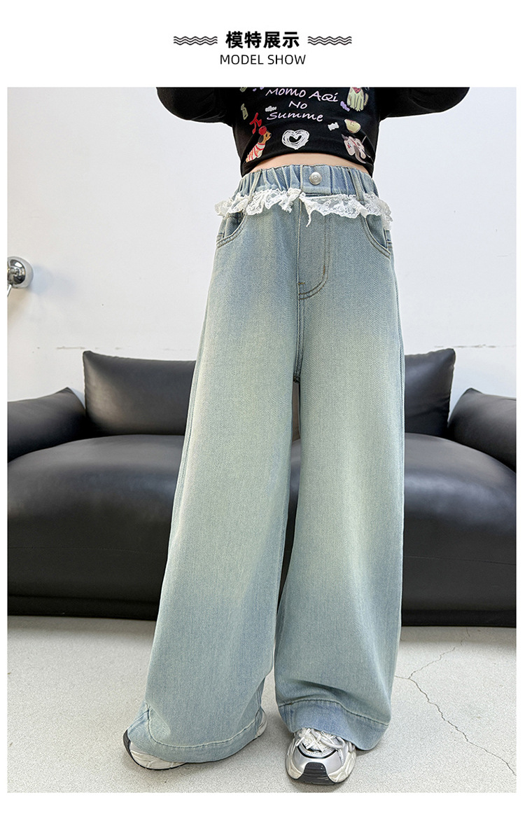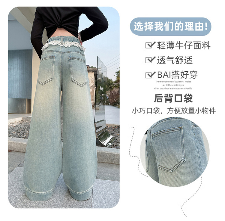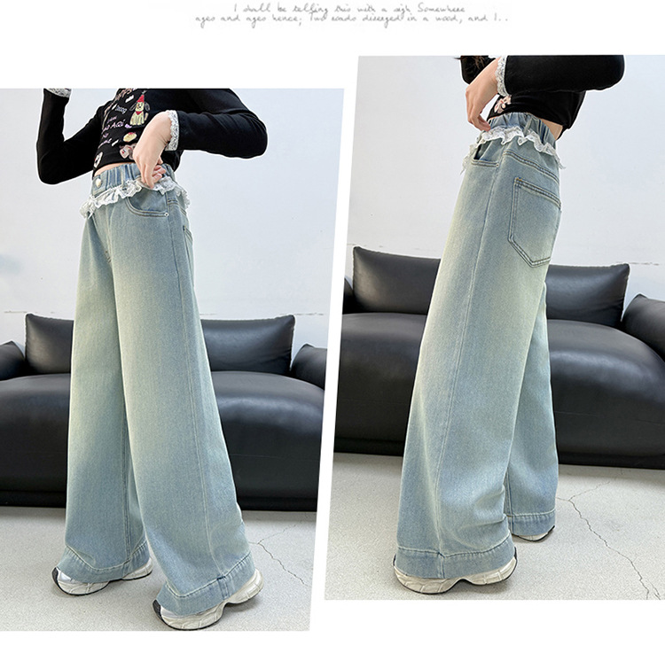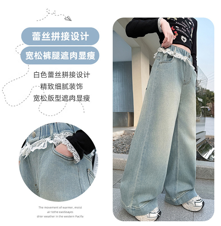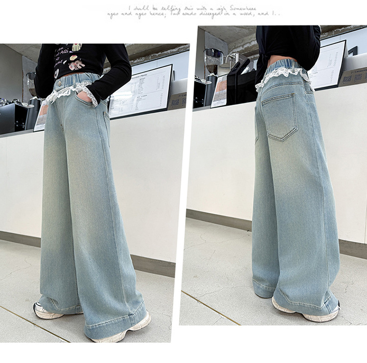 소녀 한국 스타일 레이스 스티칭 청바지 2025 봄 새 스타일 스트레이트 바지 어린이 서양식 와이드 다리 바지스토어 가기