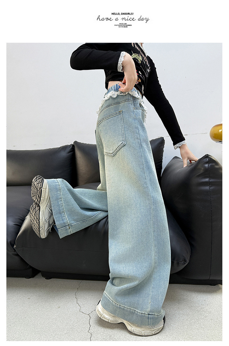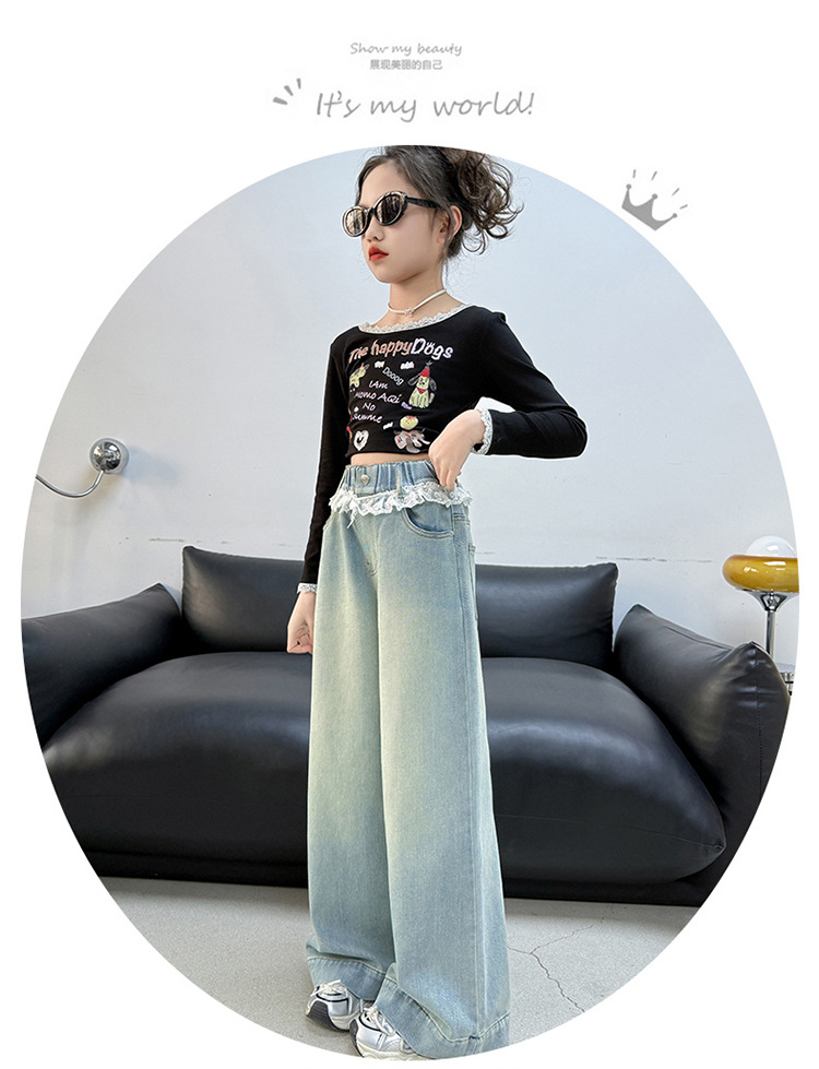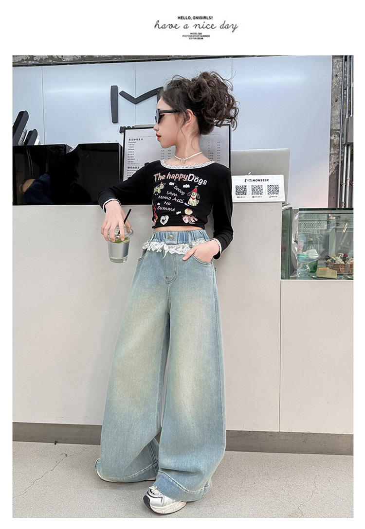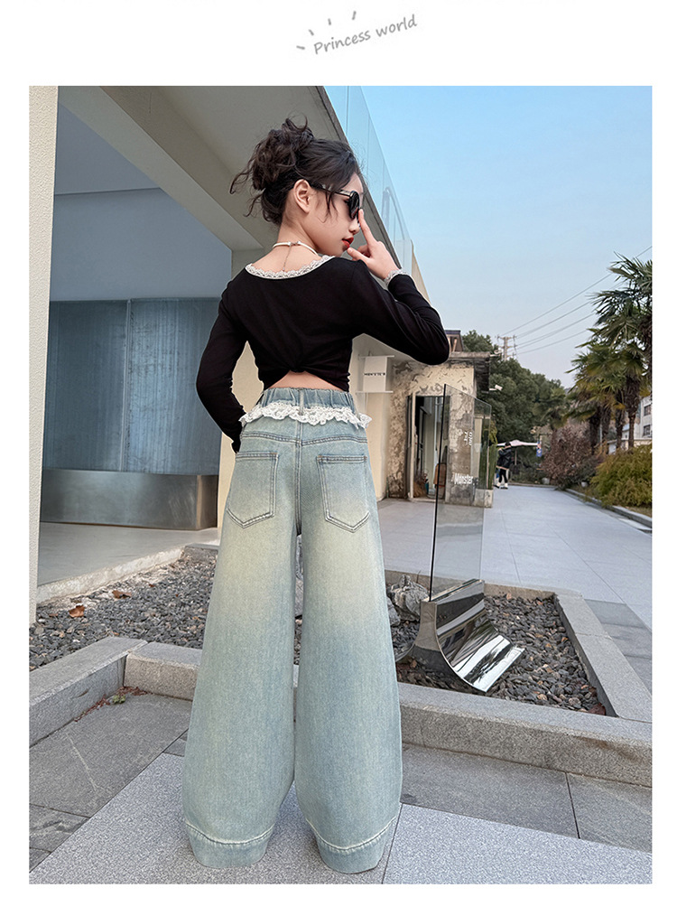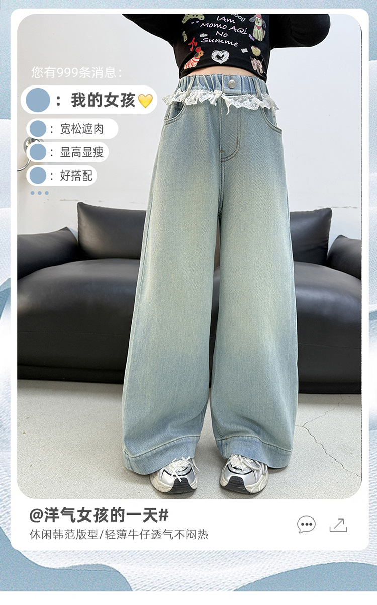소녀 한국 스타일 레이스 스티칭 청바지 2025 봄 새 스타일 스트레이트 바지 어린이 서양식 와이드 다리 바지스토어 가기