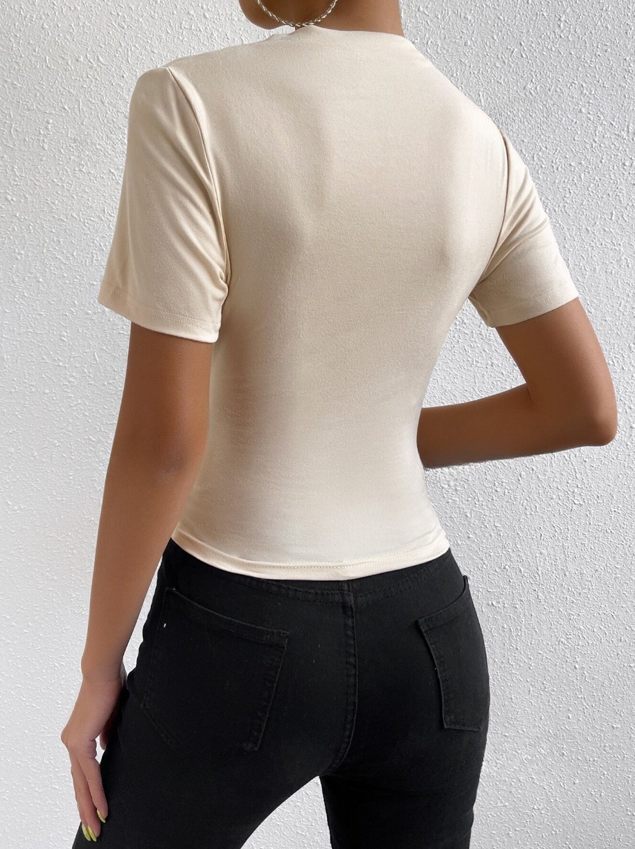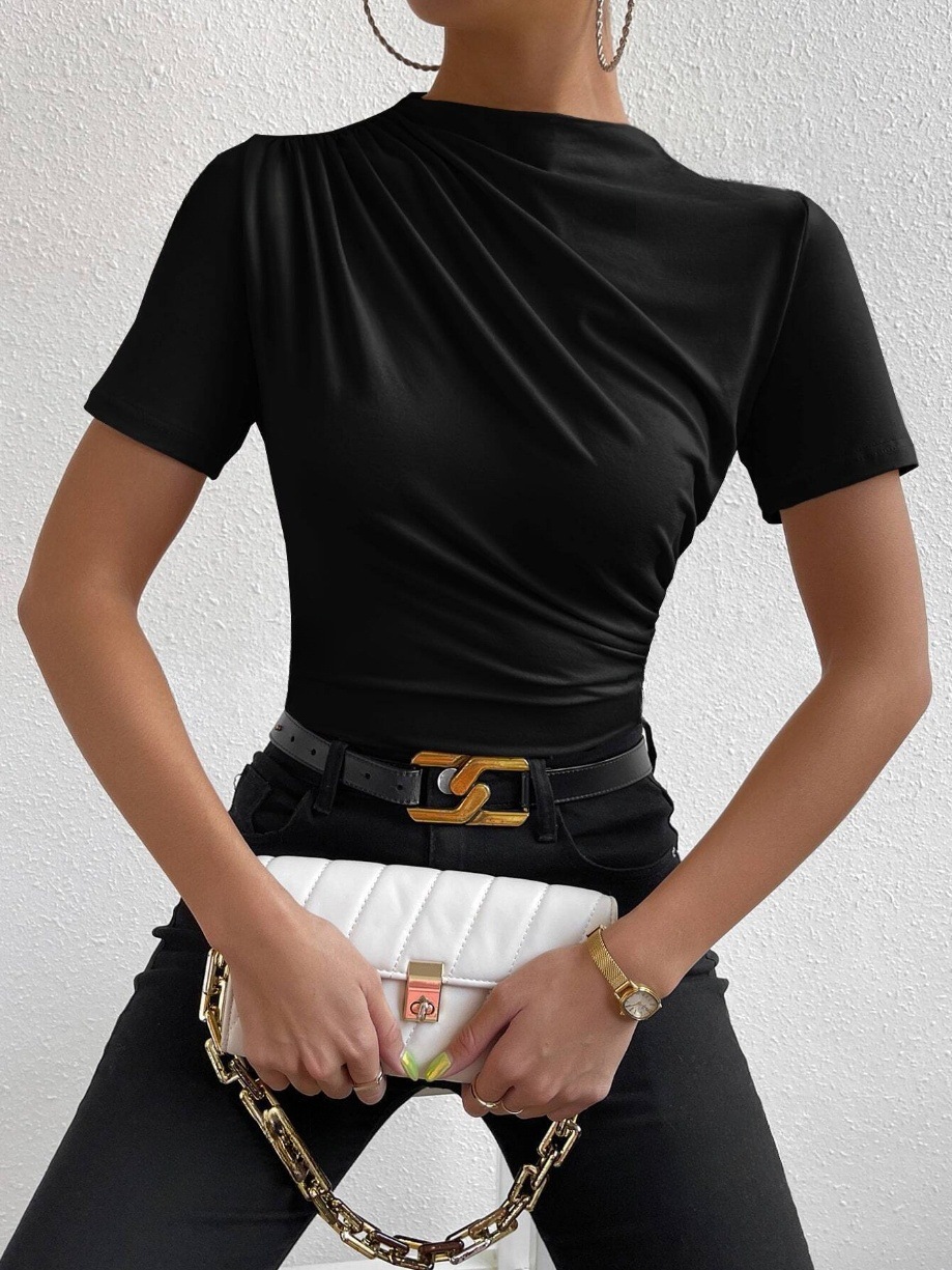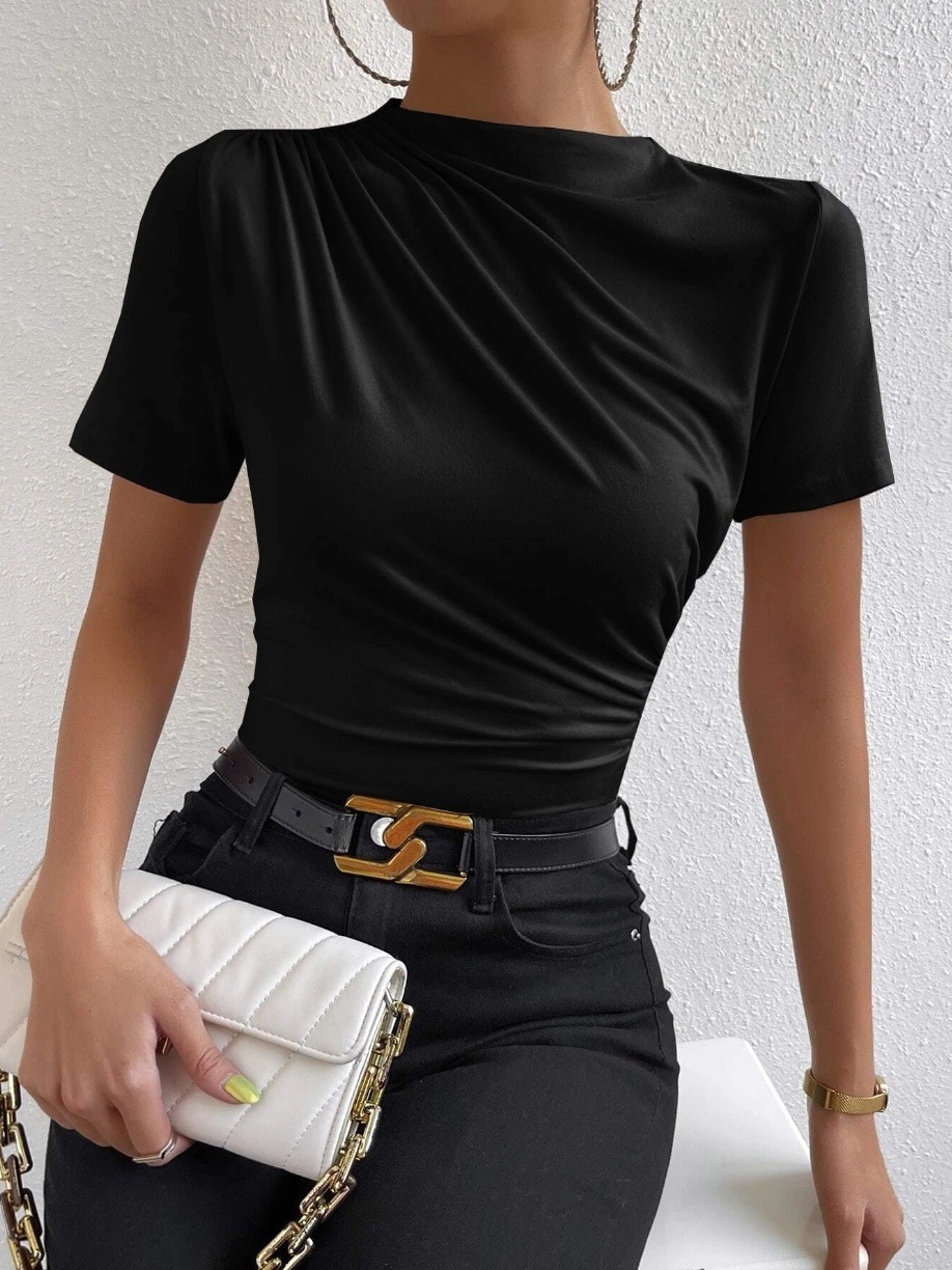 아마존 유럽과 미국의 국경 간 AliExpress 독립 역 봄/여름 2024 작은 높은 칼라 주름 슬림 반팔 여성용 티셔츠