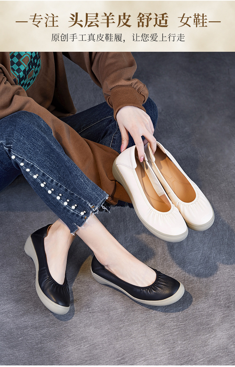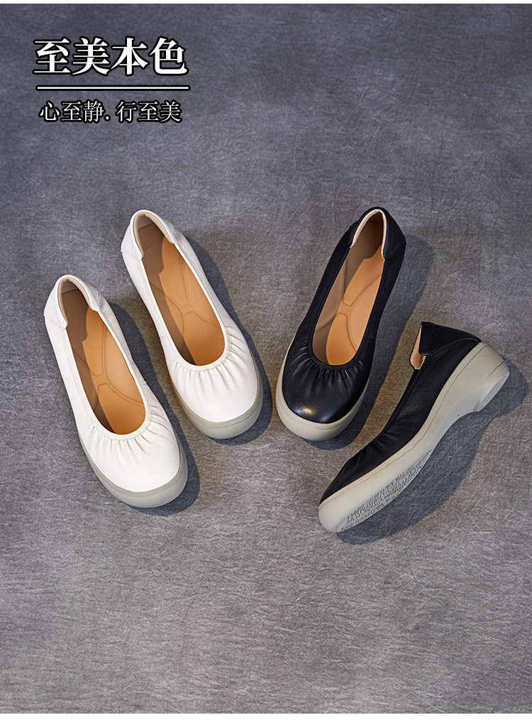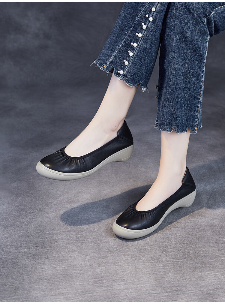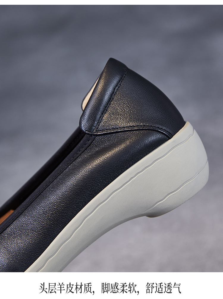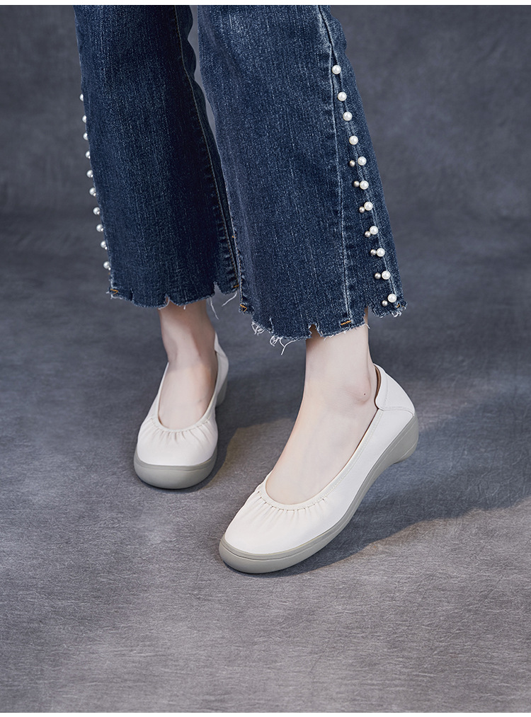 미국 천연 컬러 가죽 신발 여성의 2025 봄 새로운 얕은 입 밀크 신발 라운드 토 웨지 힐 슬립 온 마더 슈즈스토어 가기