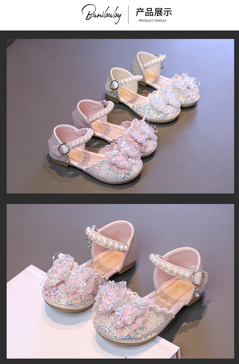 소녀 Baotou 샌들 여름 2025 새로운 작은 소녀 크리스탈 신발 나비 진주 공주 신발 공연 댄스 신발스토어 가기