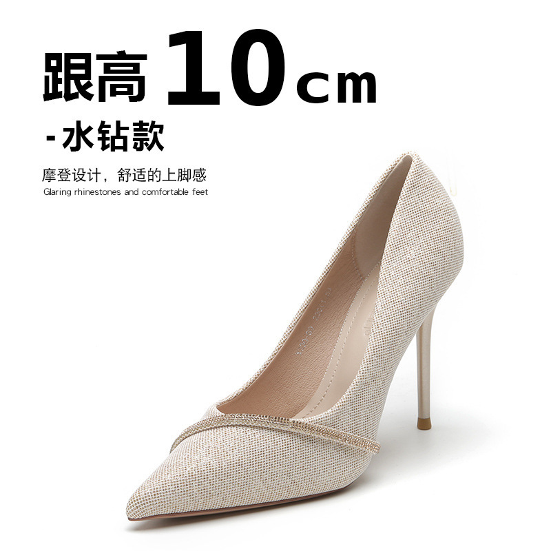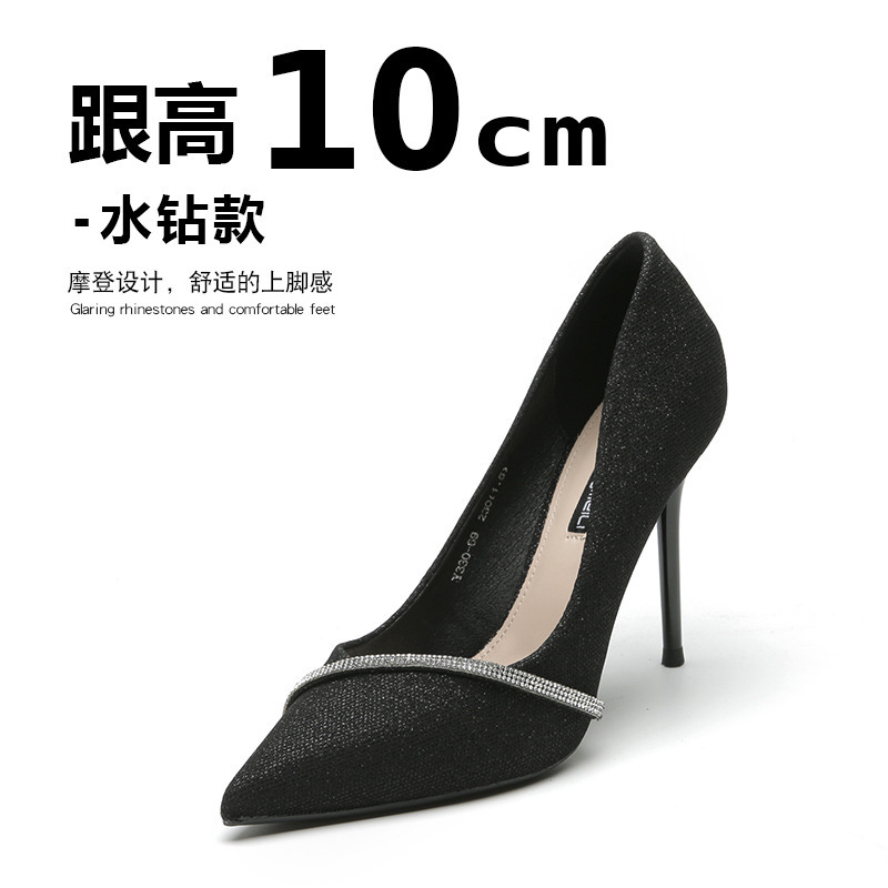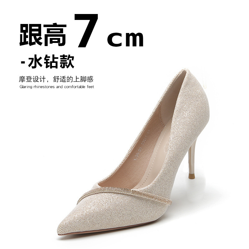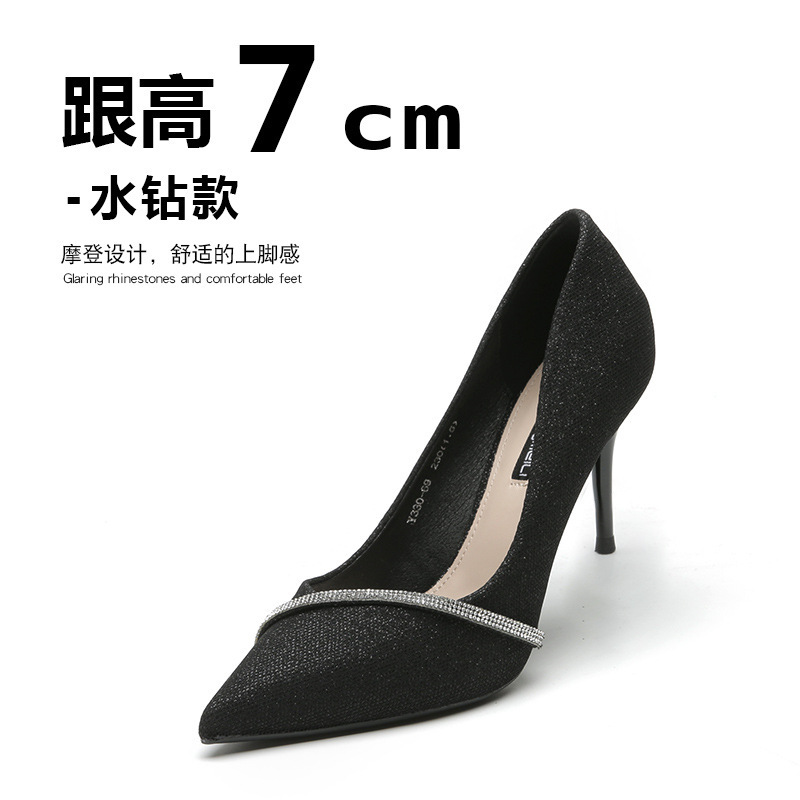 국경 간 단층 신발 여성 미드 힐 2023 새로운 가을 프랑스 모조 다이아몬드 뾰족한 신발 낮은 통 스틸레토 힐 하이힐 대외 무역 신발스토어 가기