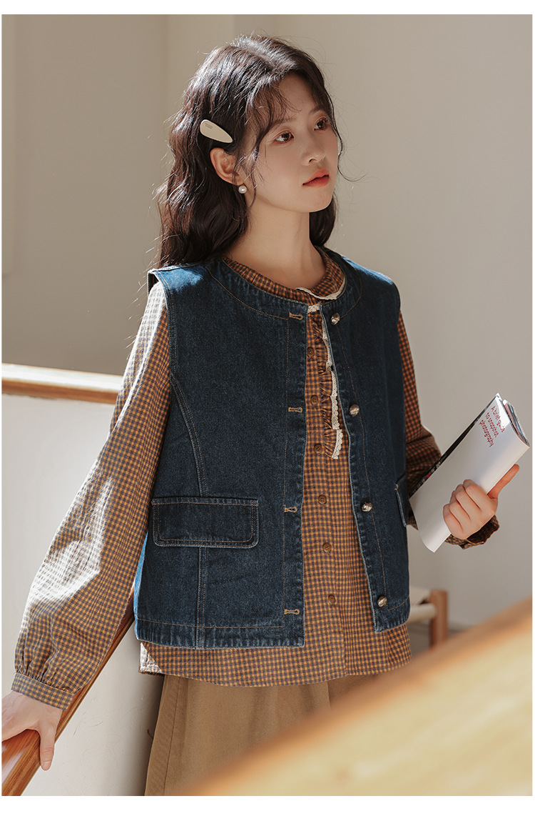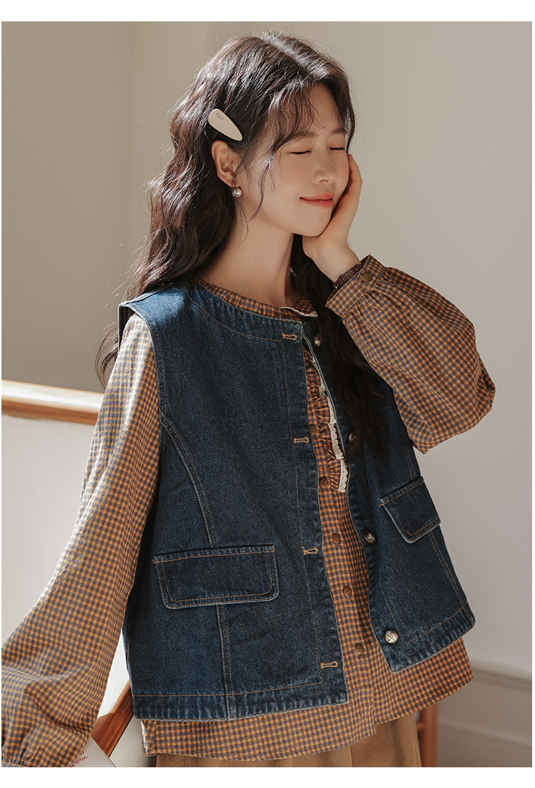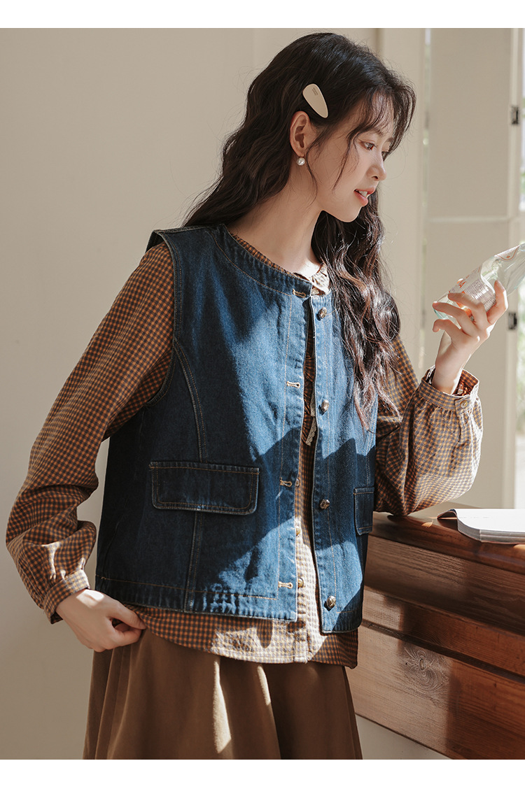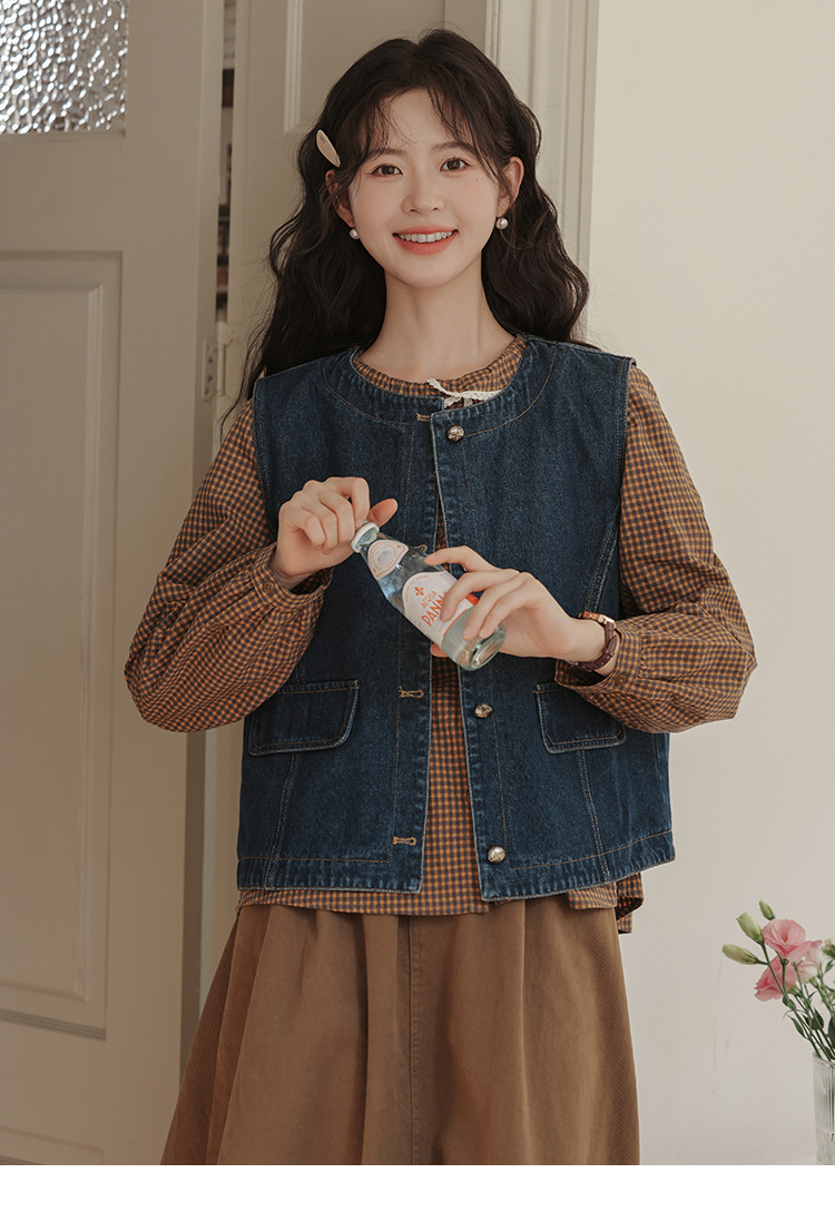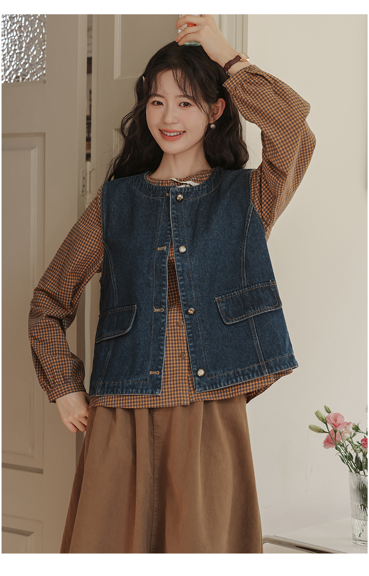 2025 년 봄 새로운 레트로 일본 스타일, 라운드 넥 짧은 데님 조끼스토어 가기
