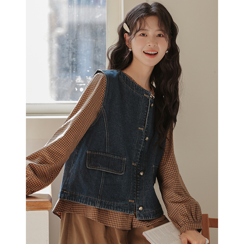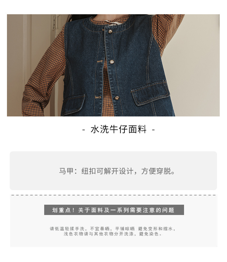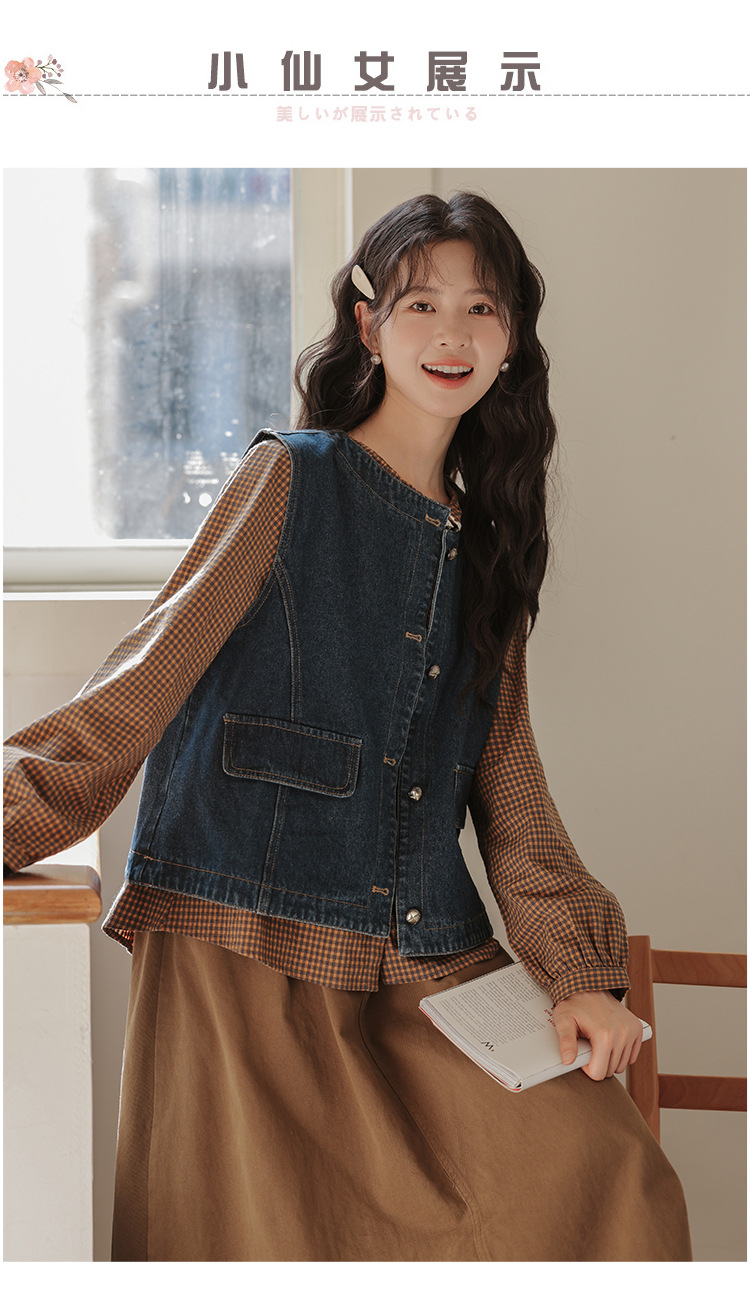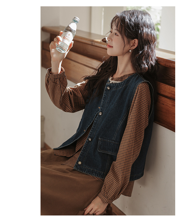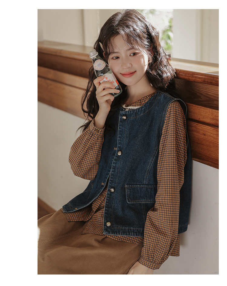 2025 년 봄 새로운 레트로 일본 스타일, 라운드 넥 짧은 데님 조끼스토어 가기