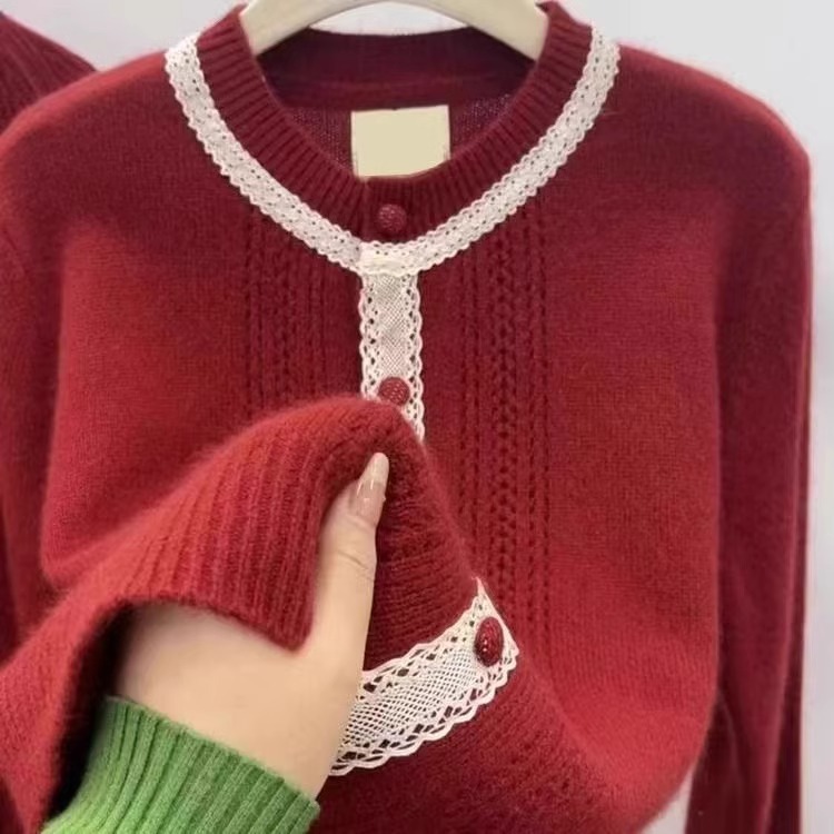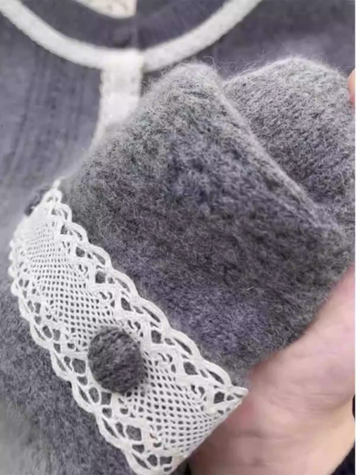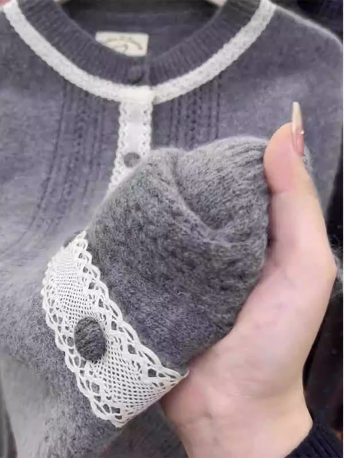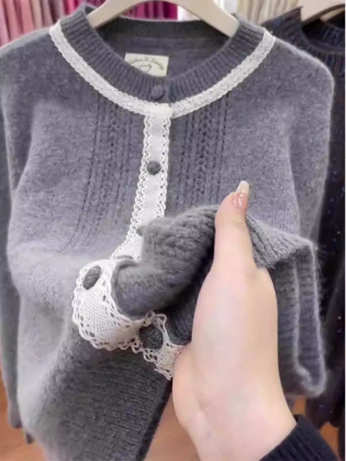 나이를 줄이는 회색 레이스 스티칭 스웨터 여성의 가을과 겨울 2024 부드러운 바람 둥근 목 싱글 브레스트 니트 카디건