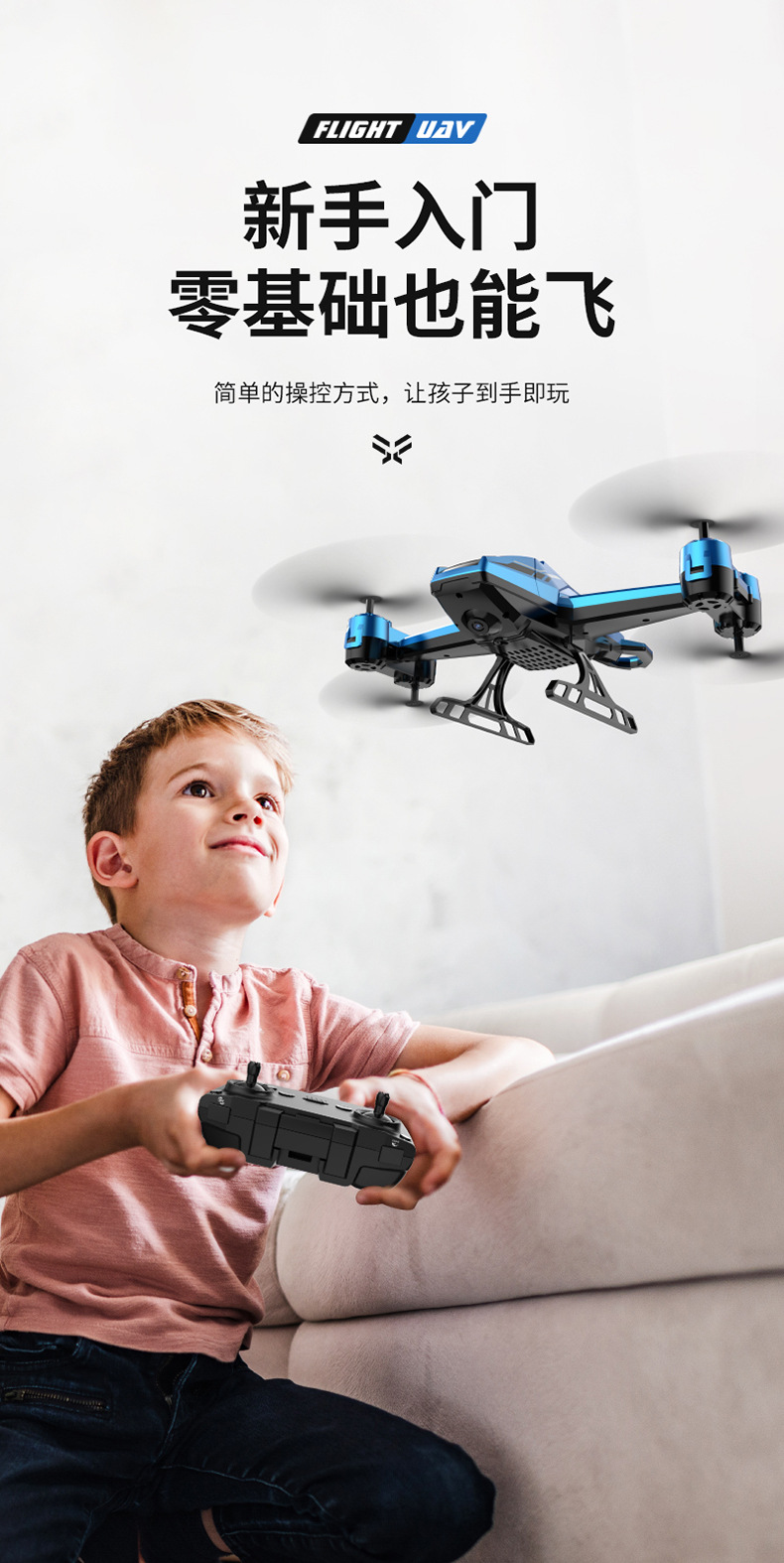 产品功能:产品具有前进、后退、上升、下降、左右转、左右侧飞,无头模式,一键返航,空中悬停,气压定高,快慢速切换功能,360°特技环绕。