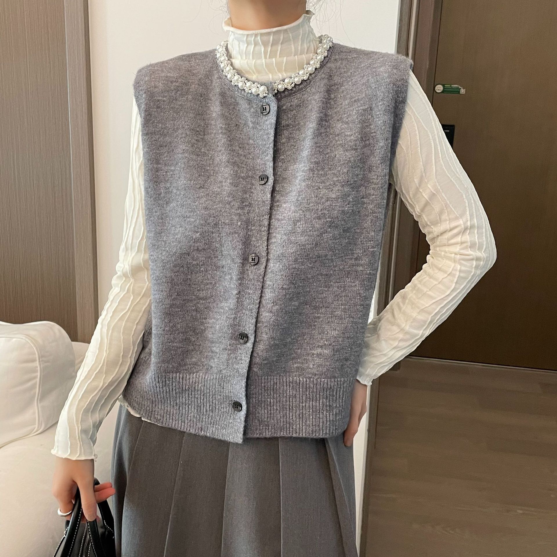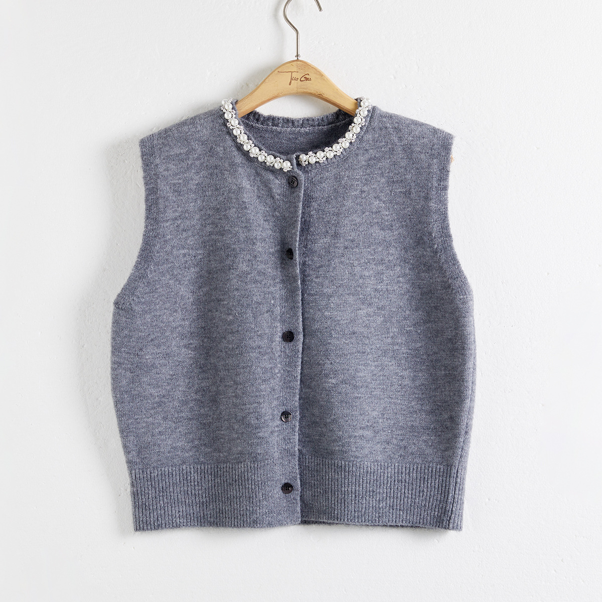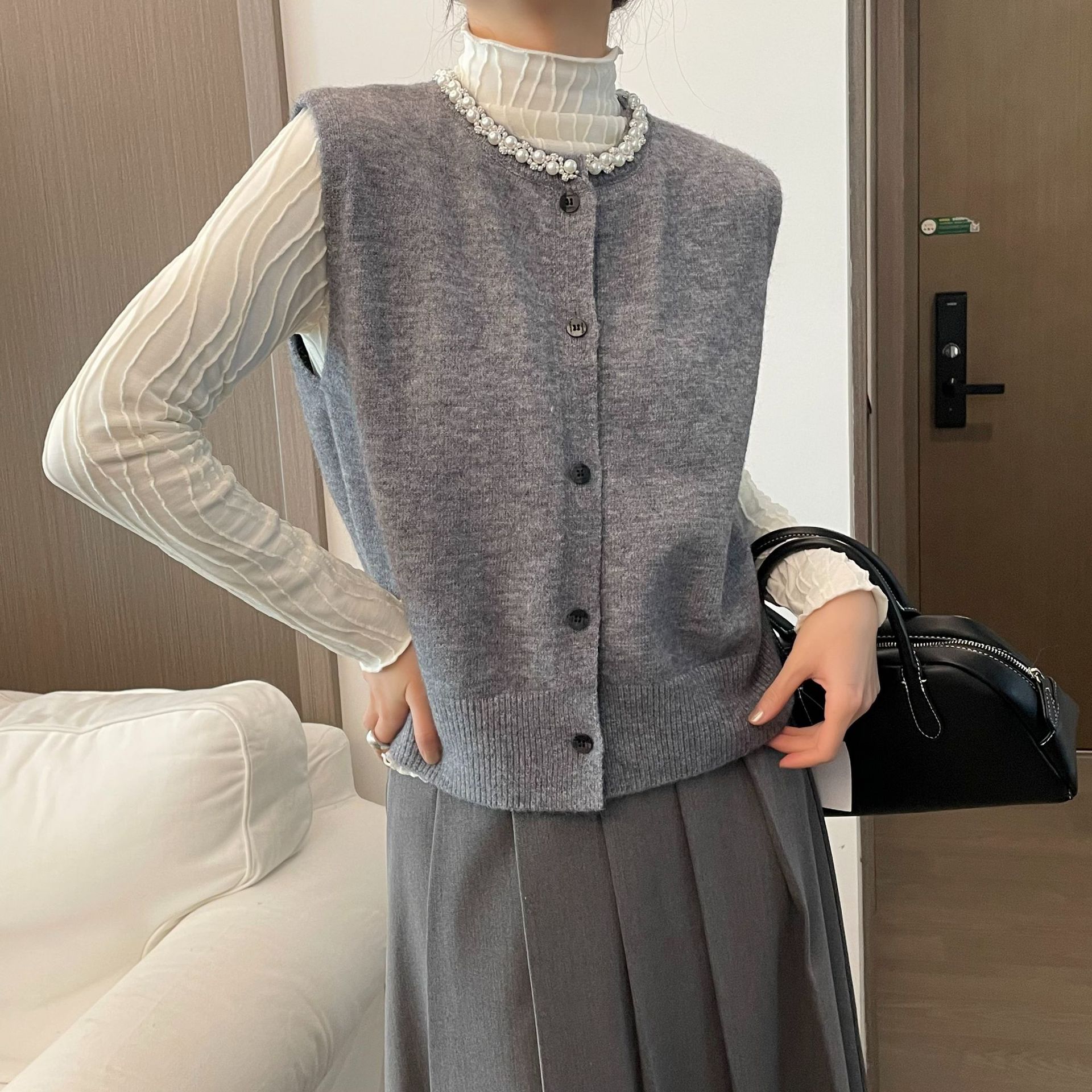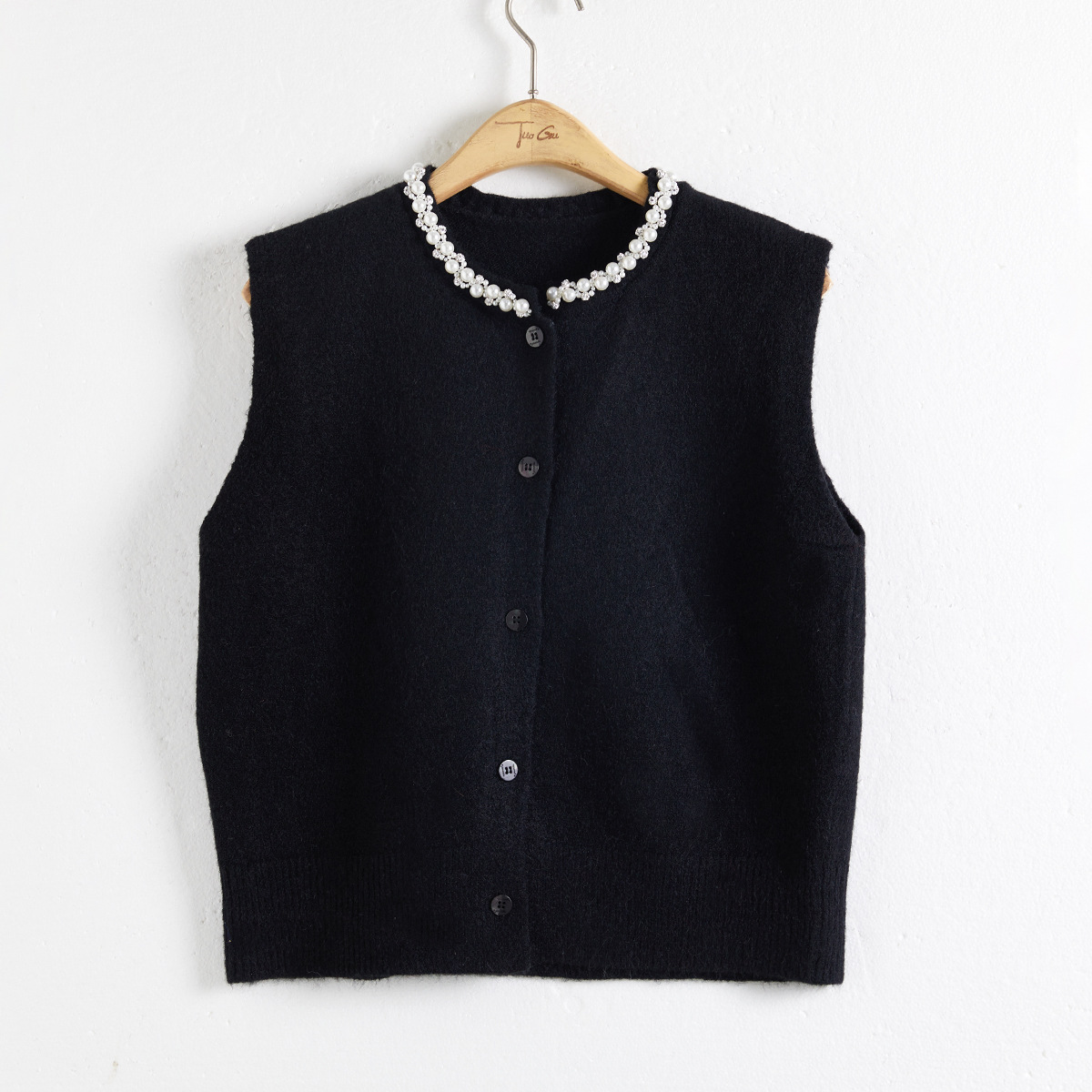 Lanzhi 의류 프렌치 라인스톤 니트 조끼 여성 2025 년 봄 새로운 쌓인 외부 스웨터 코트 250043