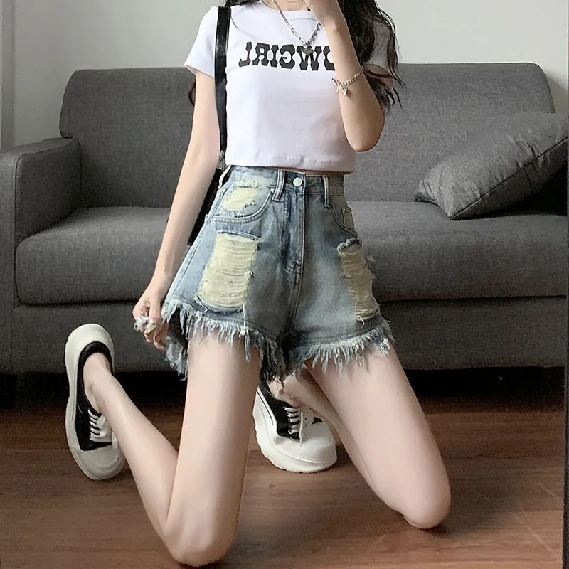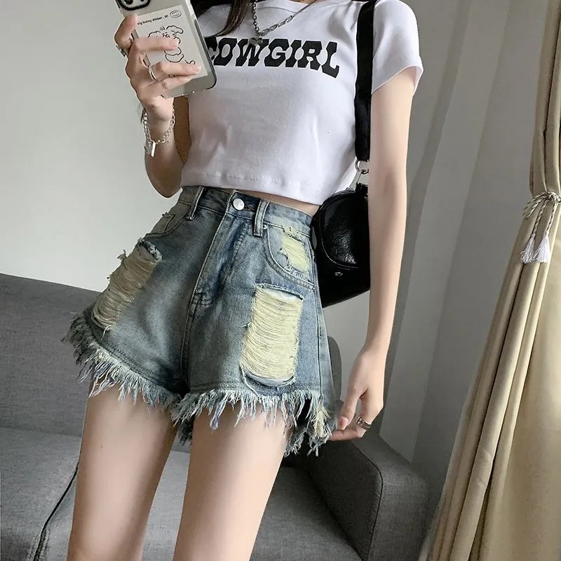 독특한 향수 데님 반바지 여성의 봄과 여름 새로운 느슨한 슬리밍 높은 허리 데님 핫 바지 유행