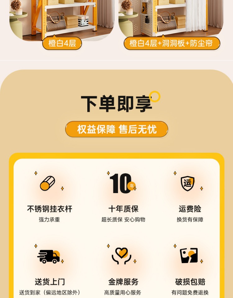 • 주황색과 흰색 3단 - 길이 105, 깊이 40, 높이 178cm [천공판 + 방진커튼 + 옷걸이봉 포함]