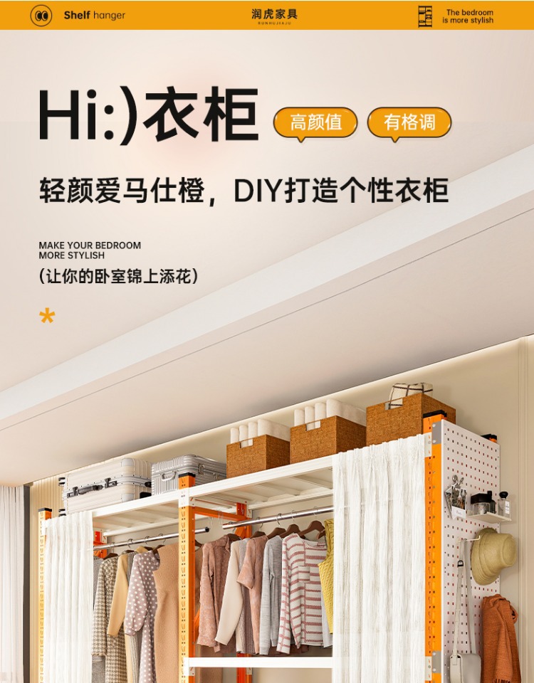 • 주황색과 흰색 3단 - 길이 150cm, 깊이 40cm, 높이 200cm [천공판+방진커튼+옷걸이봉 포함]