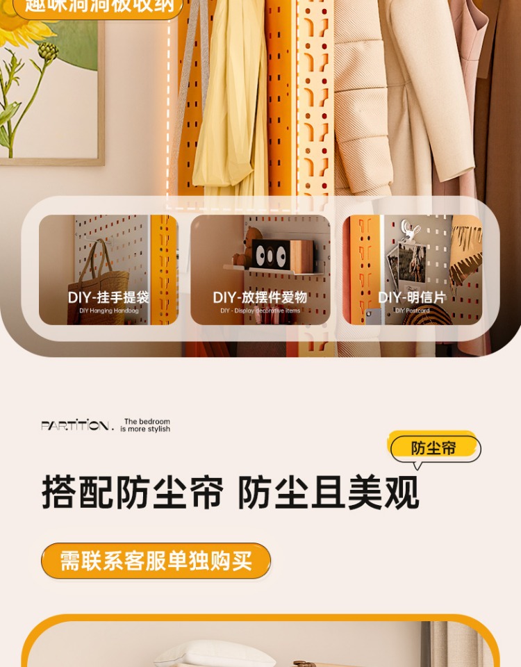 • 주황색과 흰색 3겹 - 길이 180cm, 깊이 40cm, 높이 200cm [천공판 + 방진커튼 + 옷걸이봉 포함]