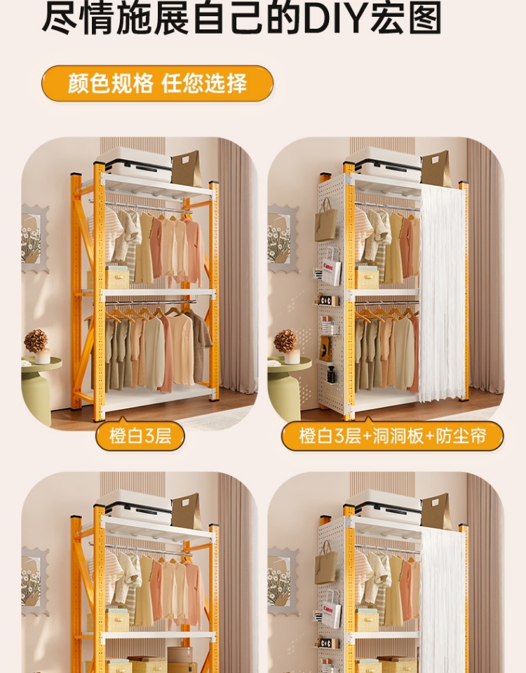 • 주황색과 흰색 3단 - 길이 150cm, 깊이 50cm, 높이 178cm [천공판+방진커튼+옷걸이봉 포함]